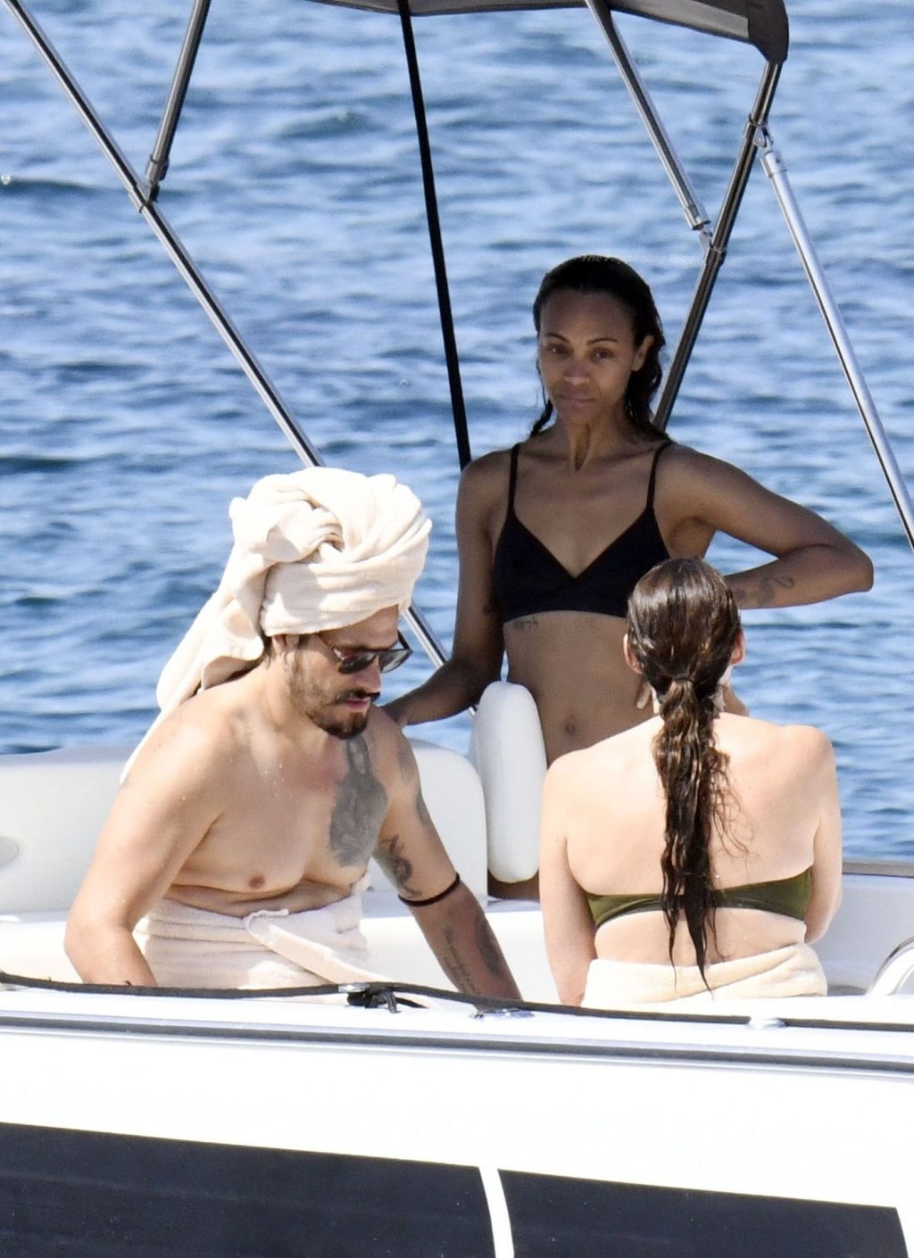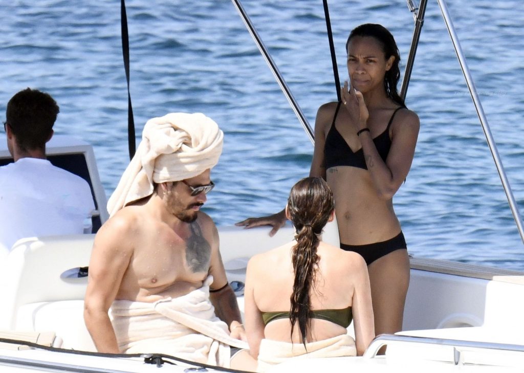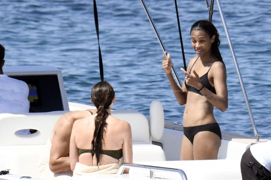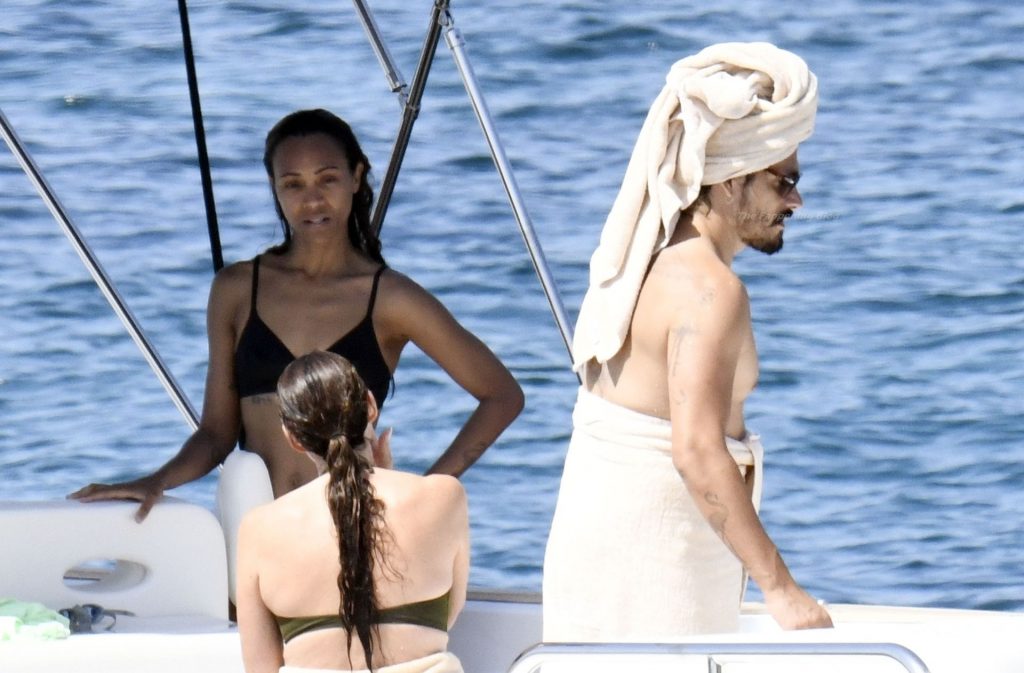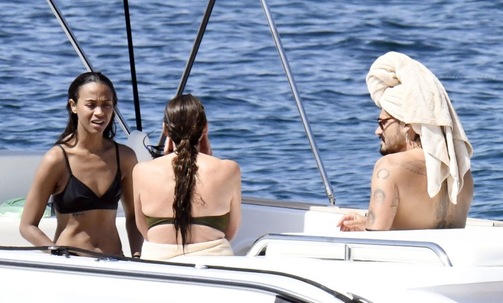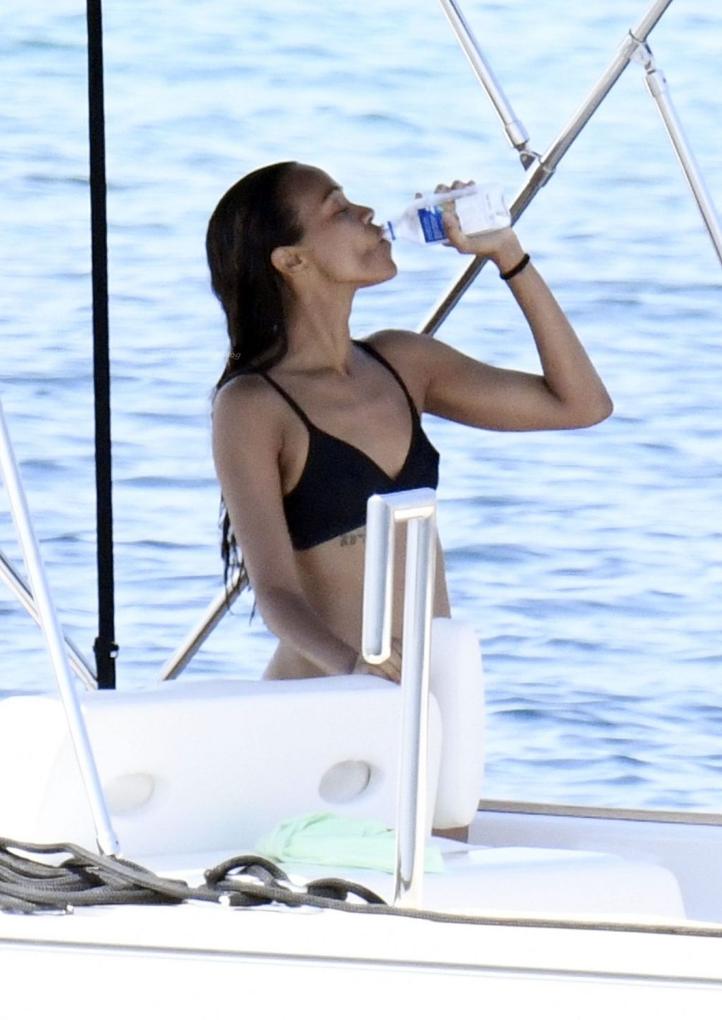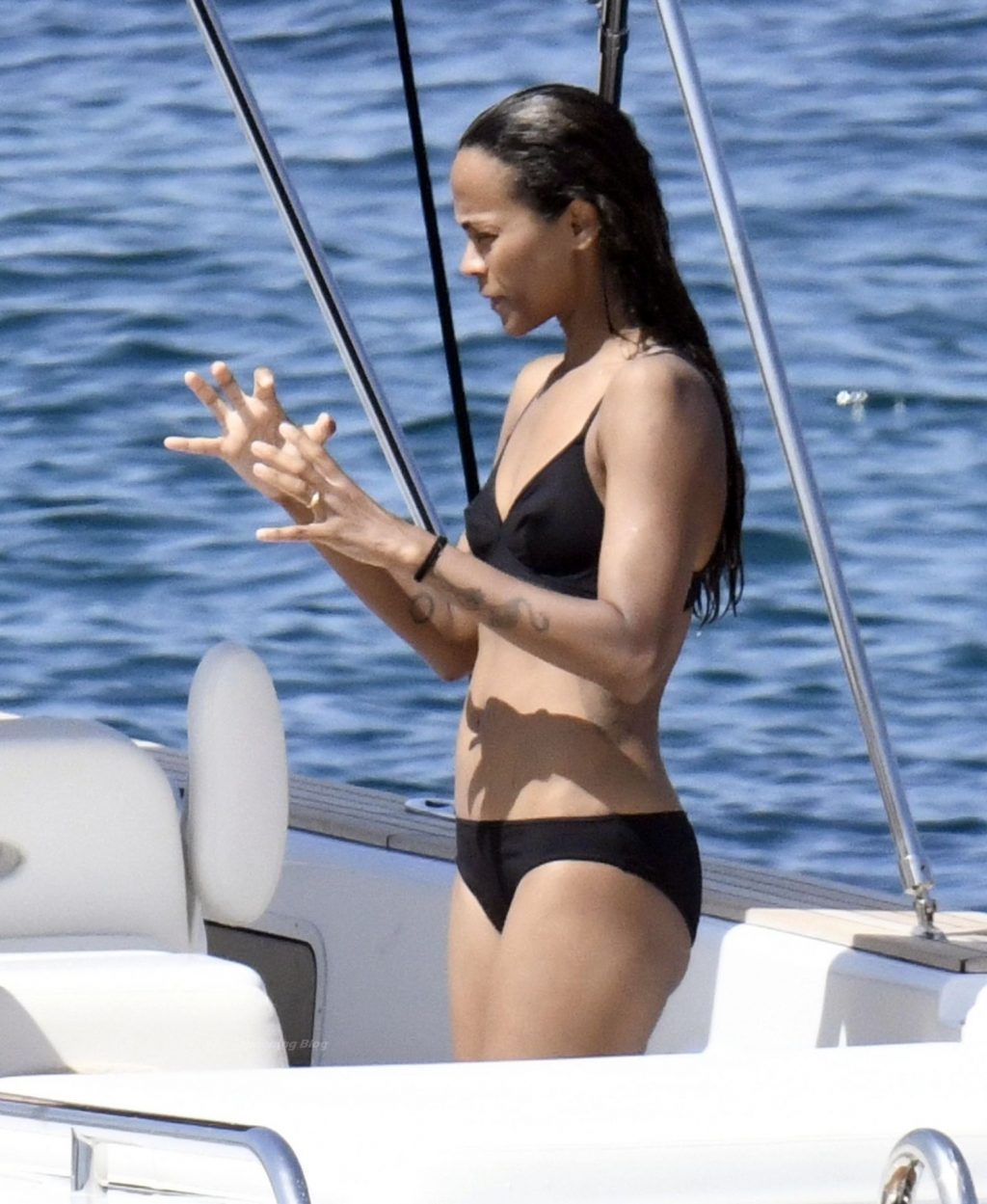 La sexy actriz estadounidense Zoe Saldana se quita la parte superior bajo el intenso sol italiano durante sus vacaciones bañadas por el sol en Cerdeña, 15/08/2021.