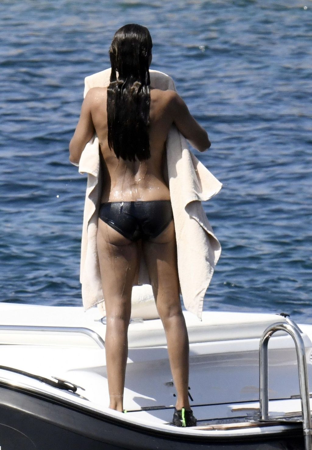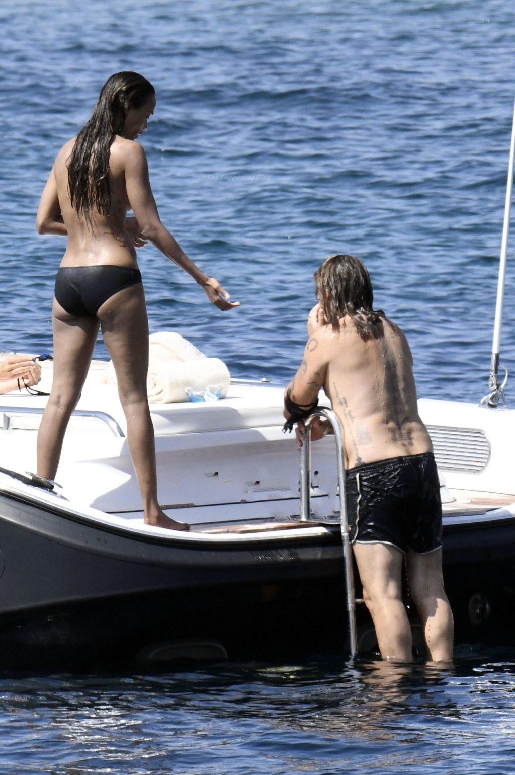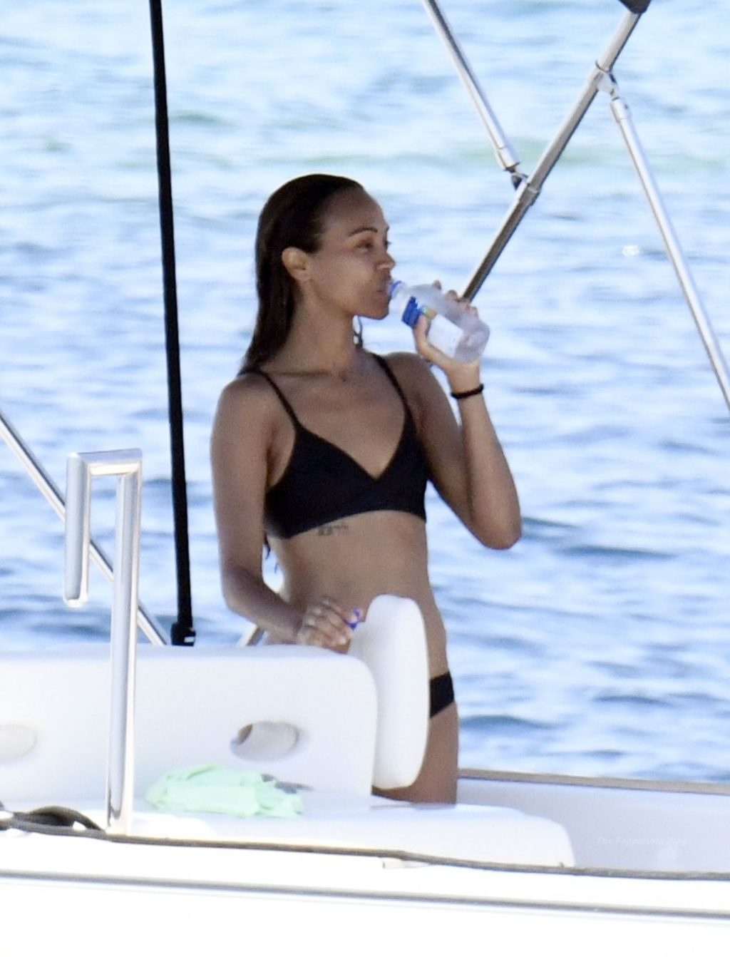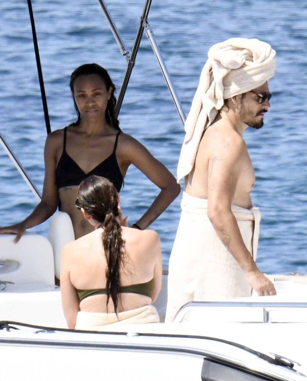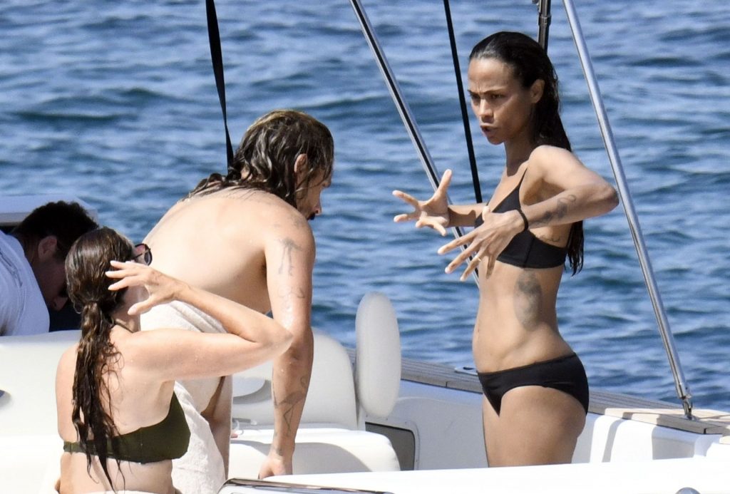 La sexy actriz estadounidense Zoe Saldana se quita la parte superior bajo el intenso sol italiano durante sus vacaciones bañadas por el sol en Cerdeña, 15/08/2021.