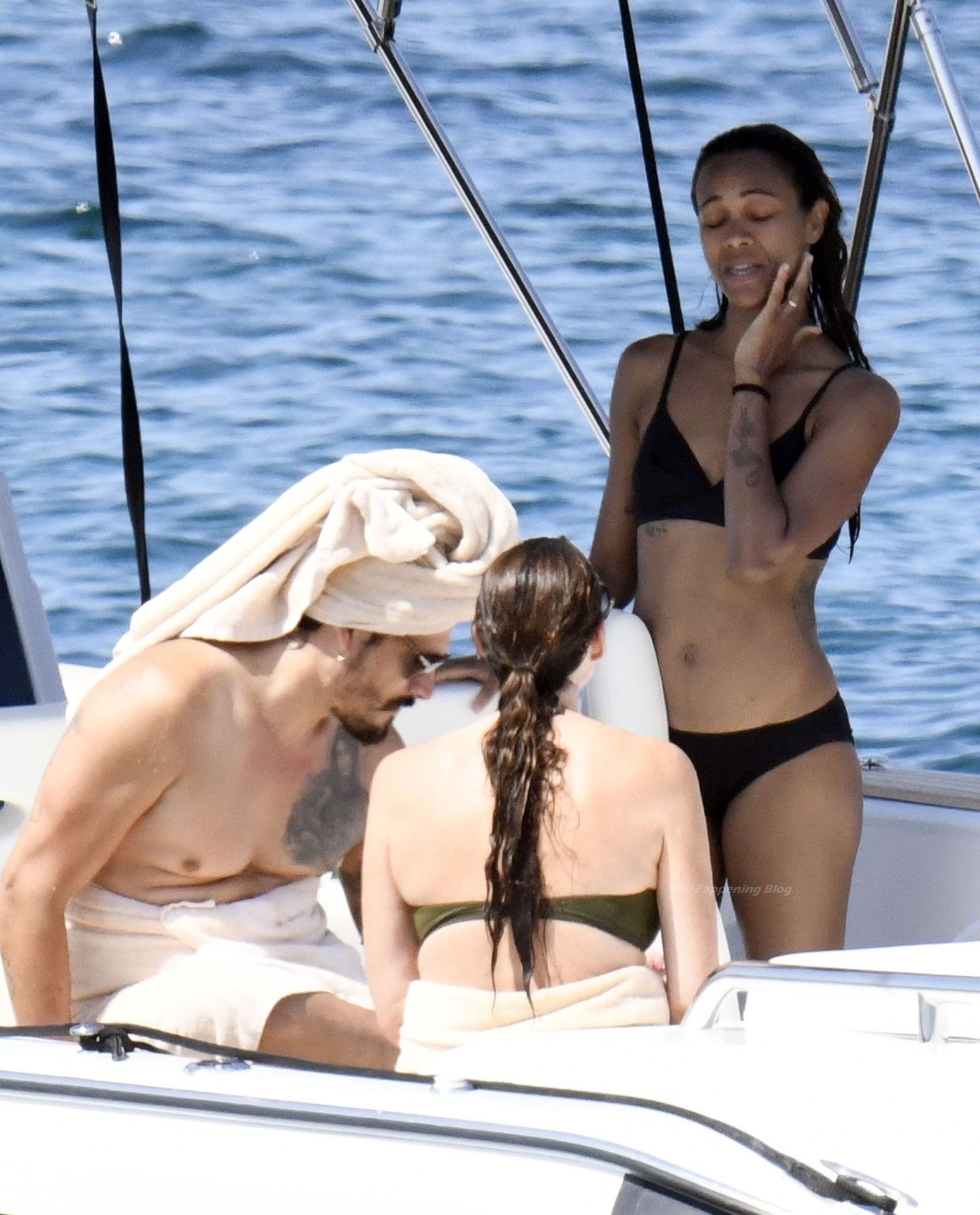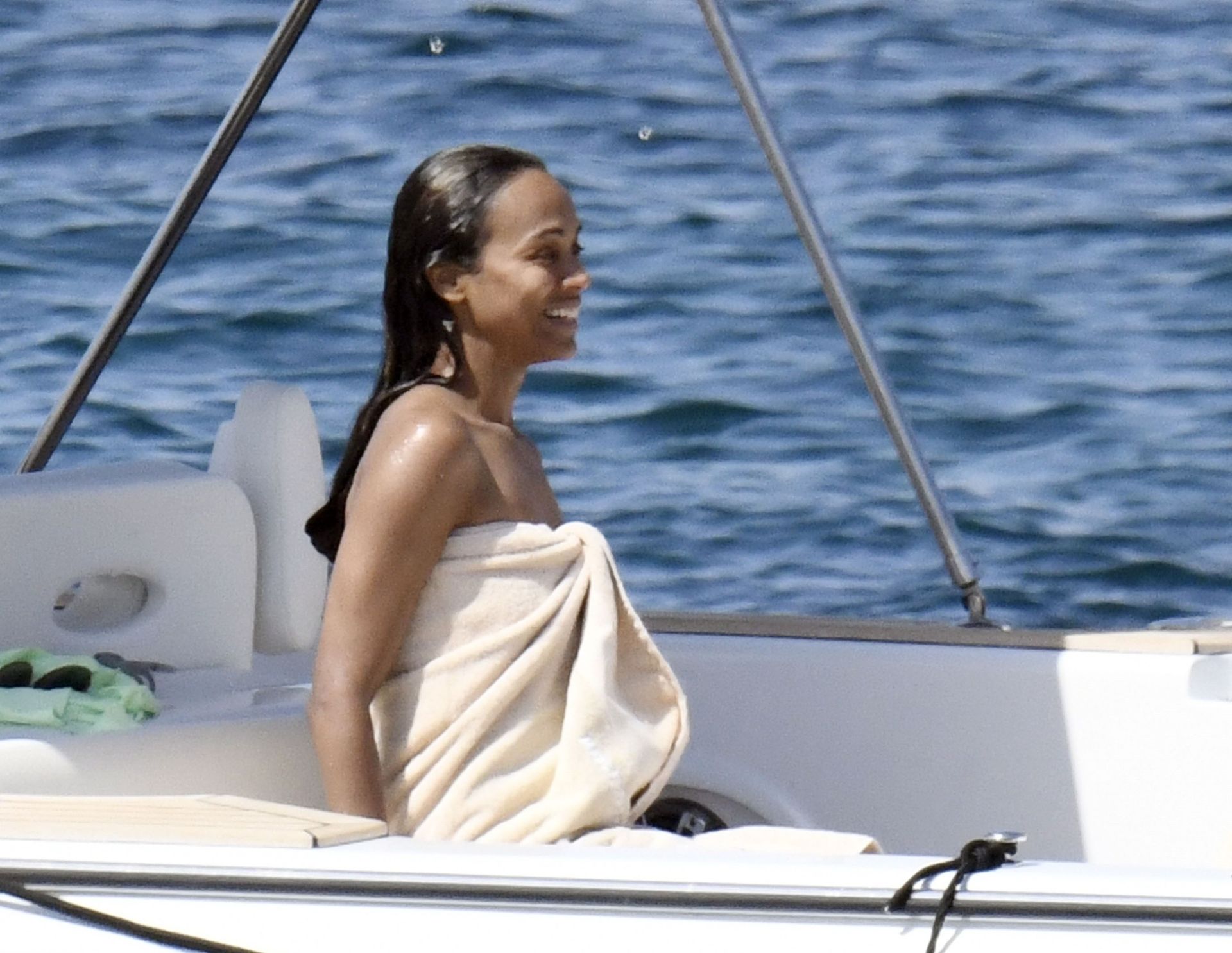 La sexy actriz estadounidense Zoe Saldana se quita la parte superior bajo el intenso sol italiano durante sus vacaciones bañadas por el sol en Cerdeña, 15/08/2021.