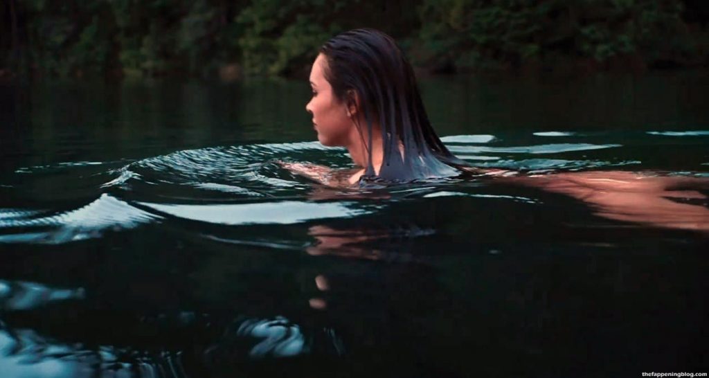 Megan Fox is nude in some lake as she swims around a glassy pool. Her naked buttocks are apparent through the water, but the ripples blur it as she swims. She then emerges onto a pier, nude, wringing out her clothes, but no nudity is seen. Megan is seen chatting on the phone following the swimming scene while wearing a low-cut top that exposes some good cleavage.