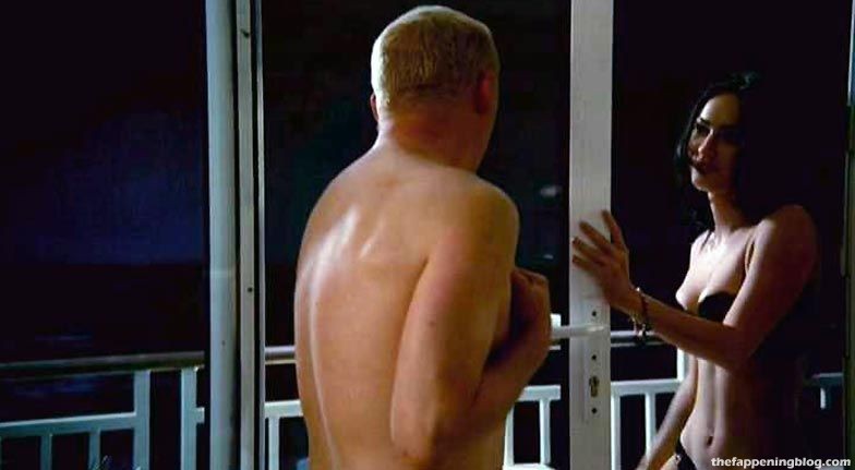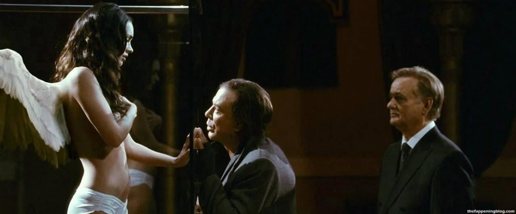 And now, the next scene that I had in mind showing you is from a movie called ‘Passion Play’. Megan Fox stands topless in a pair of tiny white briefs within a glass case, and her right arm crossed over her chest to partially cover her breasts. The package is approached by a man who looks inside at her before breaking it open and releasing her.