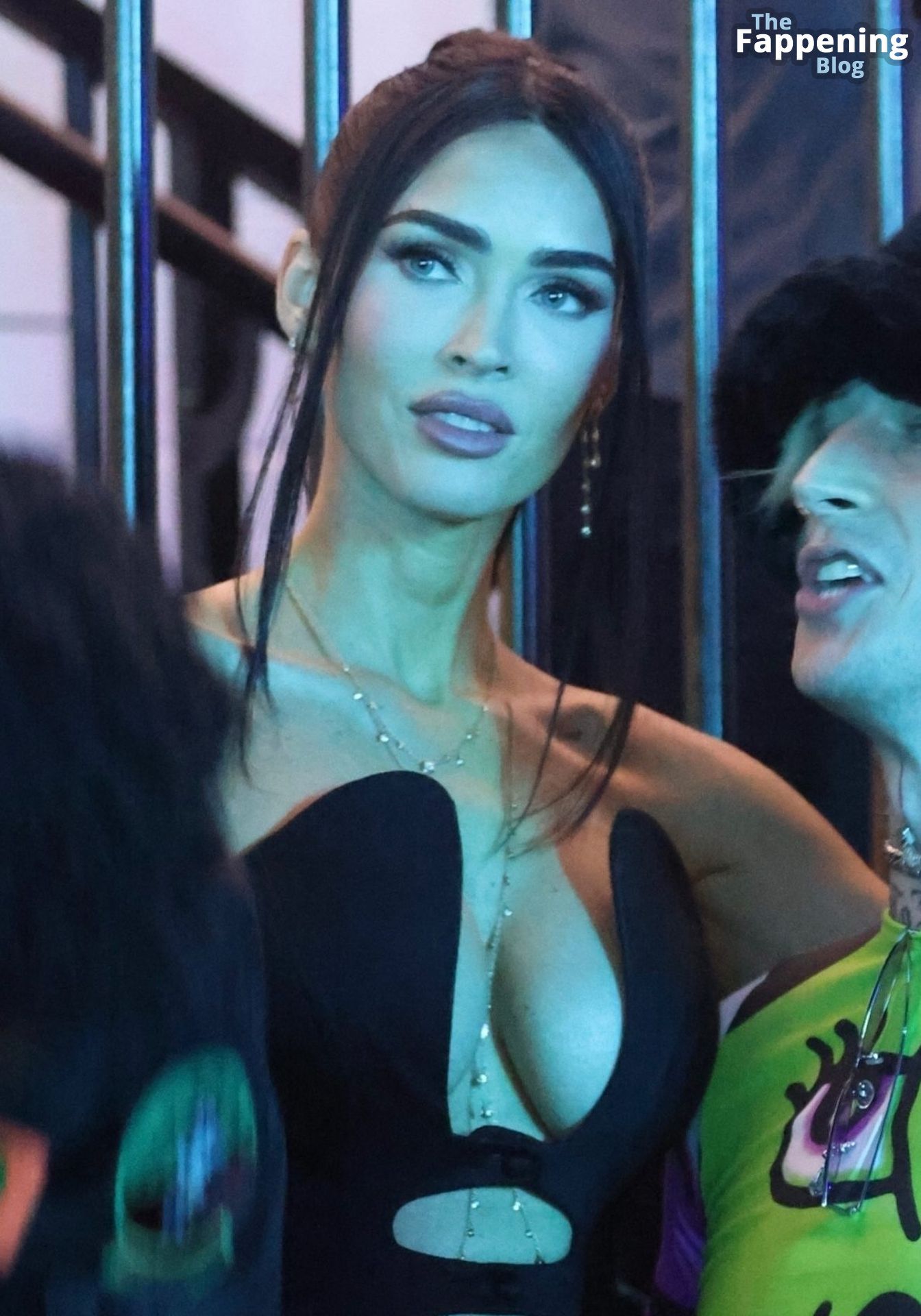 Megan Fox se ve en la fiesta del Super Bowl de Drake con un vestido negro escotado, mostrando su escote. El look sin sostén resalta su figura impresionante y su atractivo sexual.