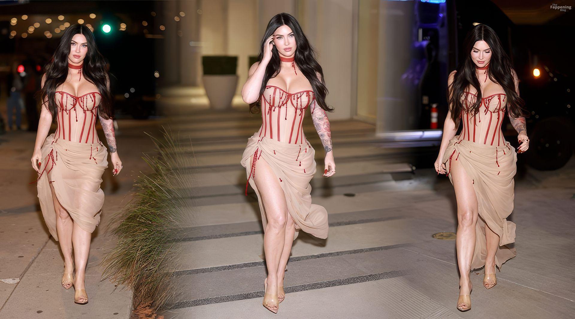 Megan Fox apareció en la proyección de “Jennifer’s Body” en Los Ángeles, luciendo un corsé transparente y una falda con una abertura alta.
