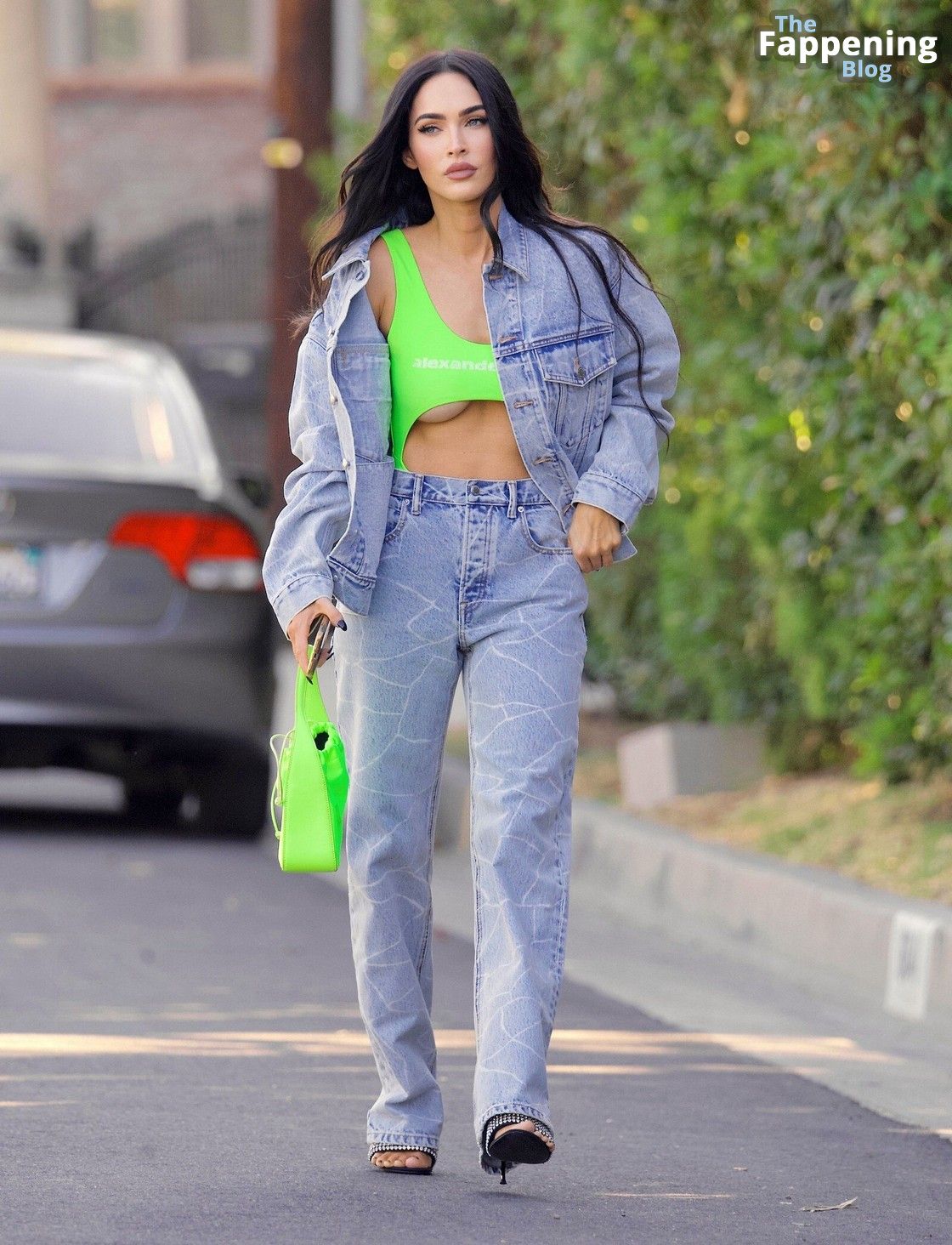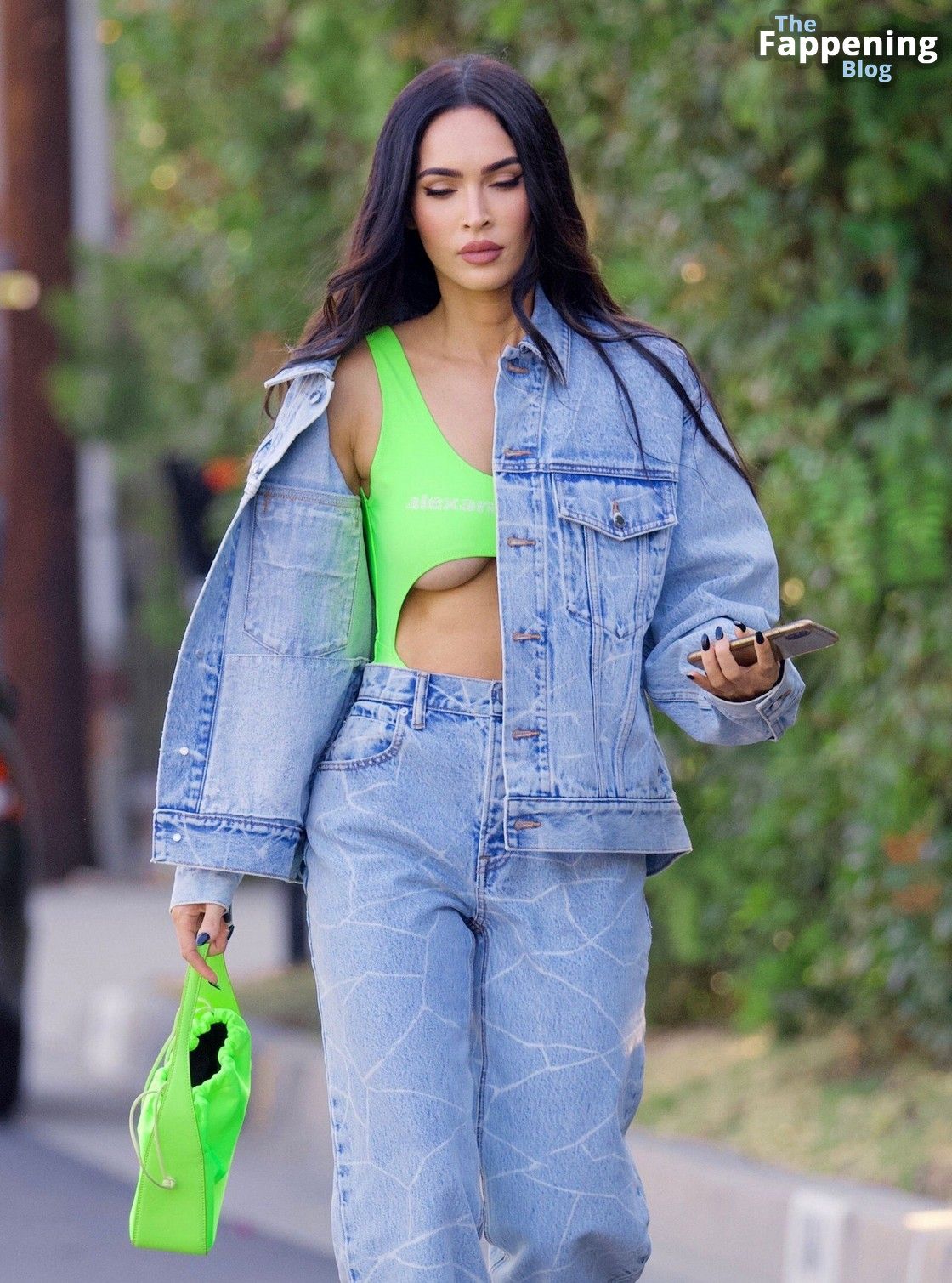 Este look no es solo sobre su vida personal, también es un gran cambio de estilistas. Este es un conjunto de otoño realmente sexy. Ese conjunto de mezclilla oversized de Alexander Wang, con la textura fría tipo mármol, es un verdadero imán de miradas. Pero honestamente, todos están mirando el traje de baño neón de Megan con su corte súper bajo—prácticamente muestra su escote. La figura de Megan es, como siempre, increíble.