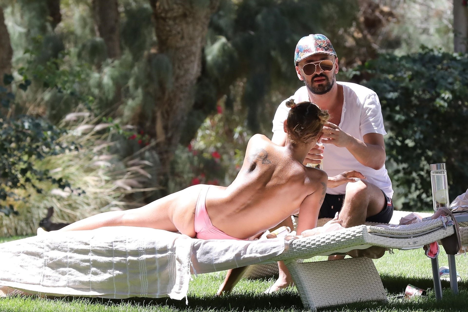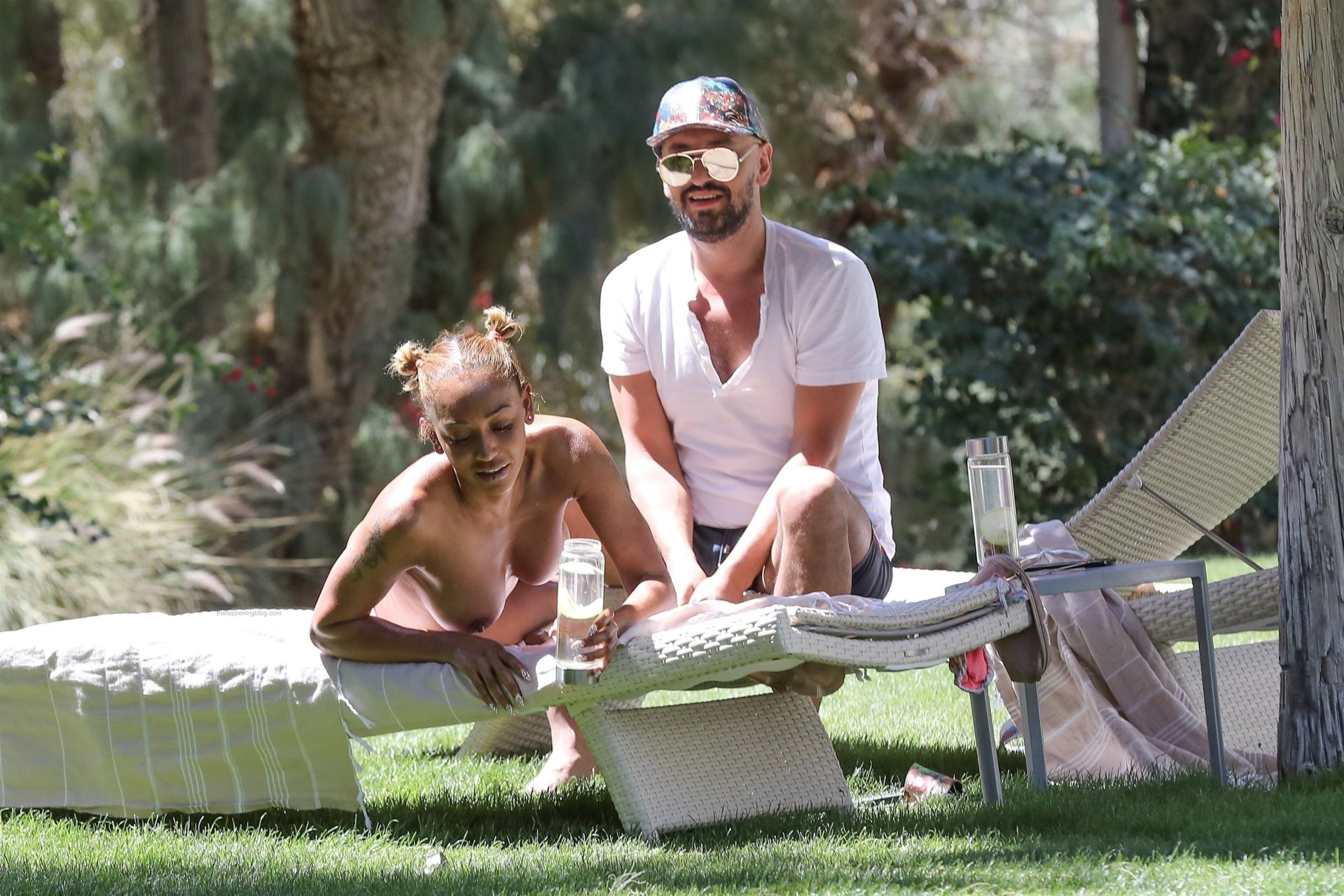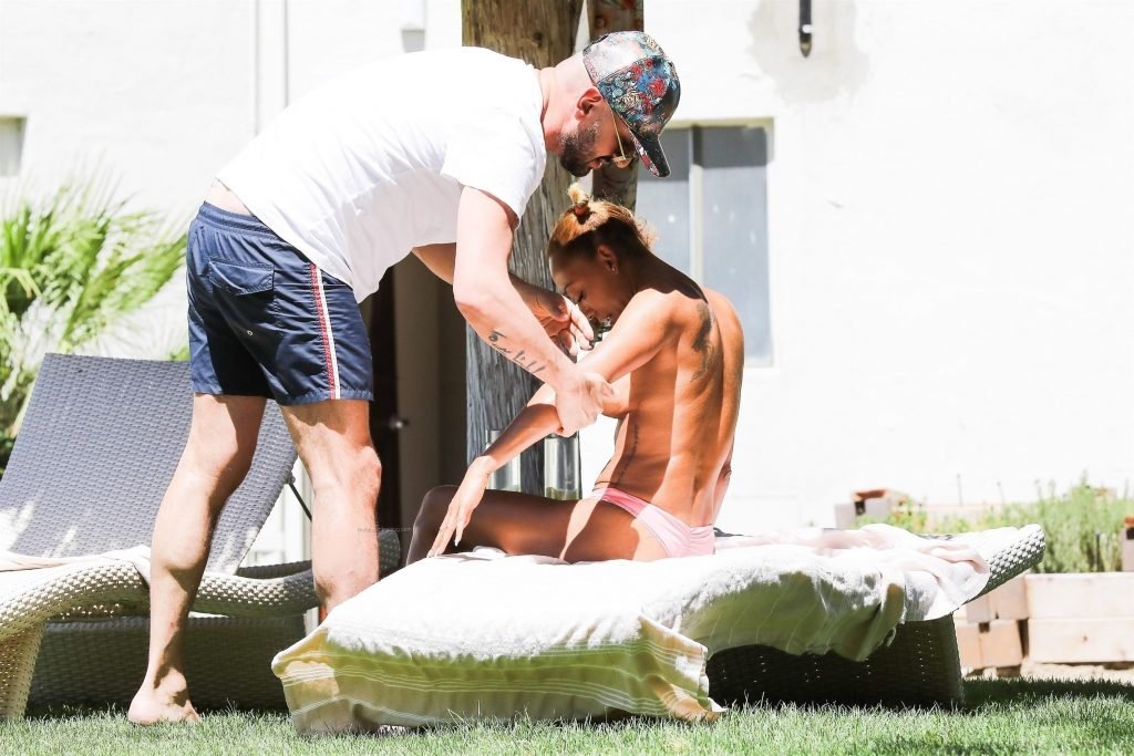 Mel B, 42, muestra sus grandes pechos falsos negros mientras disfruta de unas vacaciones con su nuevo novio Gary Madatyan en un resort de 5 estrellas en Desert Hot Springs, California, 19/04/2018. La Spice Girl mayor parecía estar pasándola bien mientras su amiga le aplicaba loción bronceadora por todo el cuerpo!
