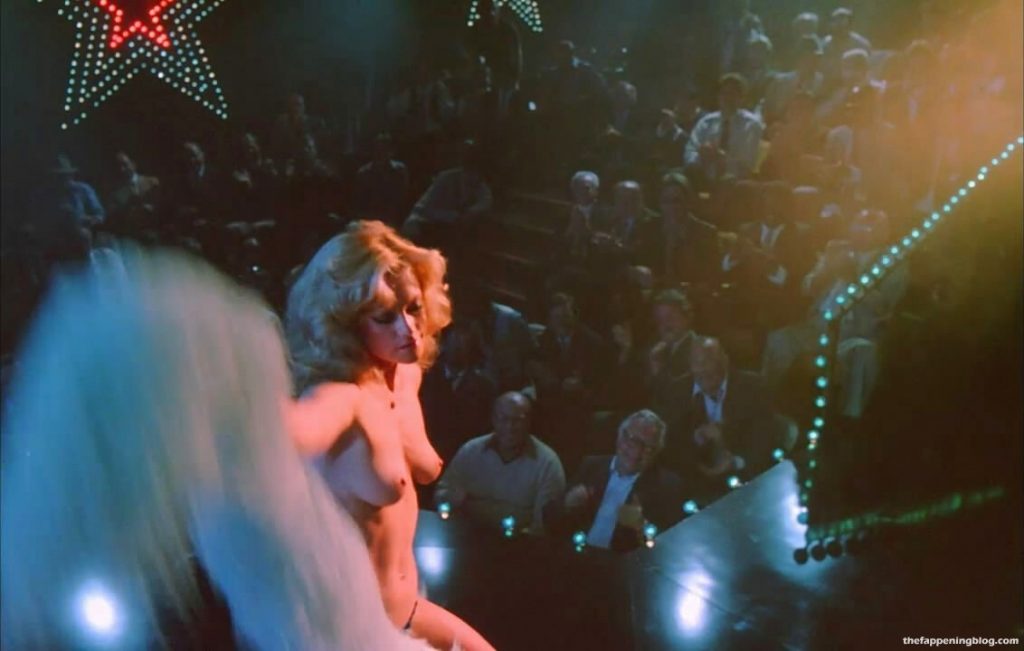 Melanie Griffith is unzipping out of a blue sequined dress during a dance routine and revealing her nice breasts and her ass in a thong underneath during a dance routine at a strip club.