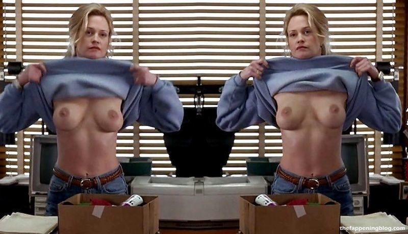 Melanie Griffith is lifting up her blue sweater quickly to flash her bare breasts while standing behind a desk.