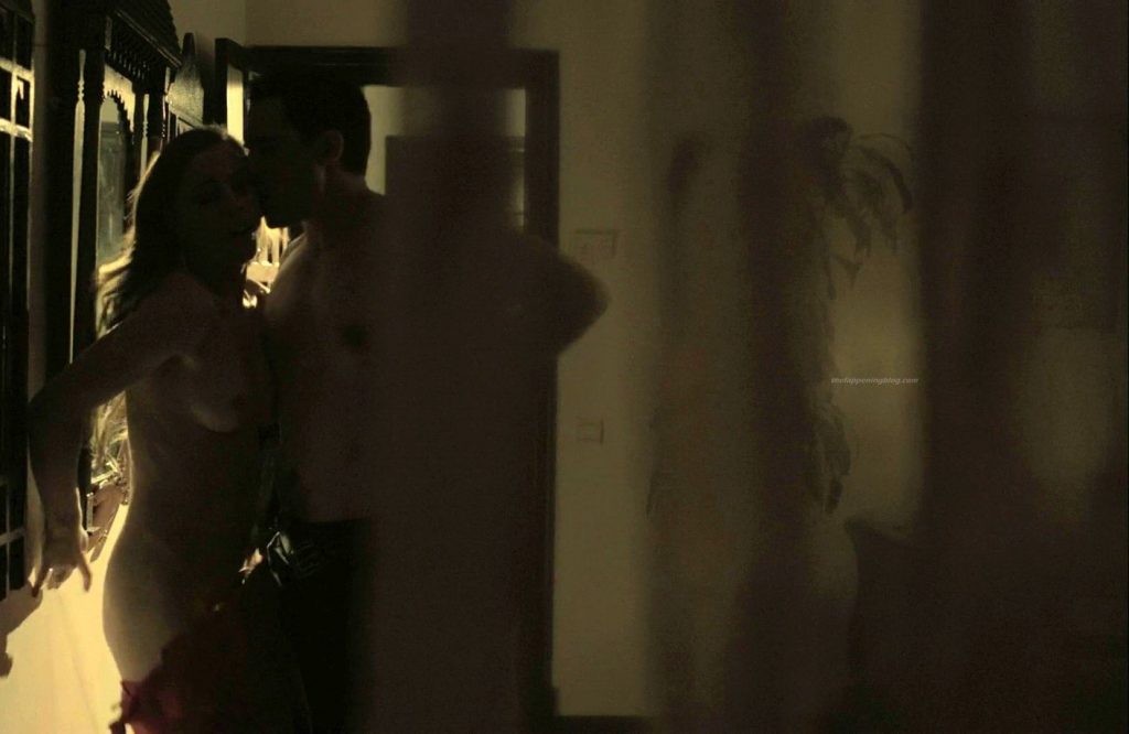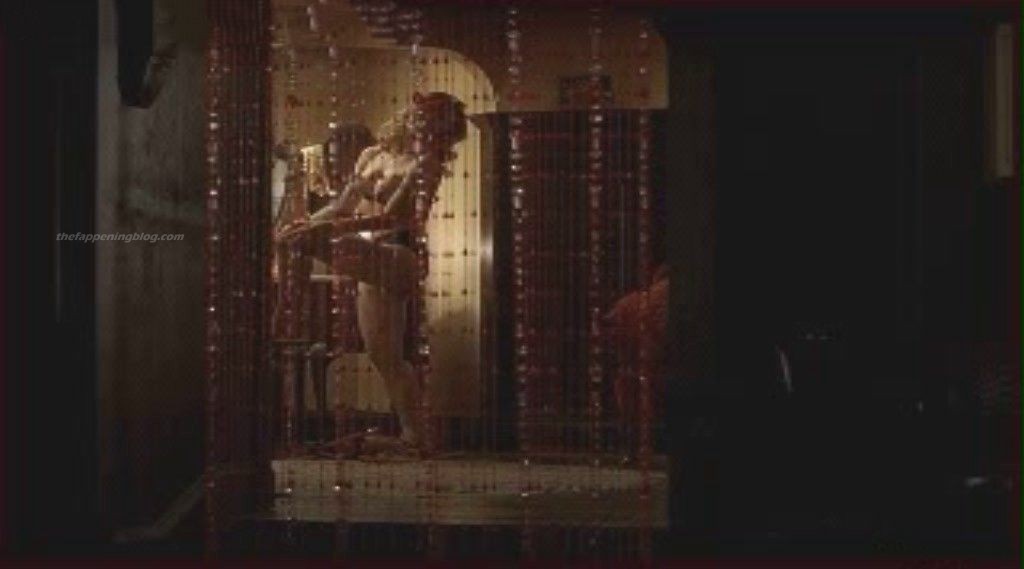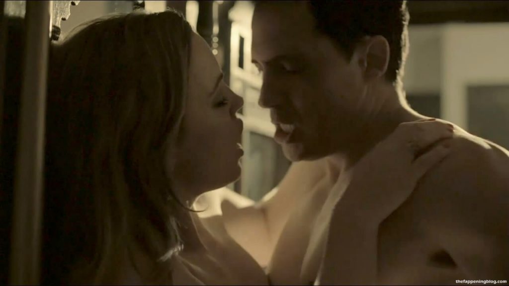 Melissa George is making out with a guy in a hallway as they undress each other, Melissa showing her bare butt and then her breasts as her dress falls to the ground and she has sex with the guy against the wall.