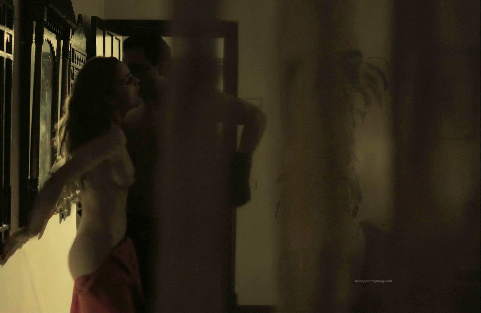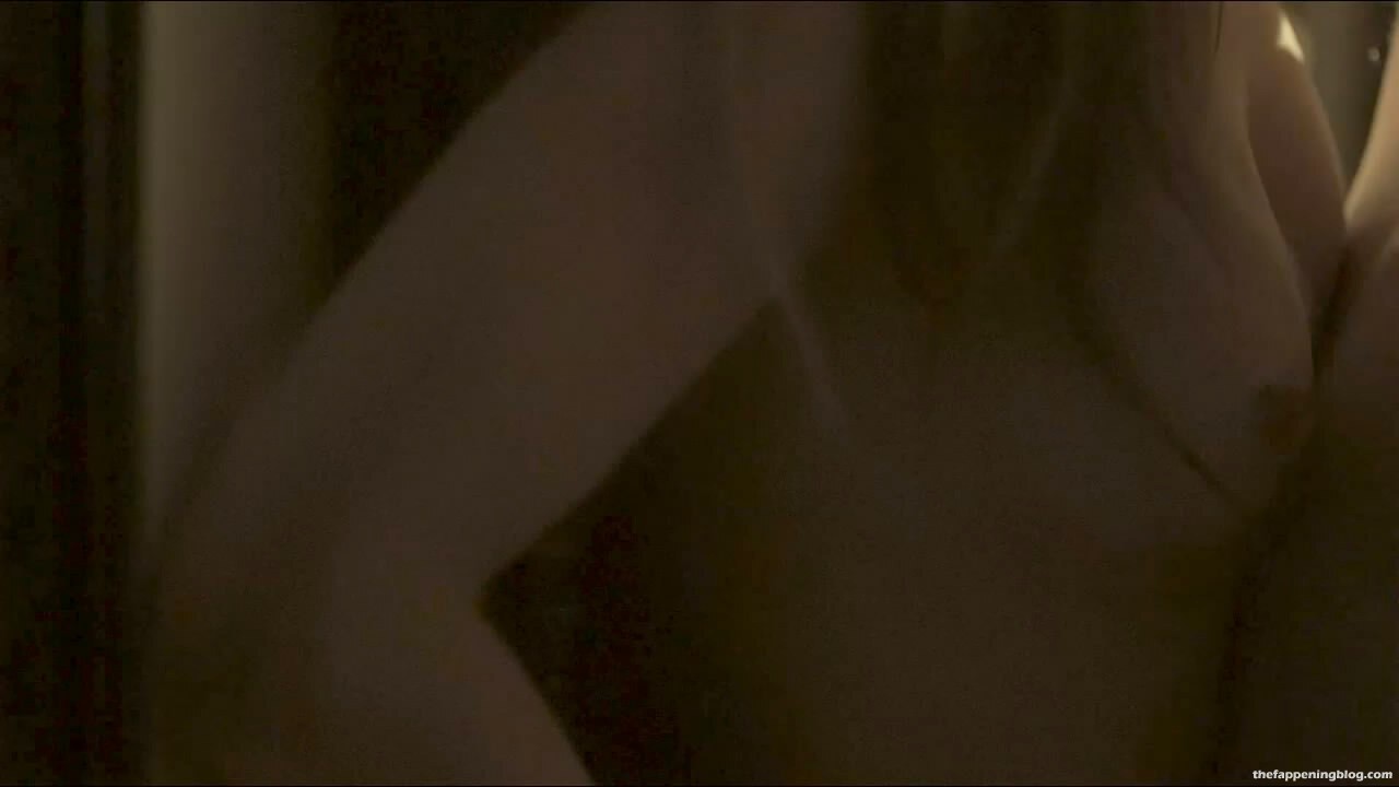 Melissa George is making out with a guy in a hallway as they undress each other, Melissa showing her bare butt and then her breasts as her dress falls to the ground and she has sex with the guy against the wall.