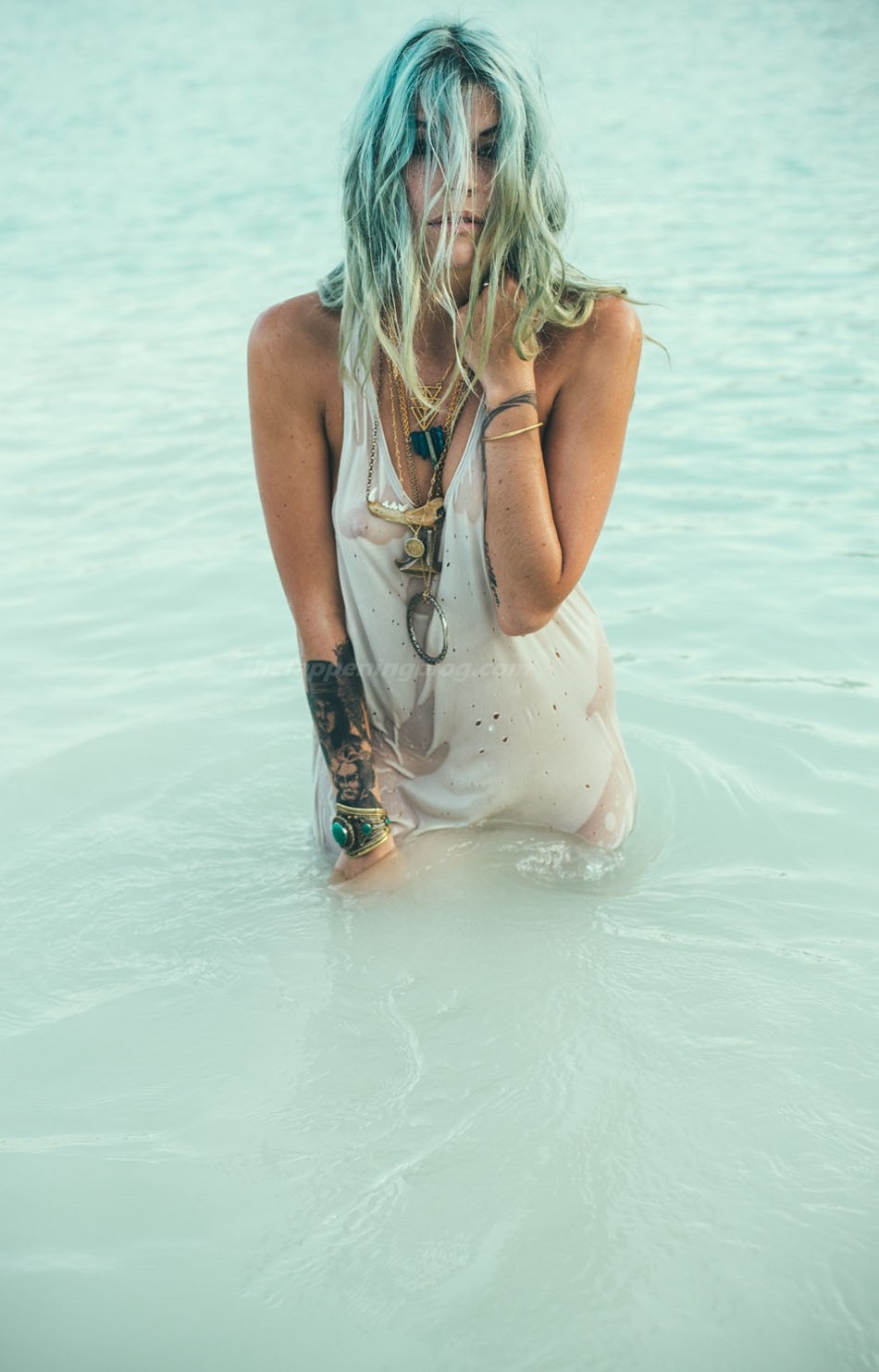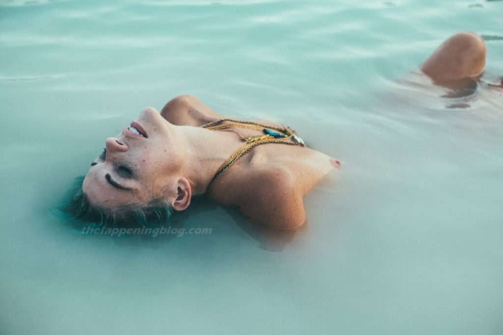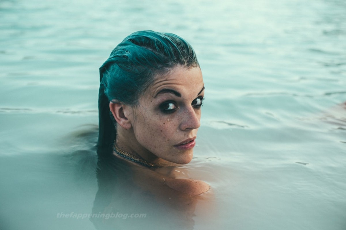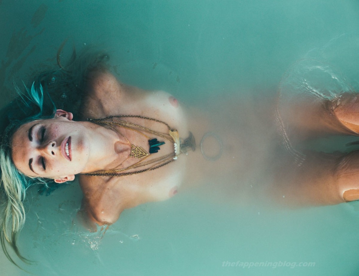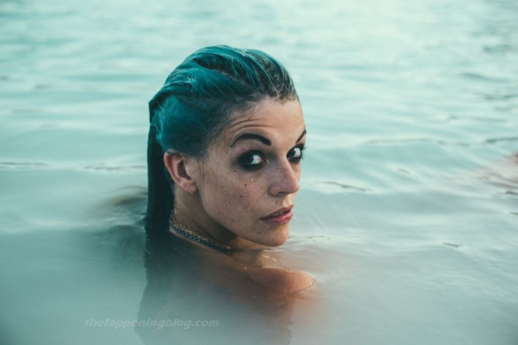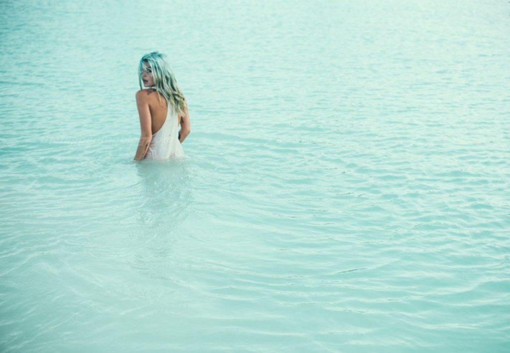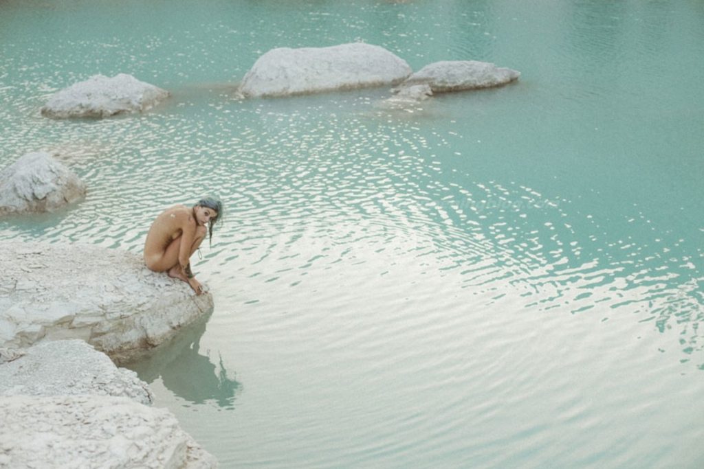 Modelo freelance tatuada, estilista y fotógrafa Melodi Meadows se da un baño desnuda en un lugar hermoso de Texas con aguas cian en una sesión fotográfica de Asher Moss (2014).