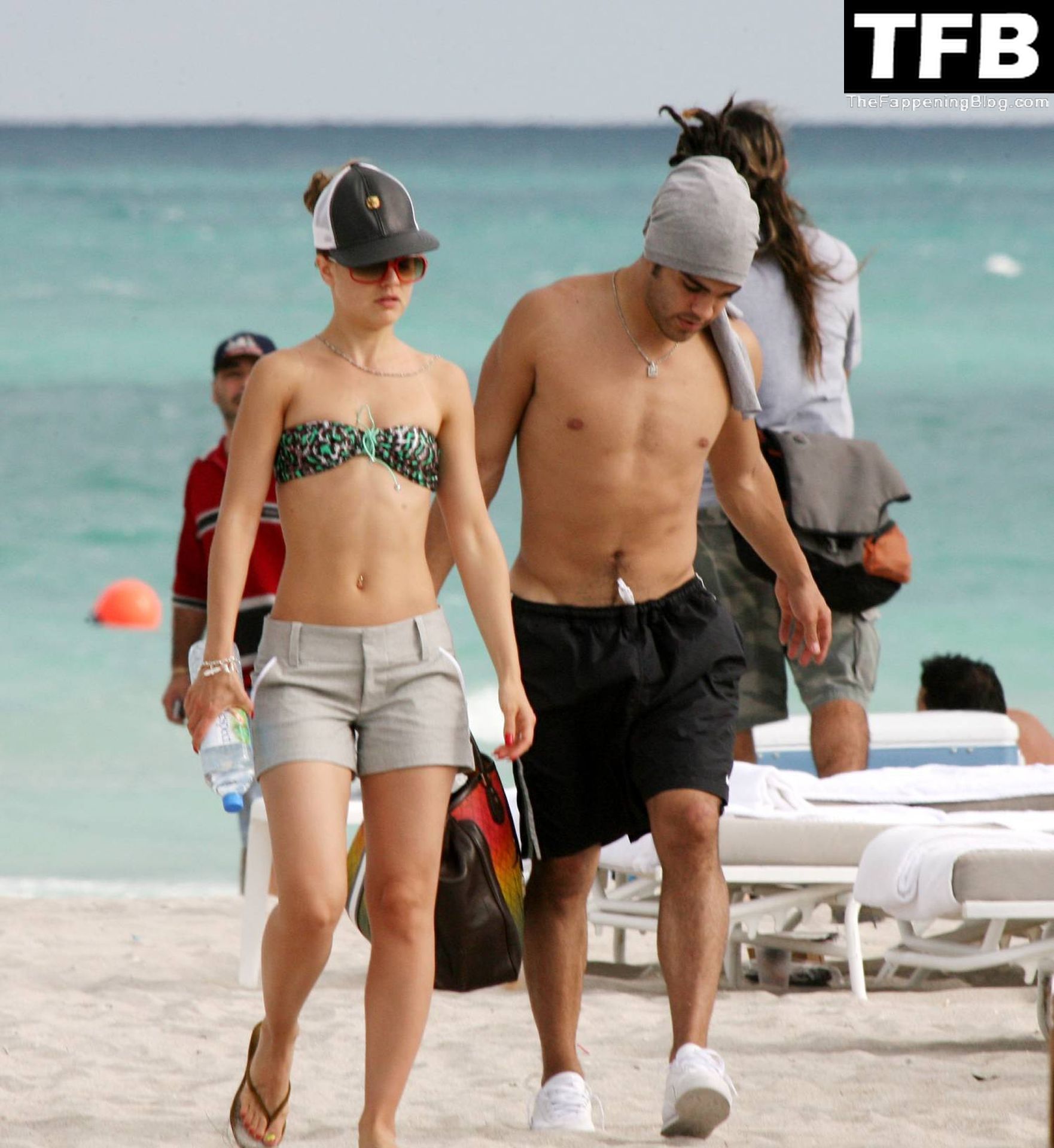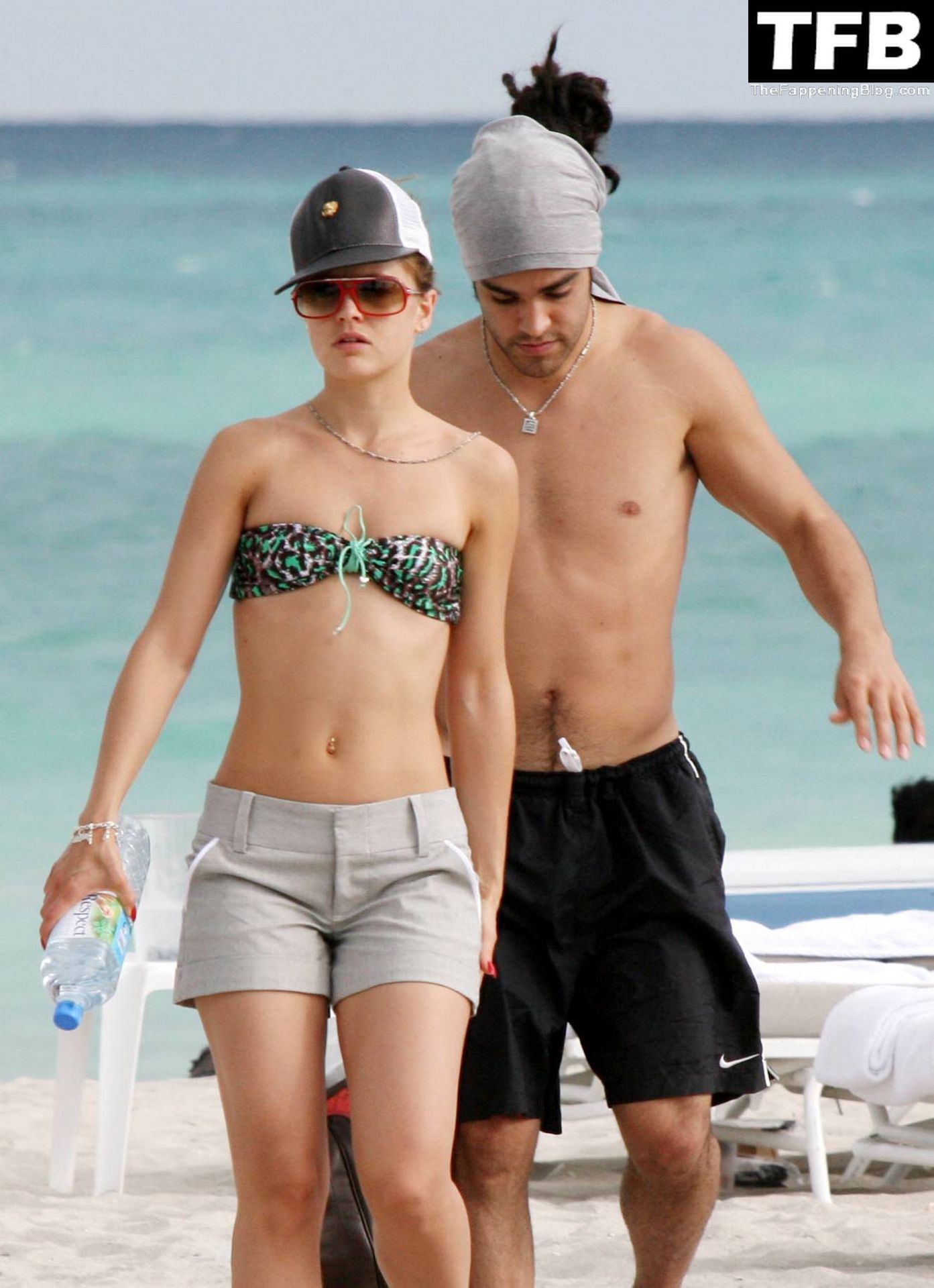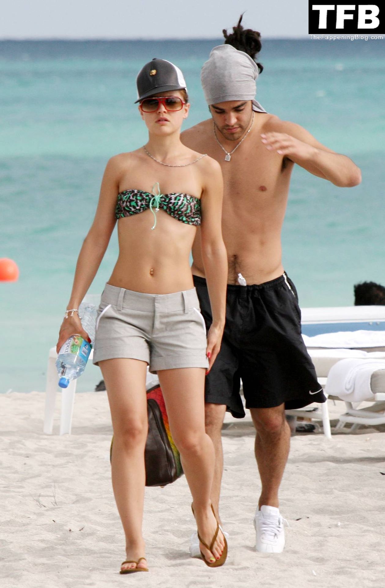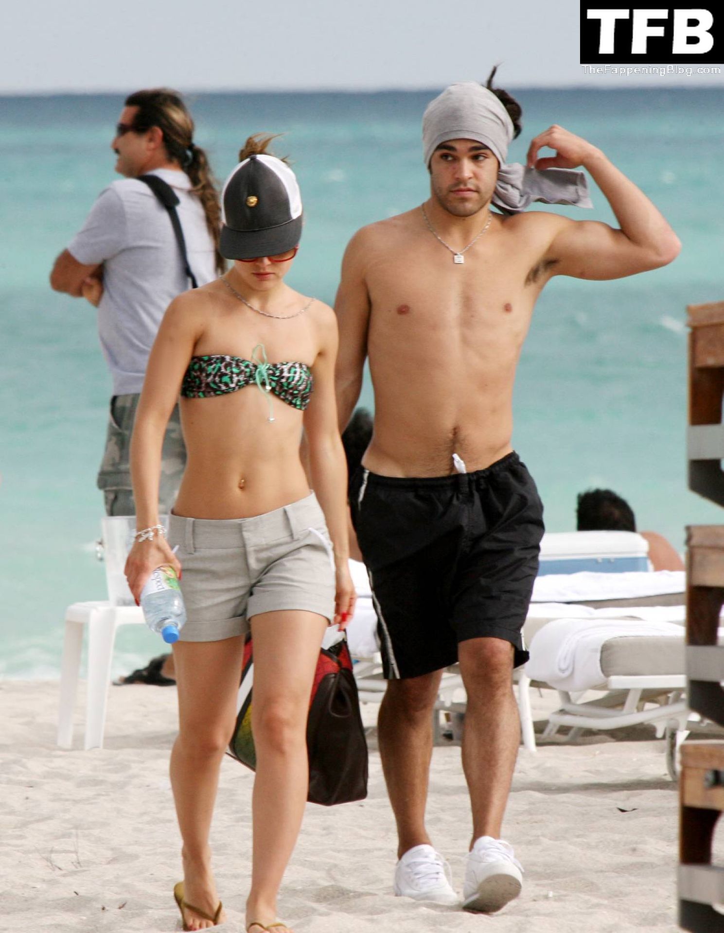 La actriz estadounidense Mena Suvari disfruta sin camiseta del clima cálido en Miami Beach con su novio Mike “Murda” Carrasco, 20/01/2007.