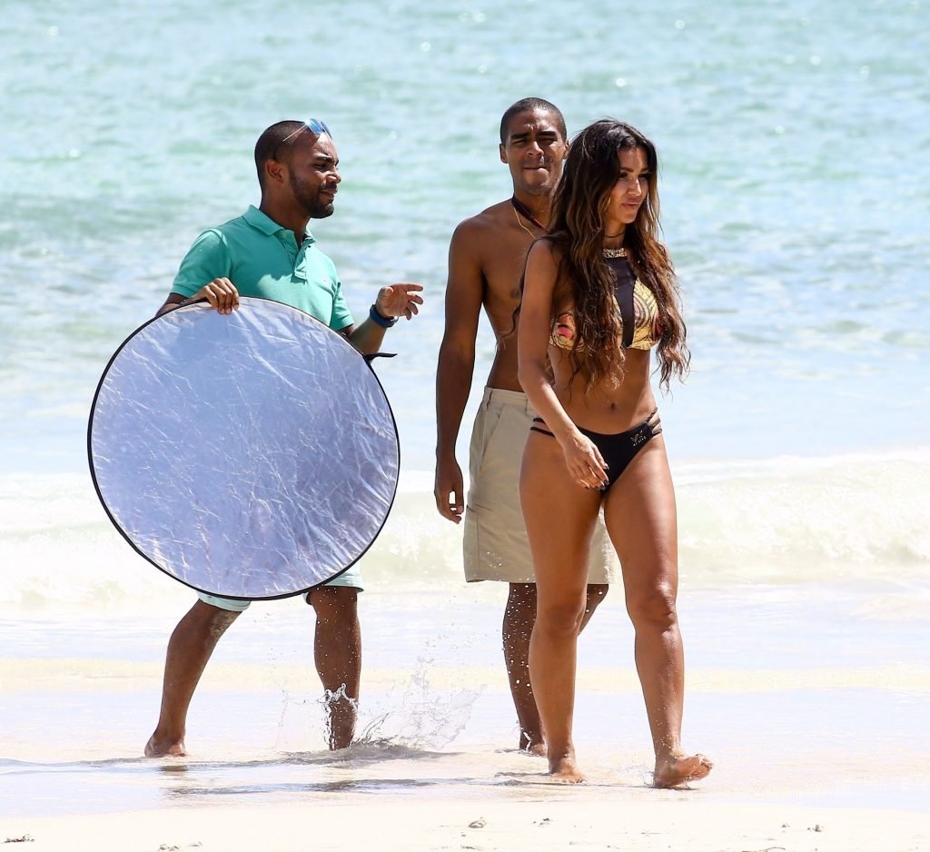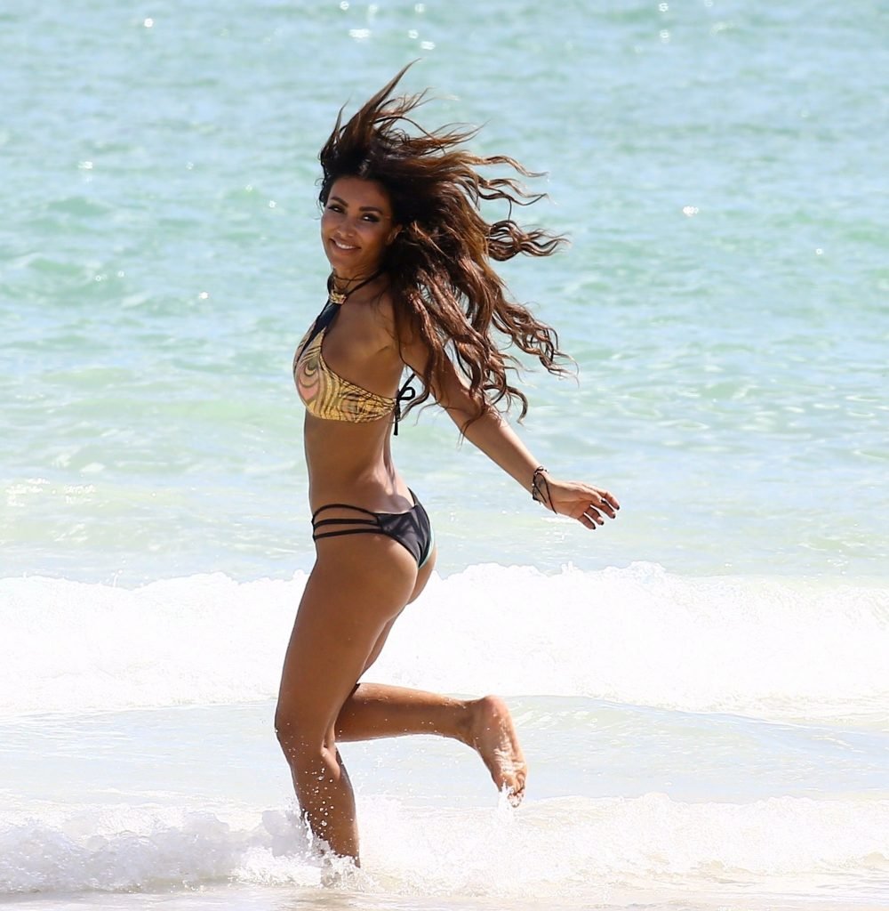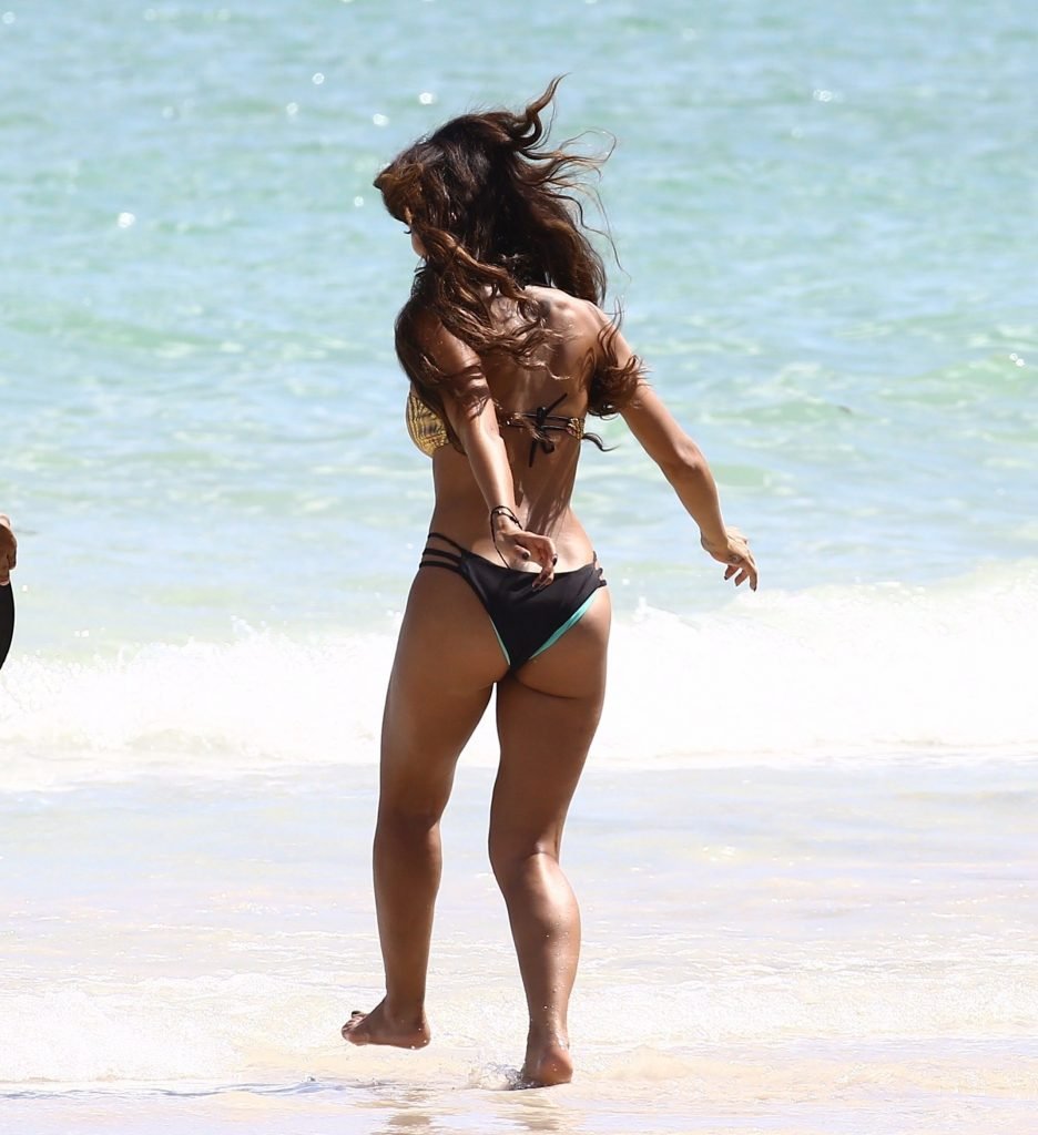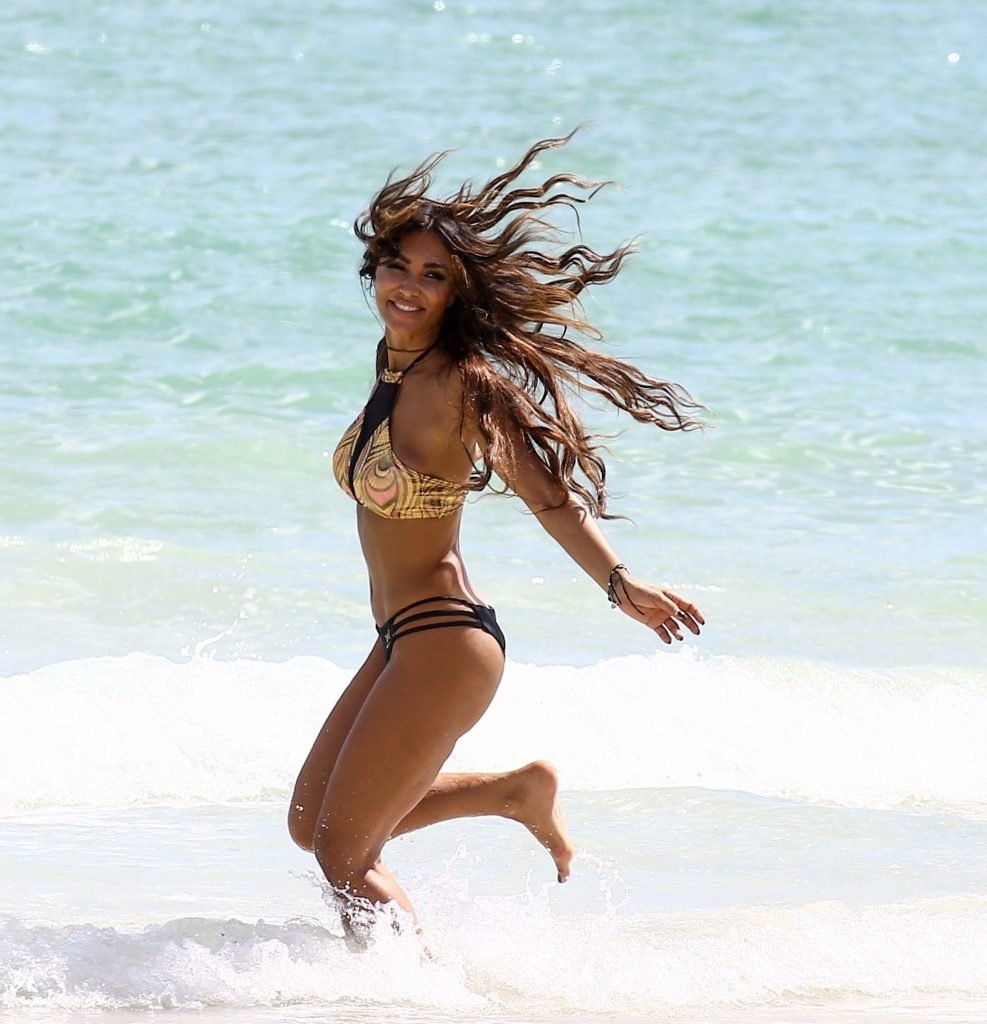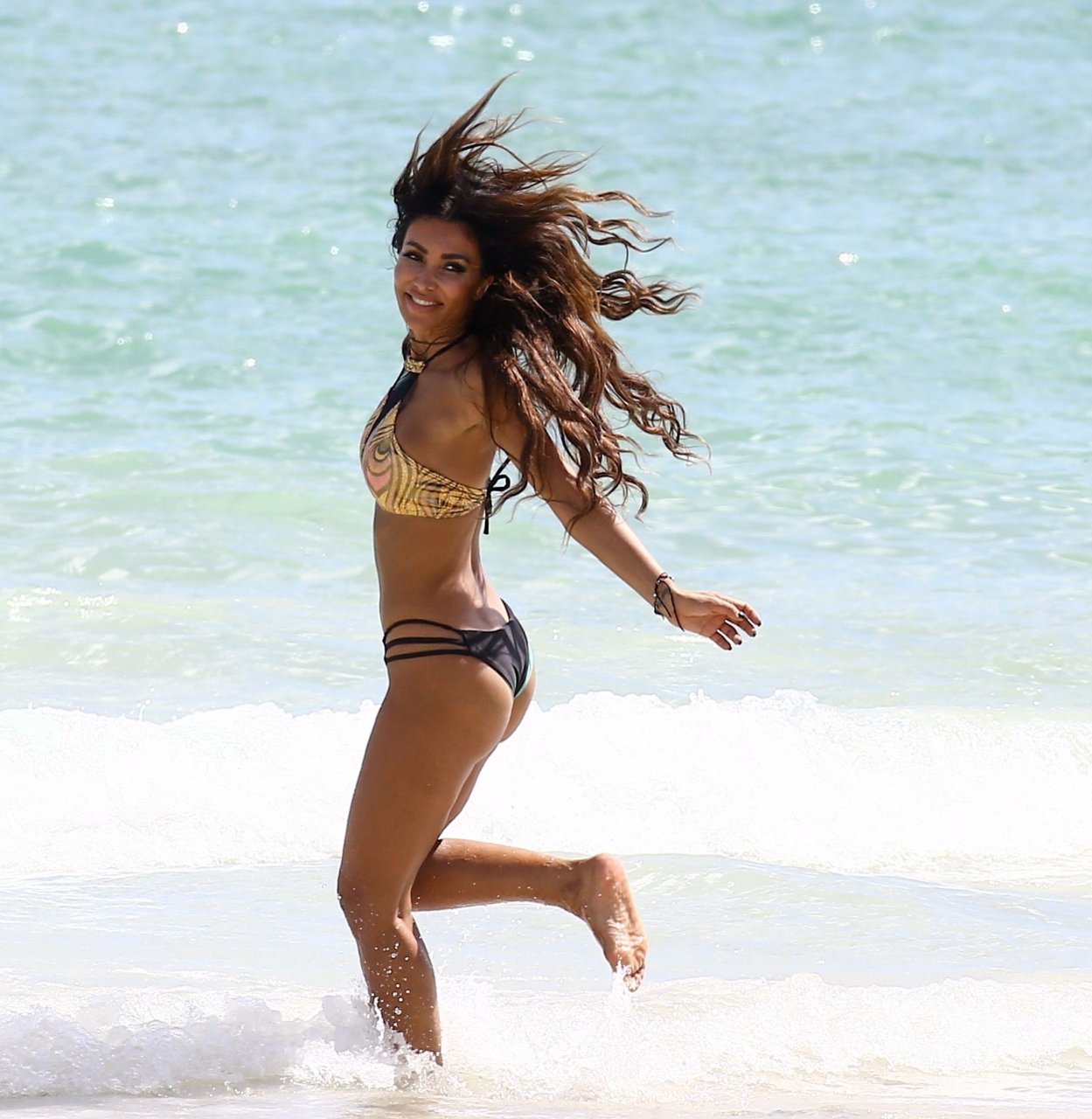 Metisha Schaefer muestra su cuerpo en bikini con un bikini negro y dorado mientras realiza una sesión de fotos en Miami Beach, 16/10/2017. Metisha Schaefer es una modelo, escritora y actriz alemana. Edad: 32 años (nacida el 3 de marzo de 1985).