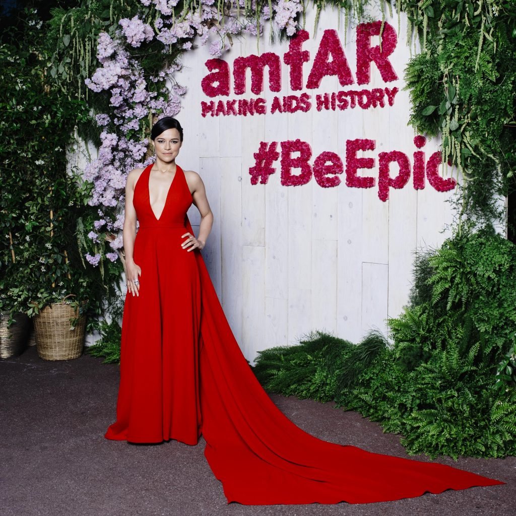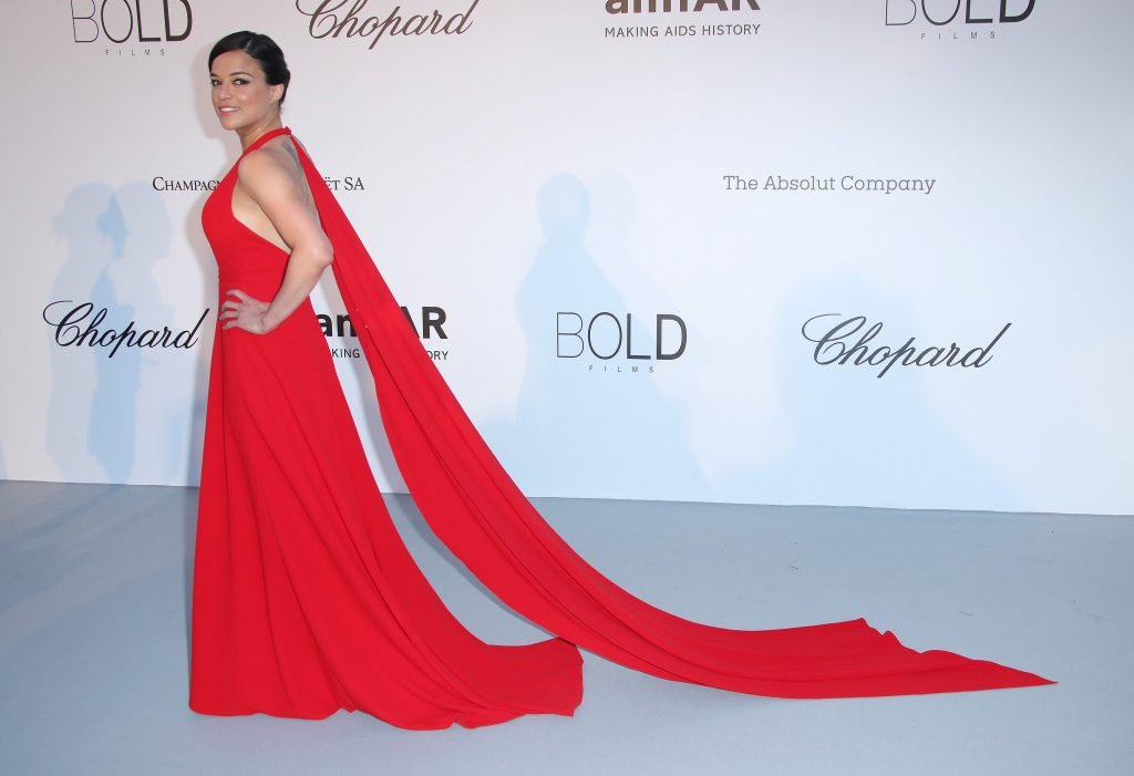 Michelle Rodriguez asiste a la 25ª Gala de Cine contra el SIDA de amfAR durante el 71º Festival de Cine de Cannes en Cannes, 17/05/2018. La actriz de 39 años llevaba un vestido rojo sin sujetador.