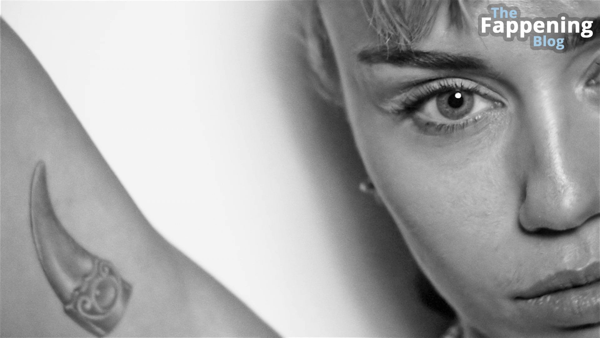 Mira las capturas de pantalla y el video desnudos y sexys de Miley Cyrus, mostrando todos sus tatuajes de su sesión en blanco y negro por Gray Sorrenti.