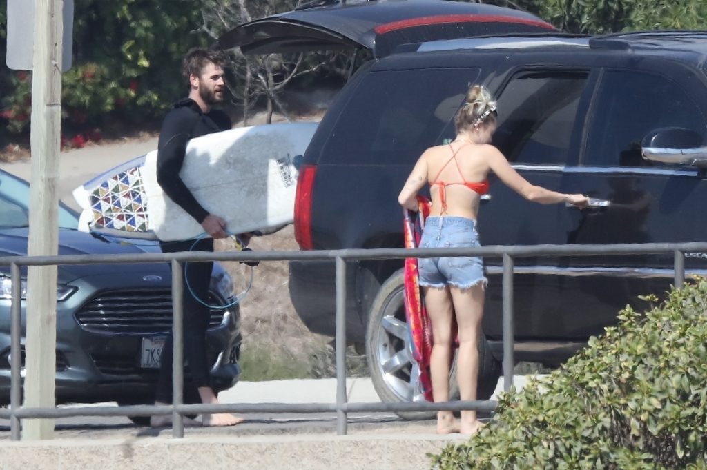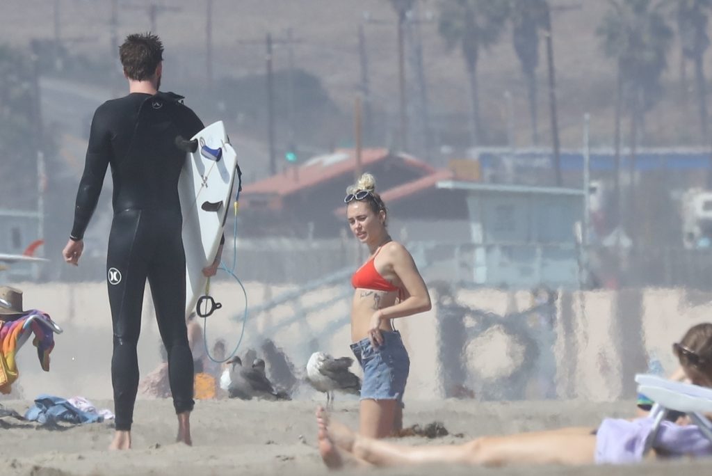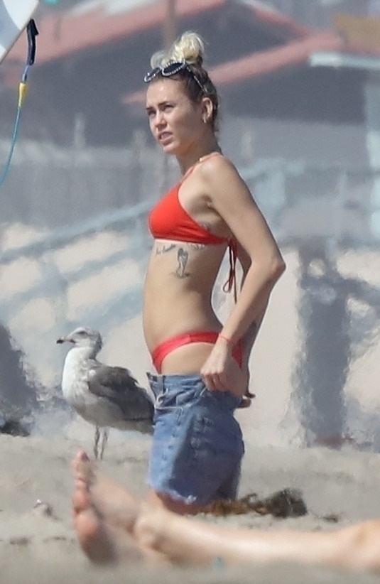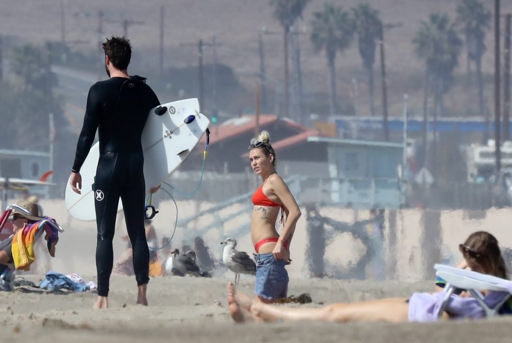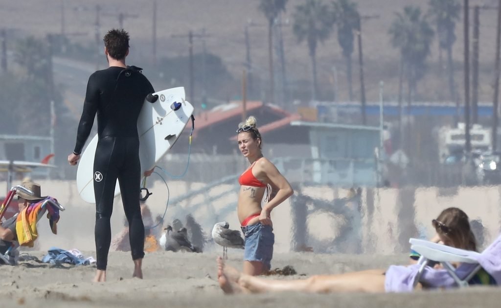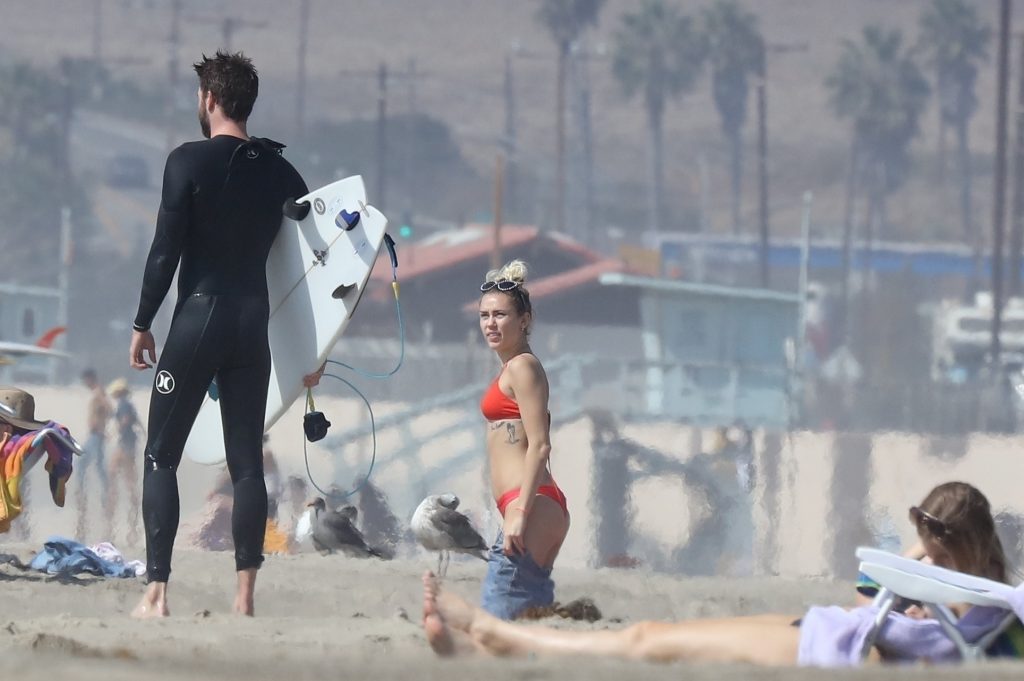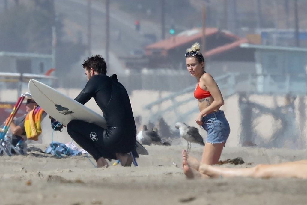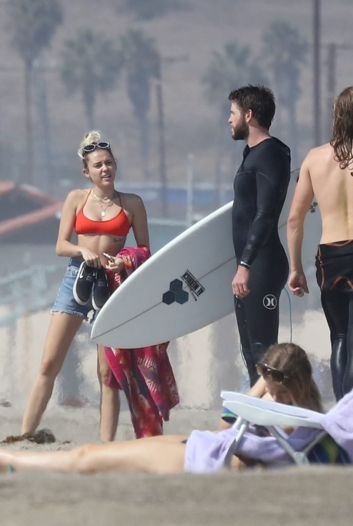 Miley Cyrus, 24, se relajó con un coqueto bikini rojo mientras observaba a su novio Liam Hemsworth enfrentarse a las olas en Malibu, 13/10/2017. La pareja pasó un tiempo descansando en la playa antes de irse juntos. Miley se puso unos shorts de mezclilla sobre su conjunto rojo mientras Liam se quitaba el traje de neopreno antes de partir.