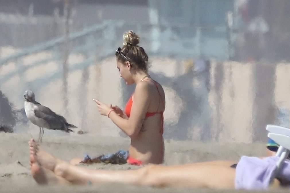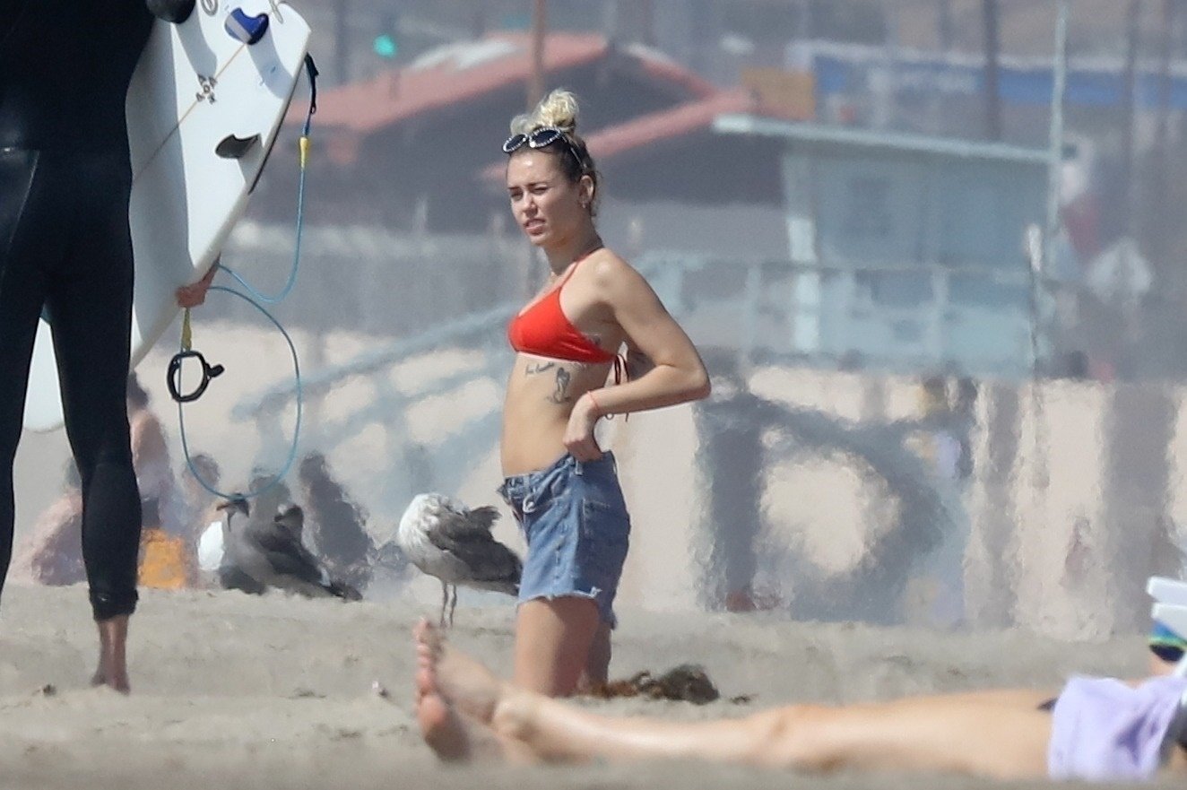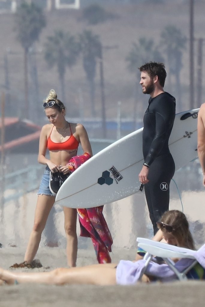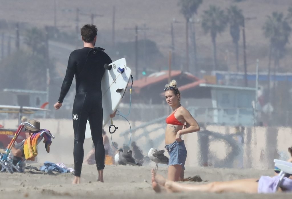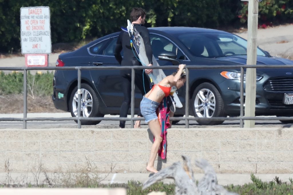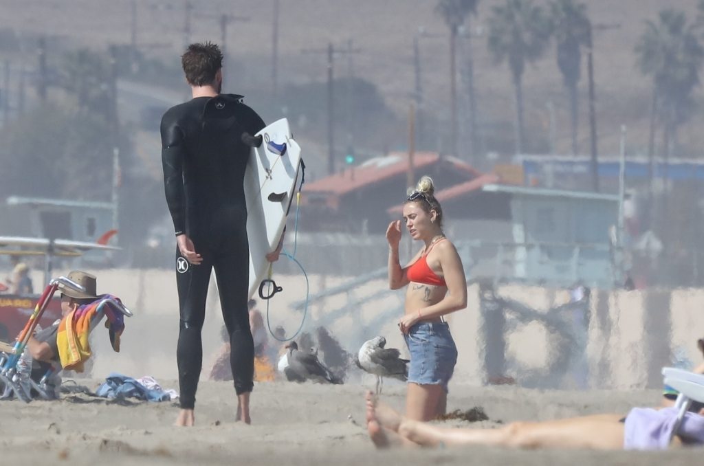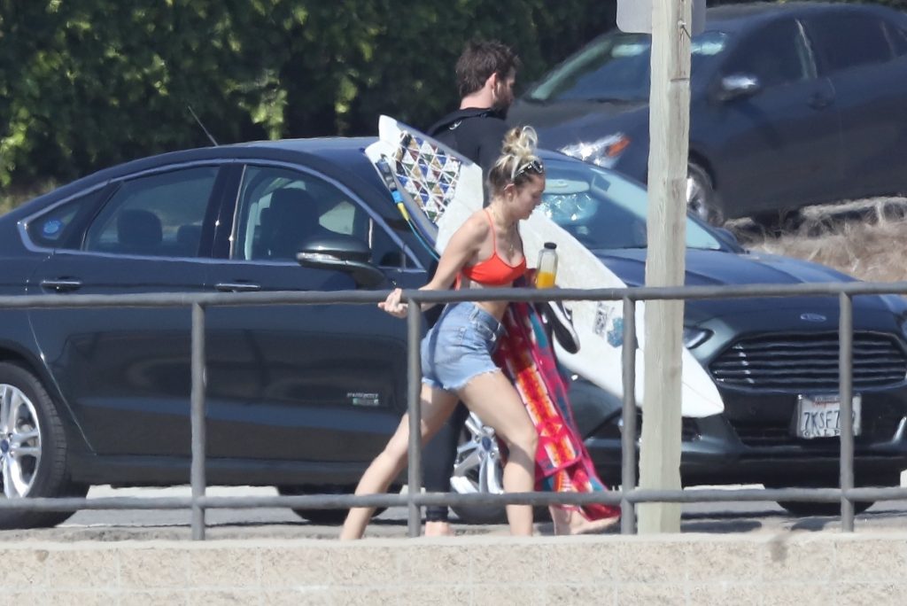 Miley Cyrus, 24, se relajó con un coqueto bikini rojo mientras observaba a su novio Liam Hemsworth enfrentarse a las olas en Malibu, 13/10/2017. La pareja pasó un tiempo descansando en la playa antes de irse juntos. Miley se puso unos shorts de mezclilla sobre su conjunto rojo mientras Liam se quitaba el traje de neopreno antes de partir.