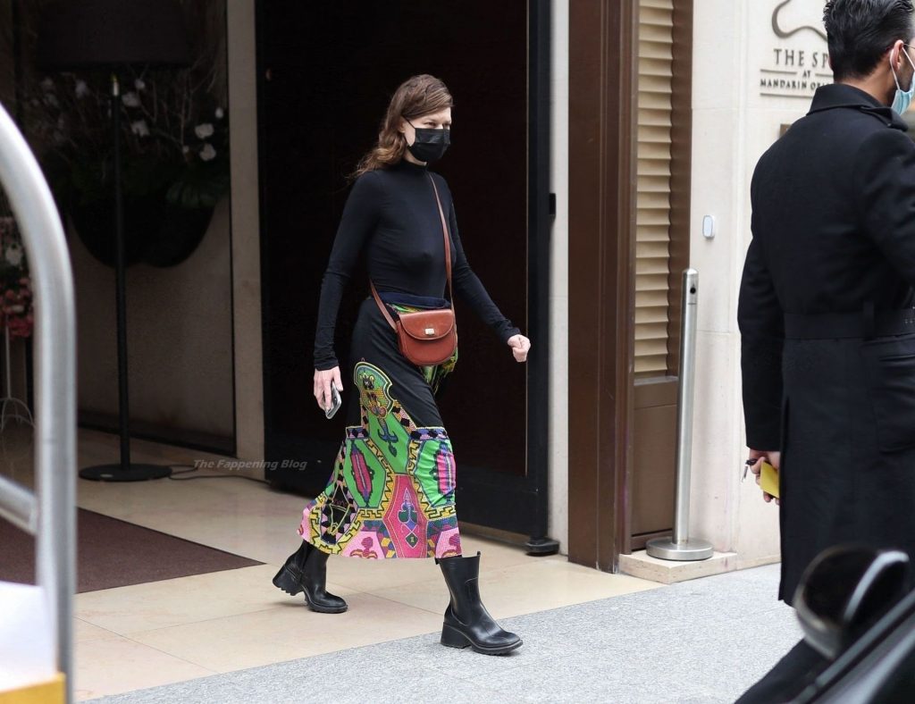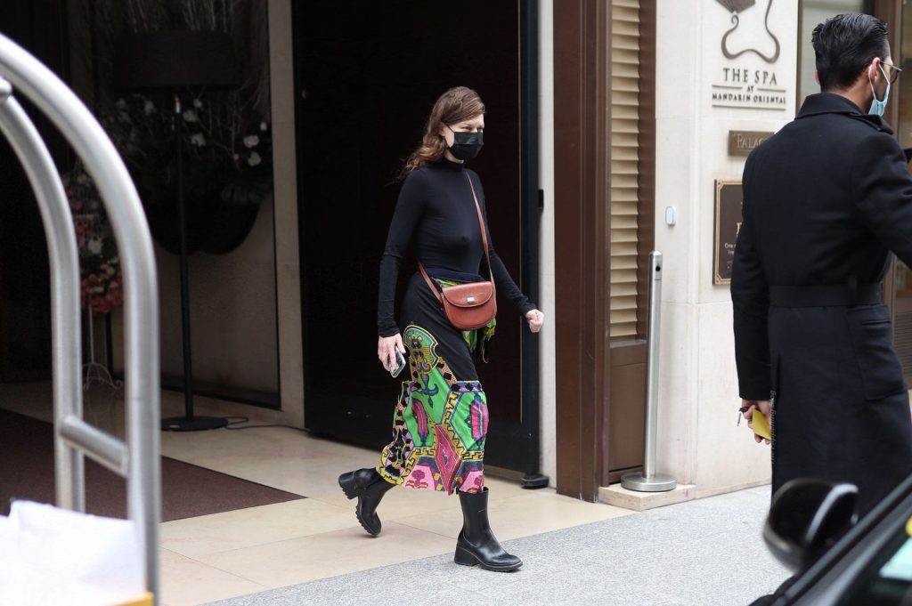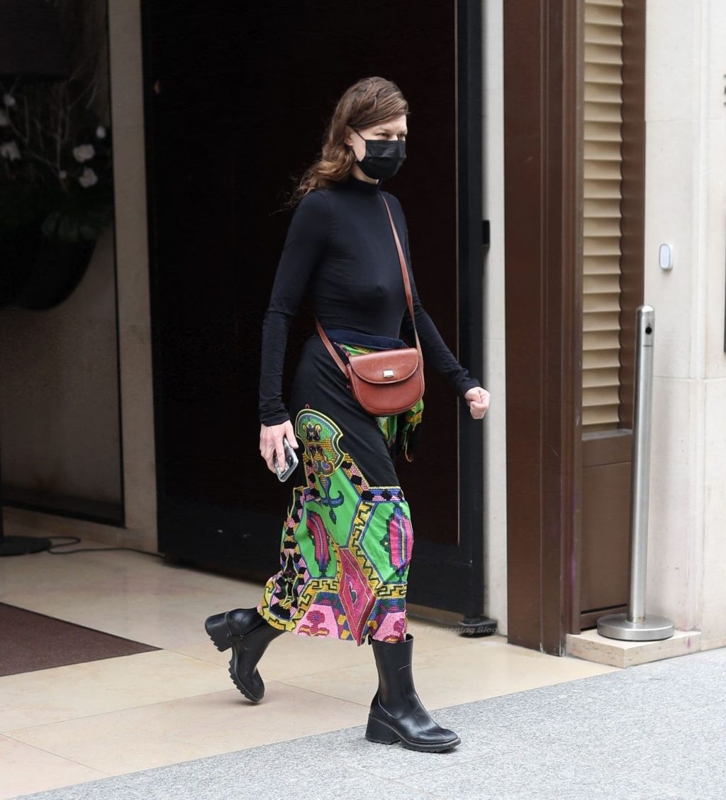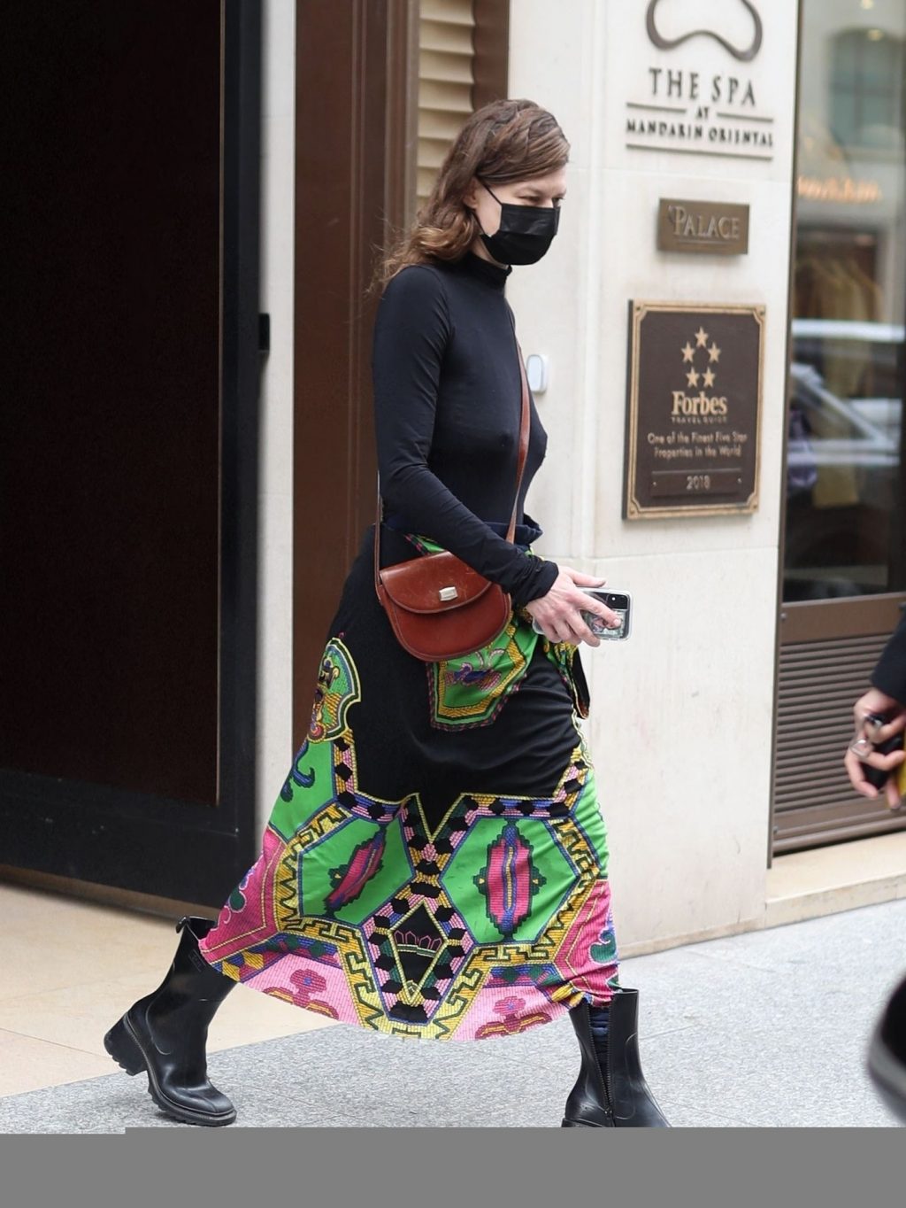 La actriz estadounidense Milla Jovovich muestra estilo al salir del Hotel Mandarin. Llevaba puesta su mascarilla y una falda multicolor con botas negras durante la semana de la moda en París, 05/03/2021.