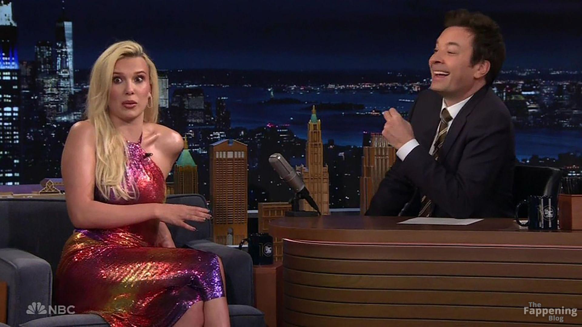 Millie Bobby Brown aparece luciendo sexy y sin sujetador, mostrando sus pezones a través de un vestido metálico en “The Tonight Show Starring Jimmy Fallon”. La actriz estuvo en el programa nocturno estadounidense para promocionar su nueva película “Electric State”, donde compartió recuerdos de su boda con Jake Bongiovi el año pasado.