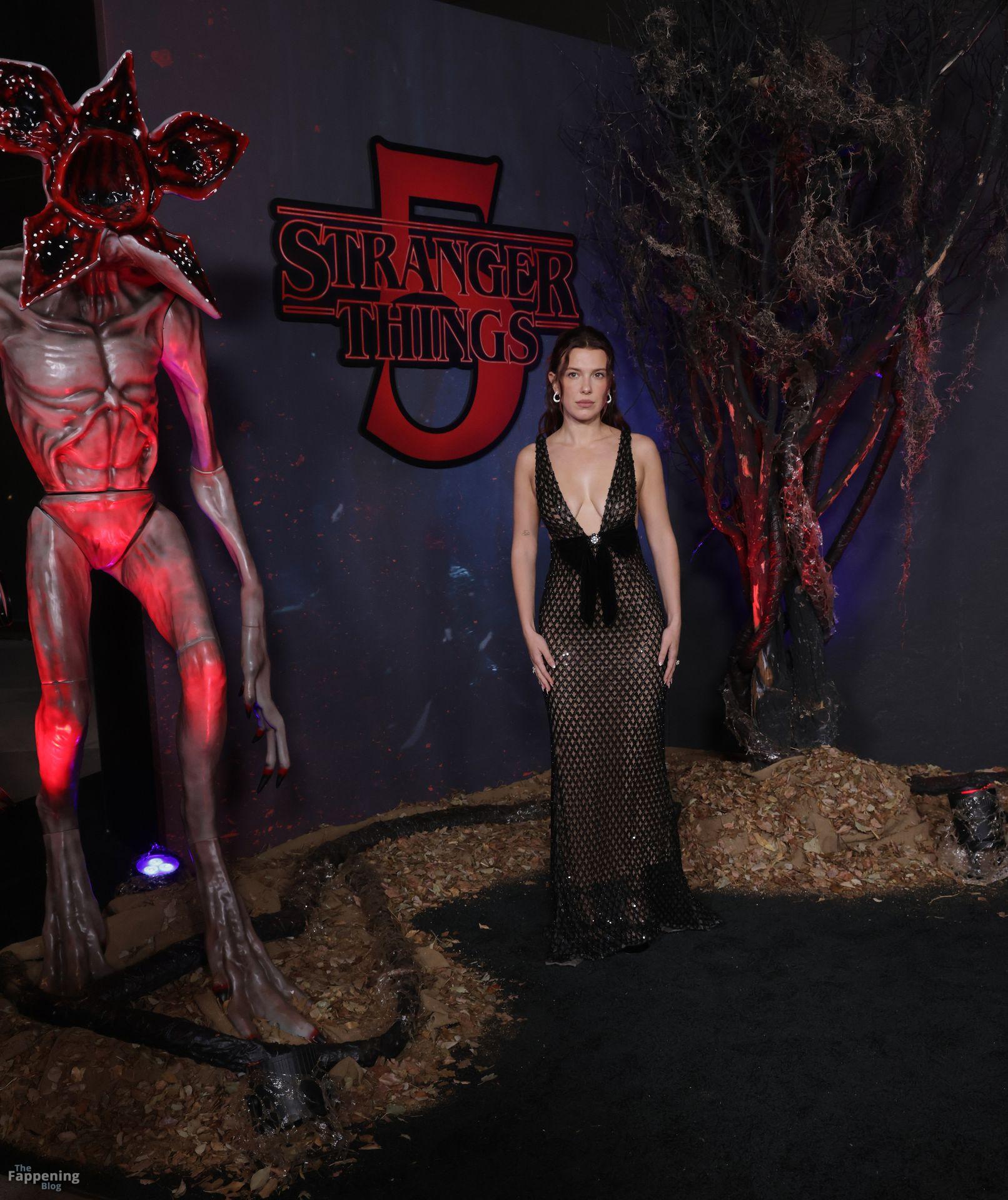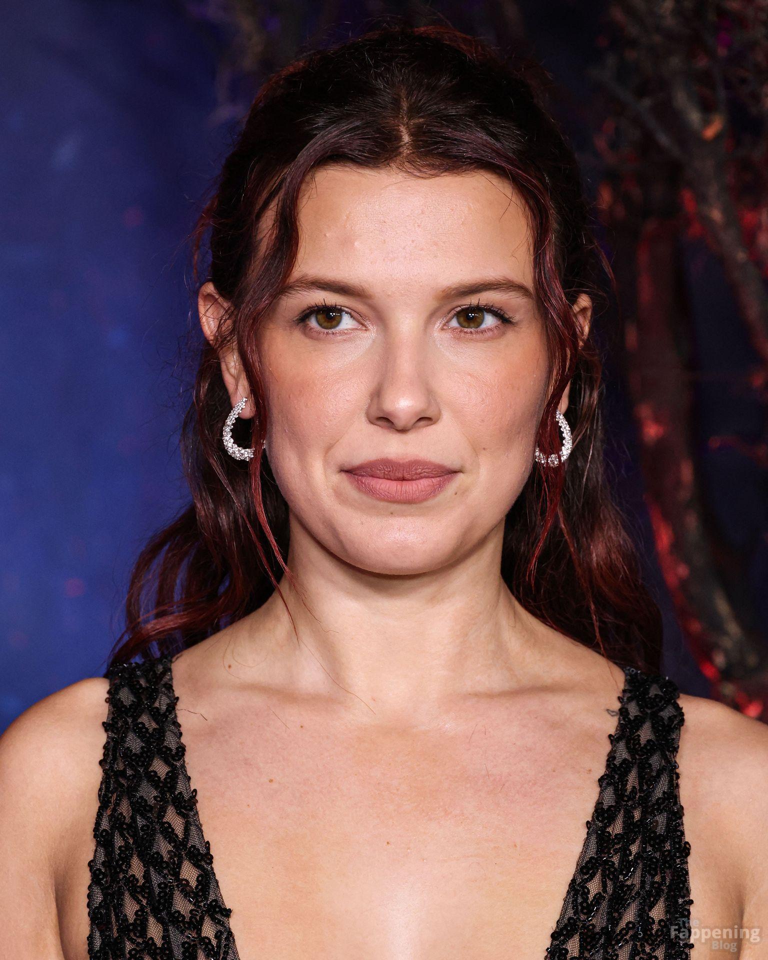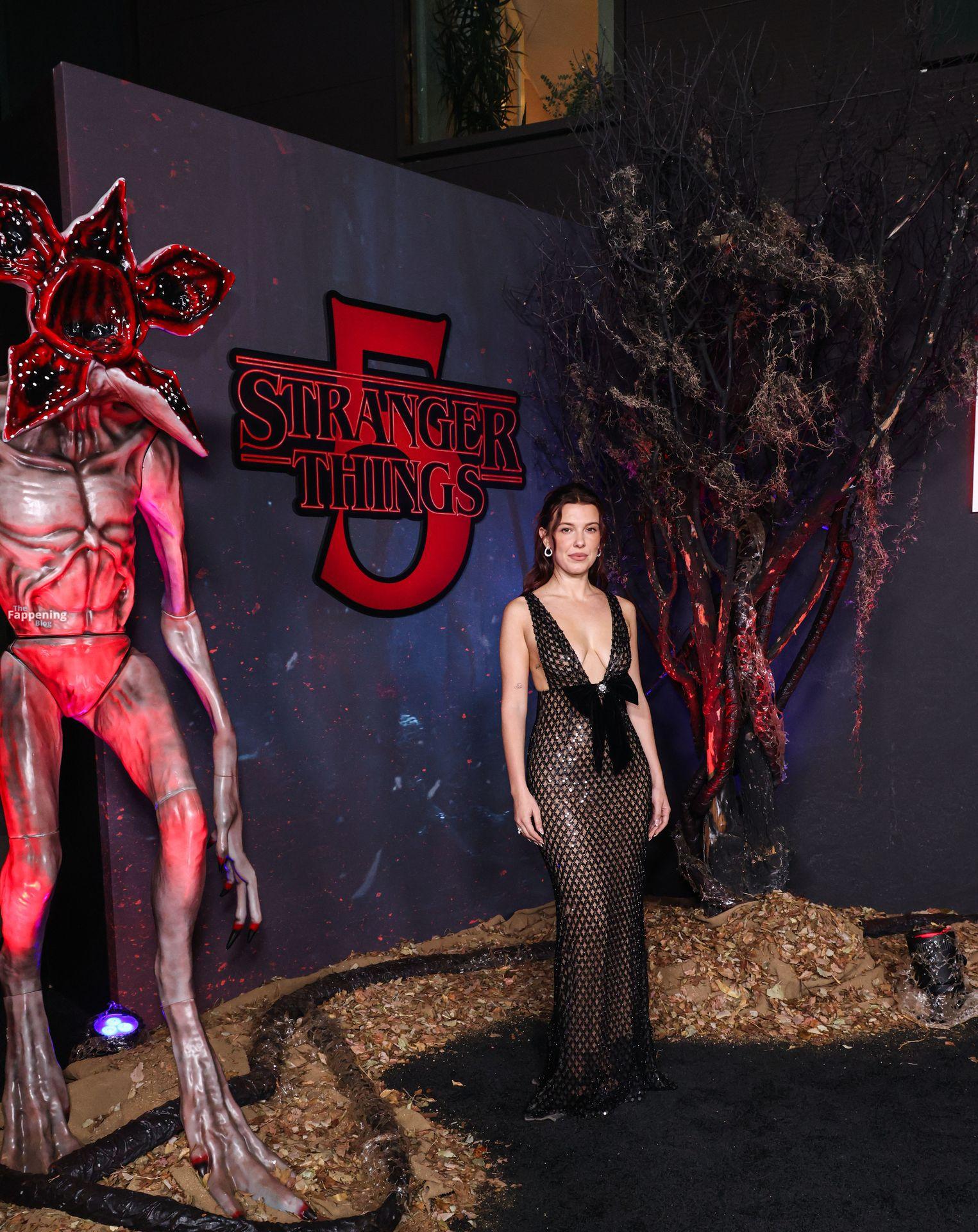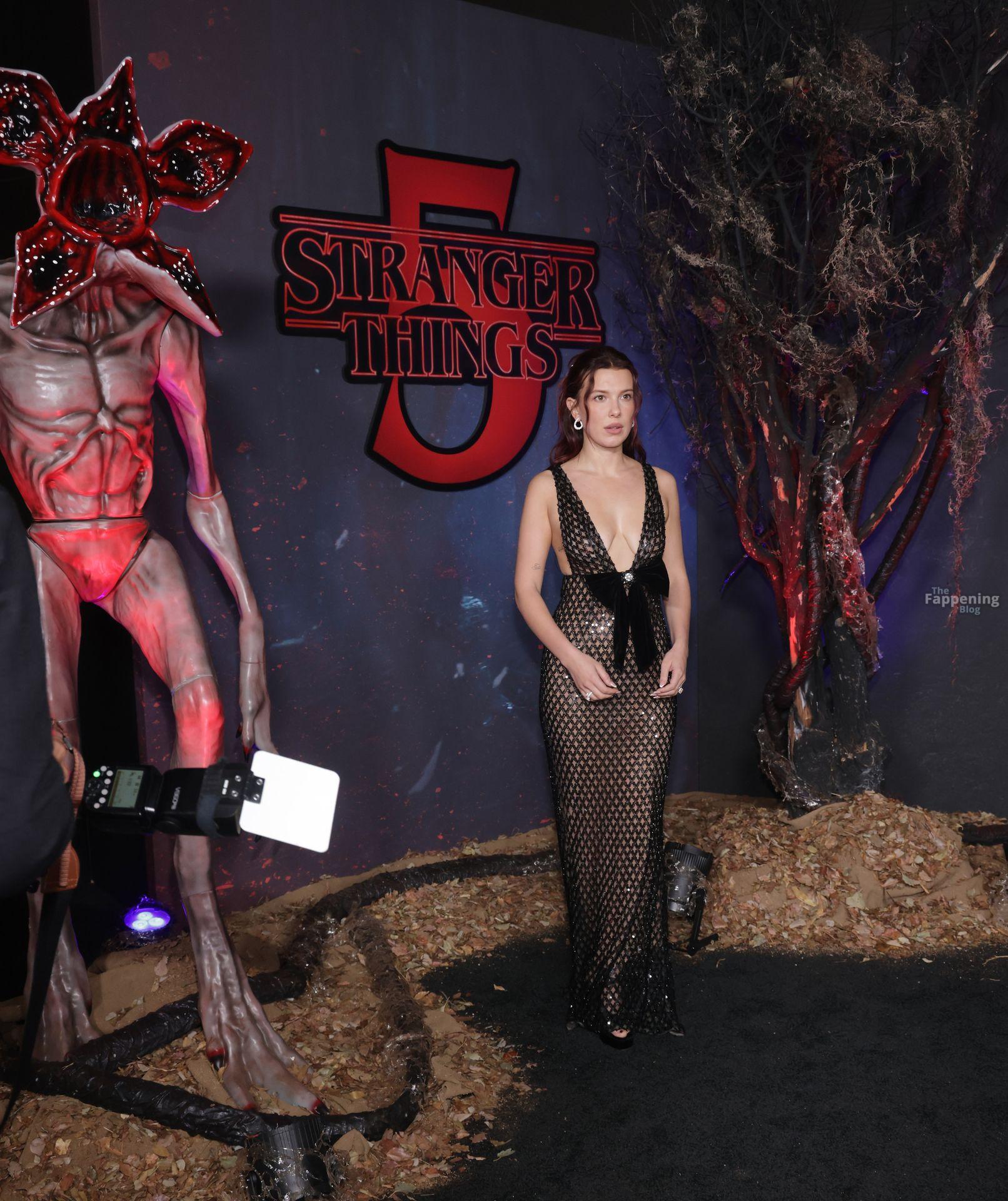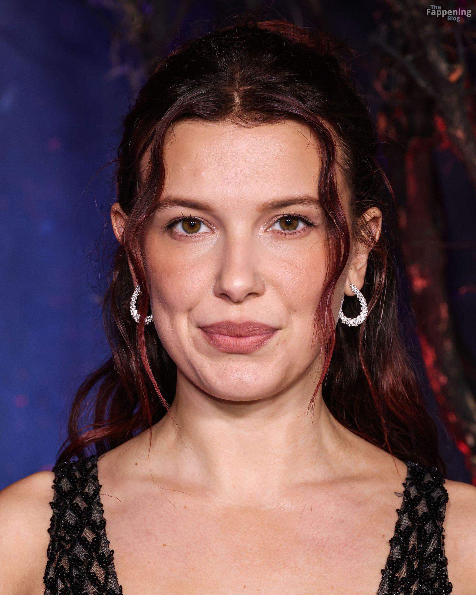 Millie Bobby Brown apareció en el Evento FYC de la Temporada 5 de Stranger Things en Hollywood, luciendo un vestido negro transparente con lentejuelas y un escote pronunciado que dejaba sus pechos a la vista.