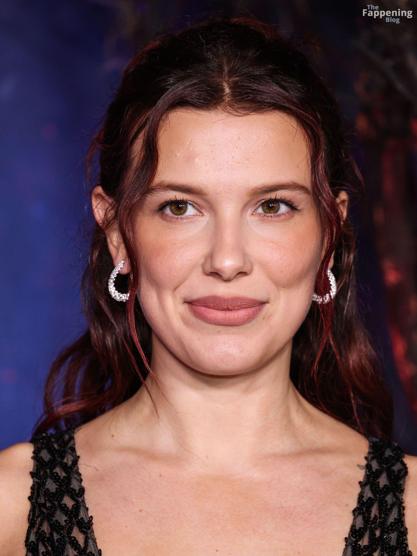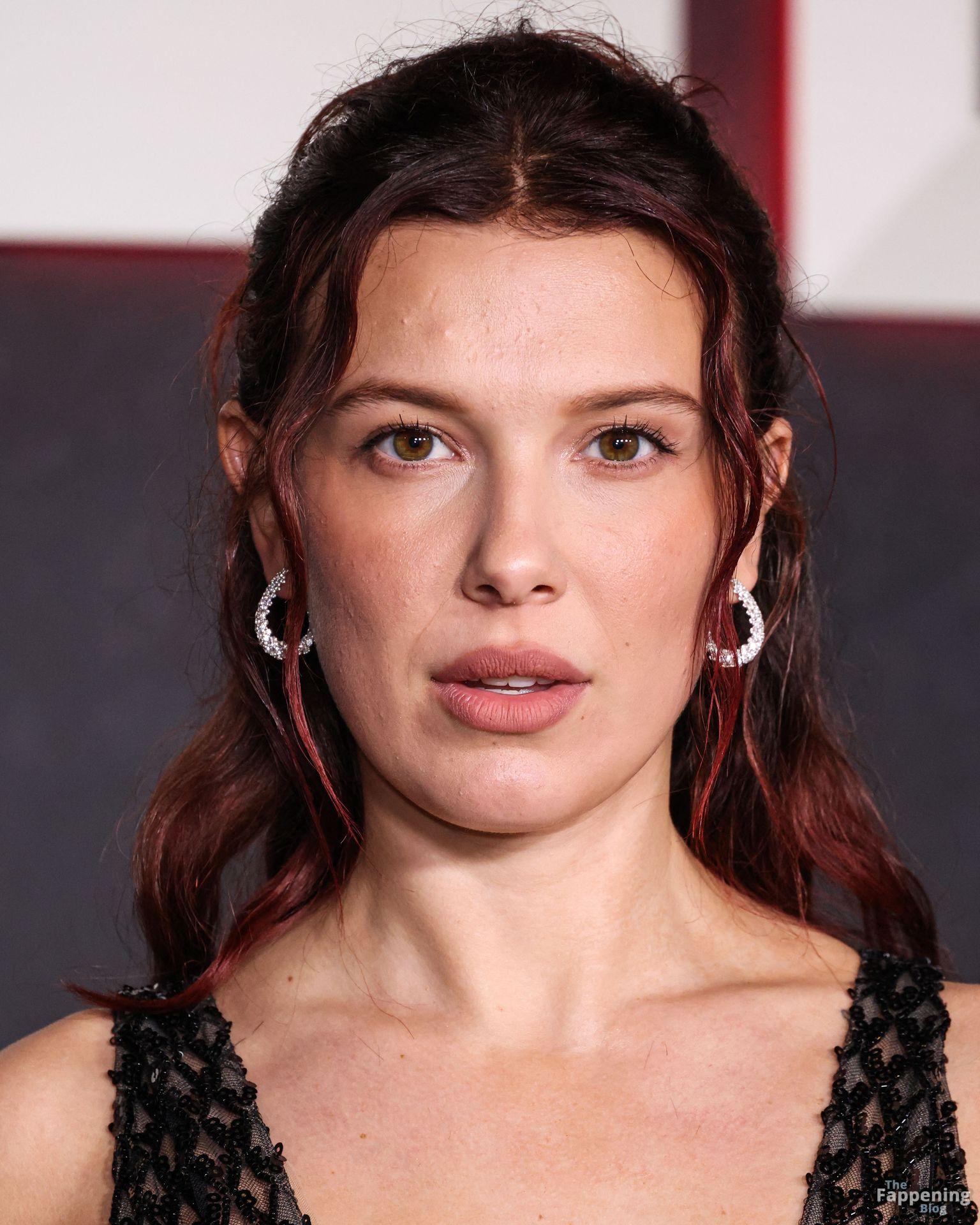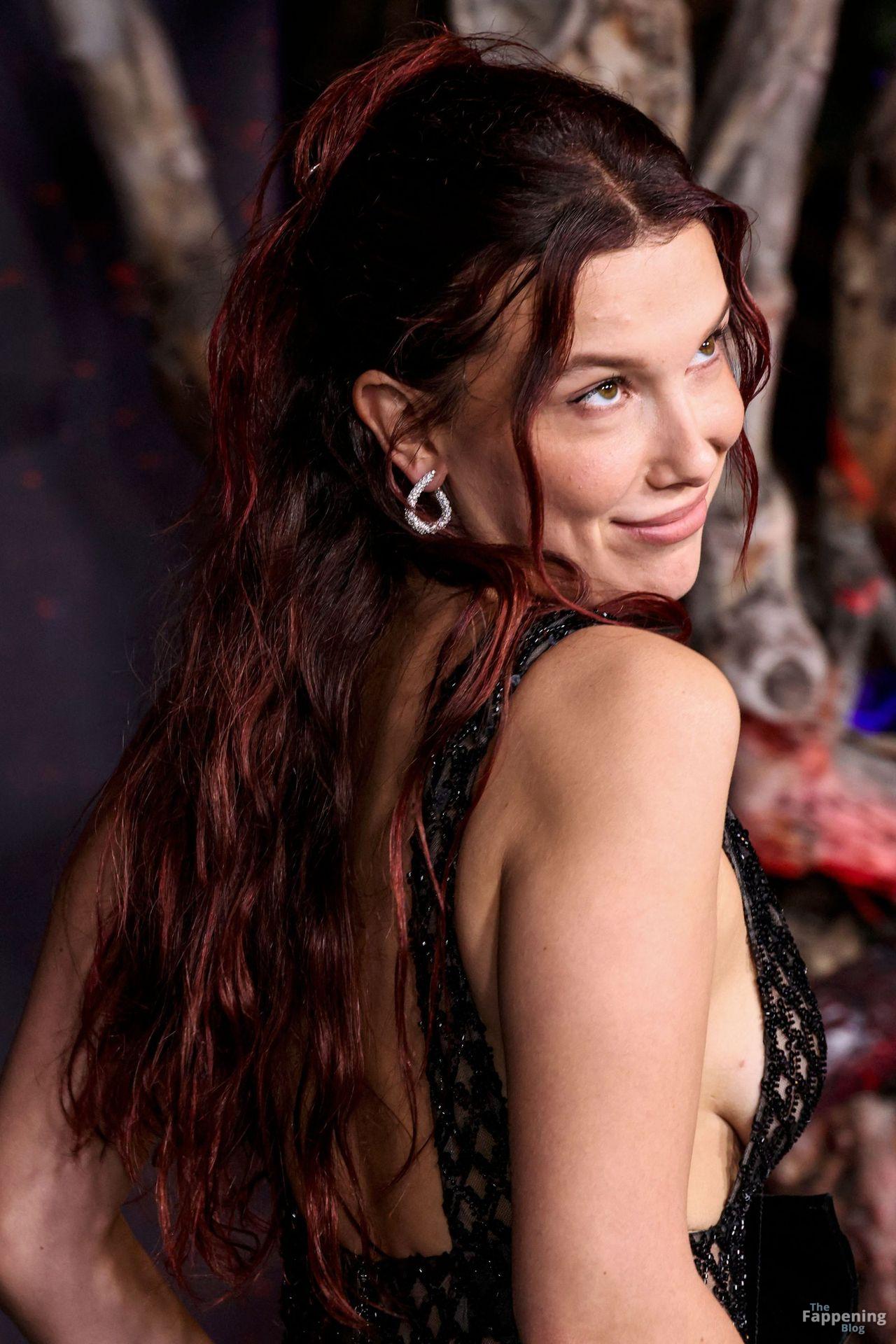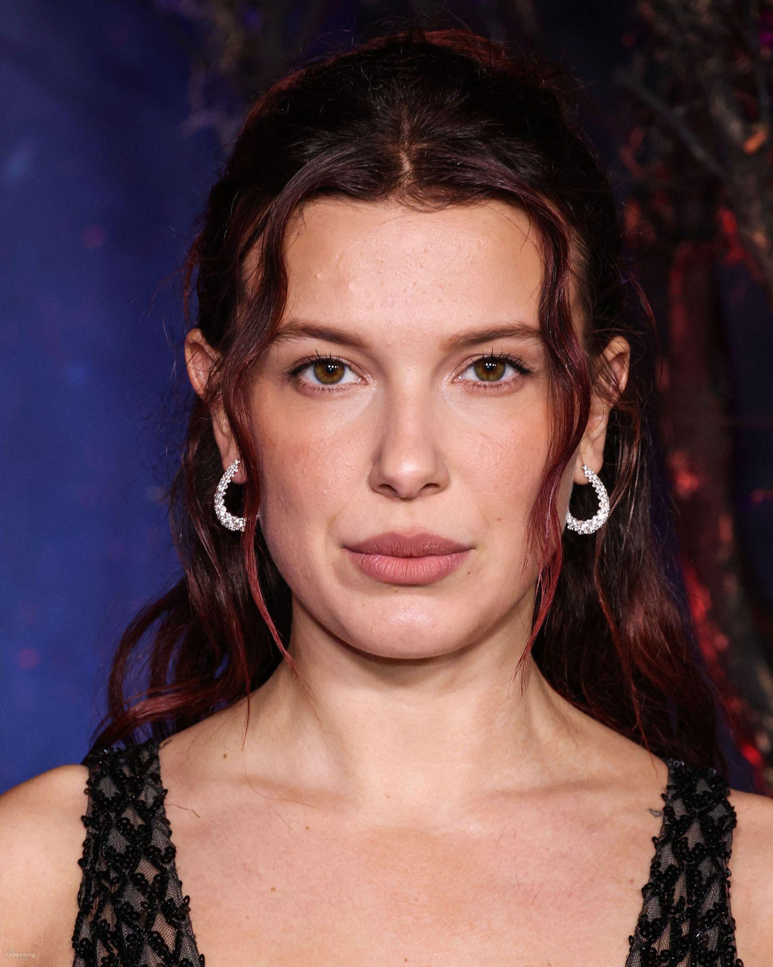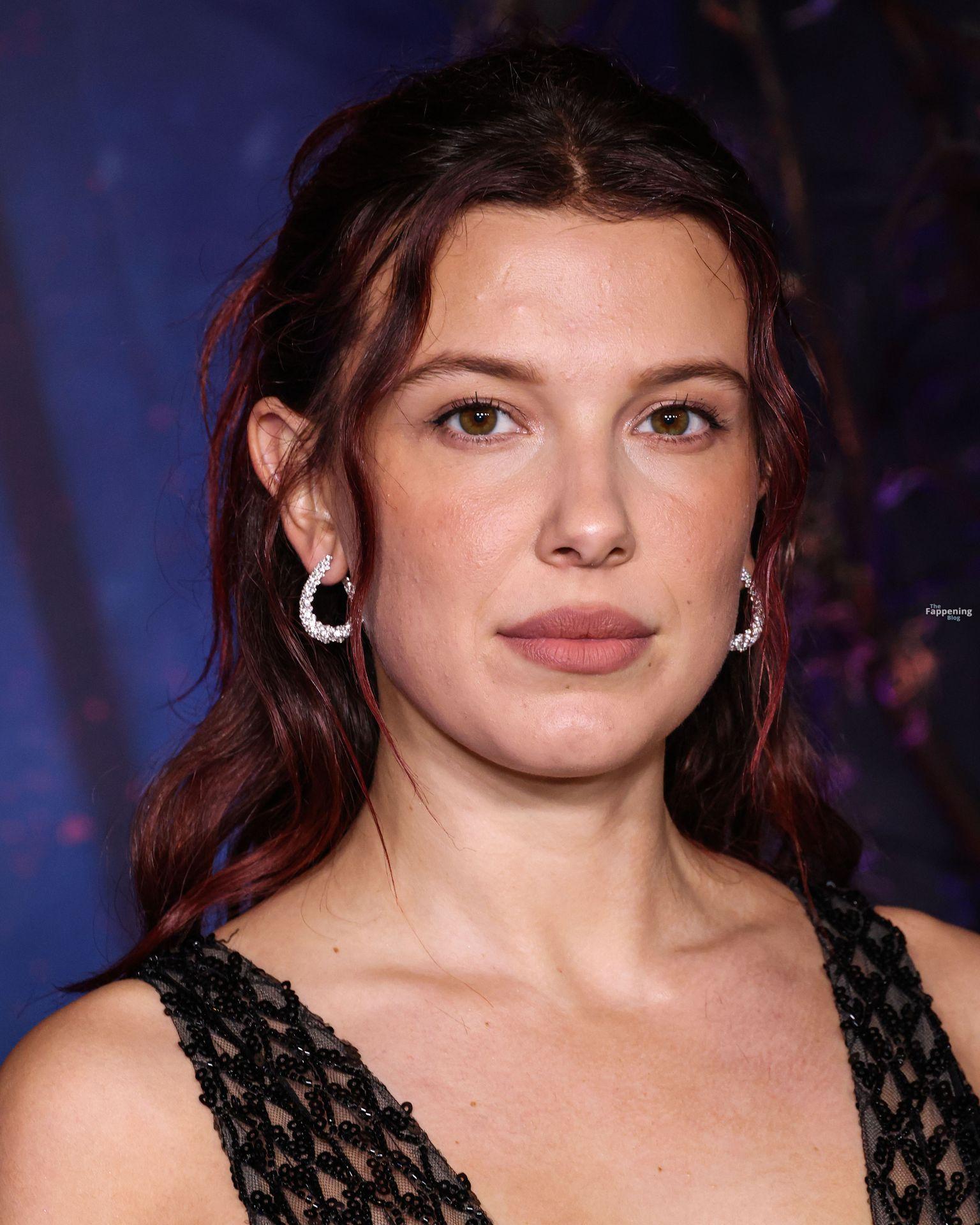 Millie Bobby Brown apareció en el Evento FYC de la Temporada 5 de Stranger Things en Hollywood, luciendo un vestido negro transparente con lentejuelas y un escote pronunciado que dejaba sus pechos a la vista.