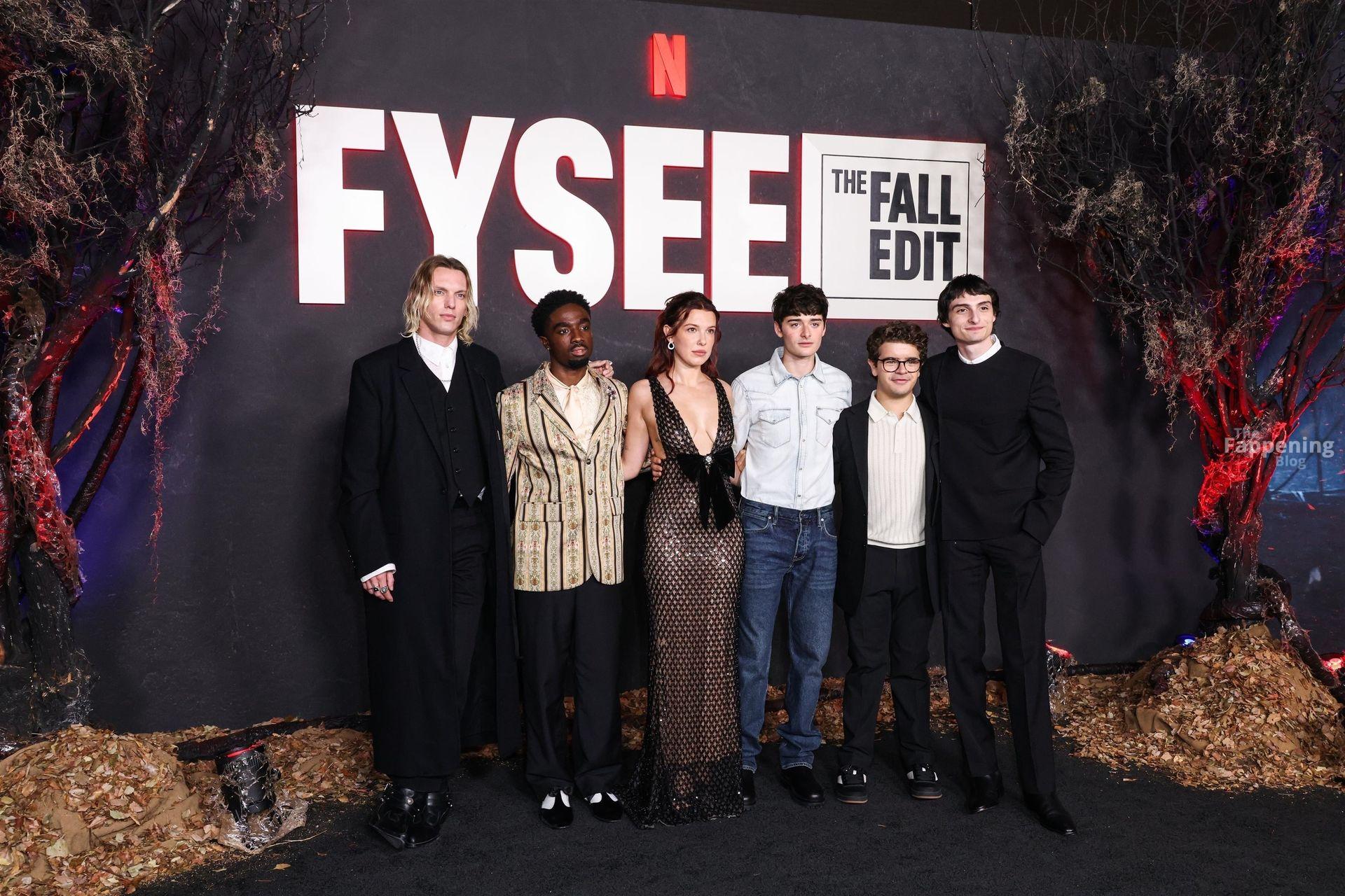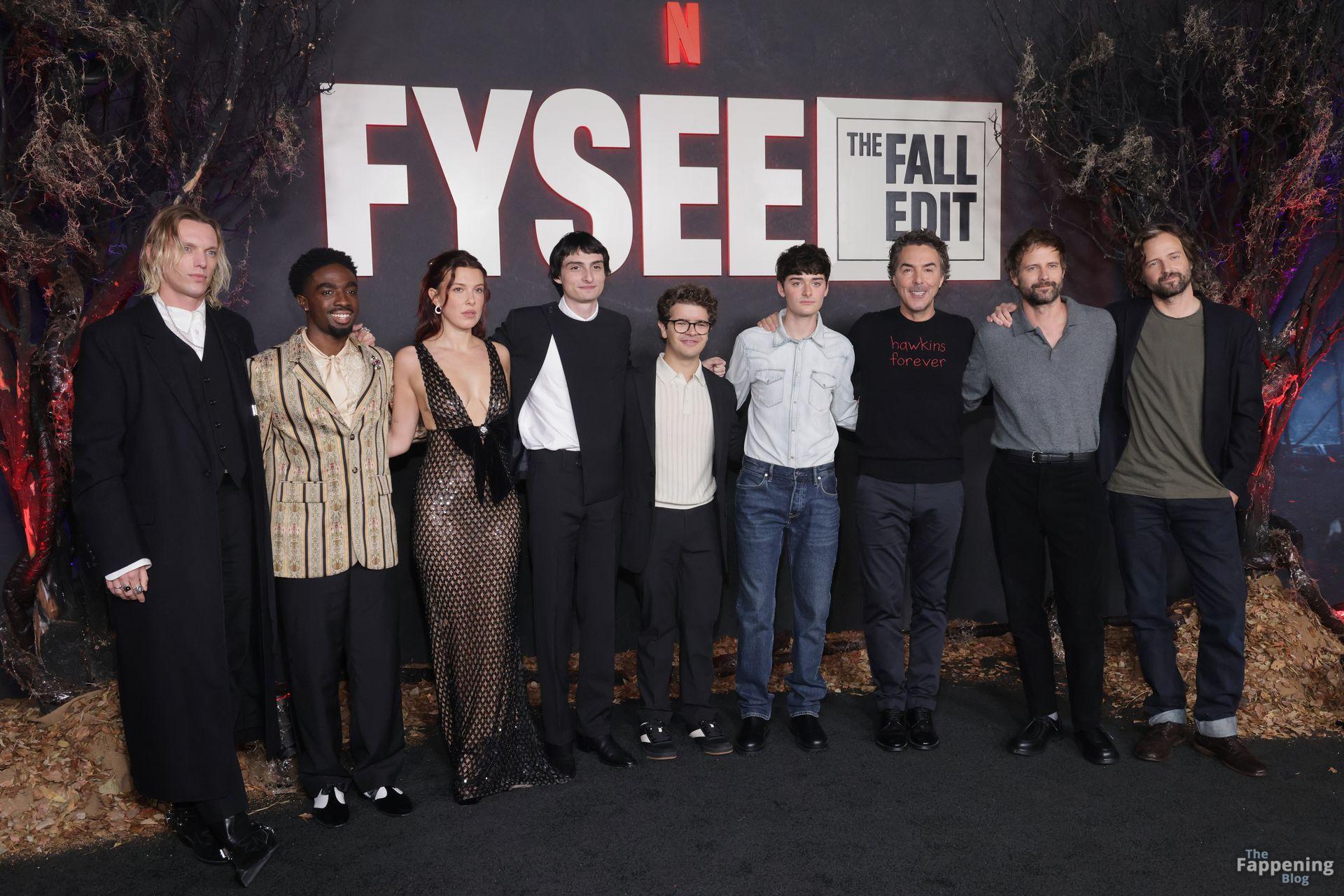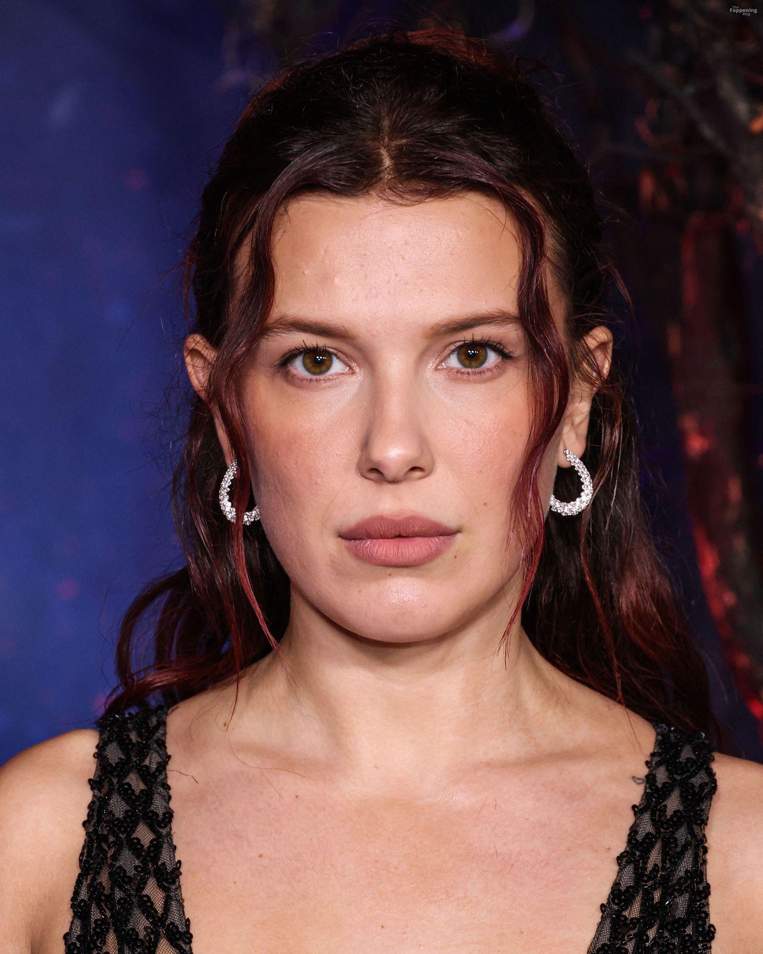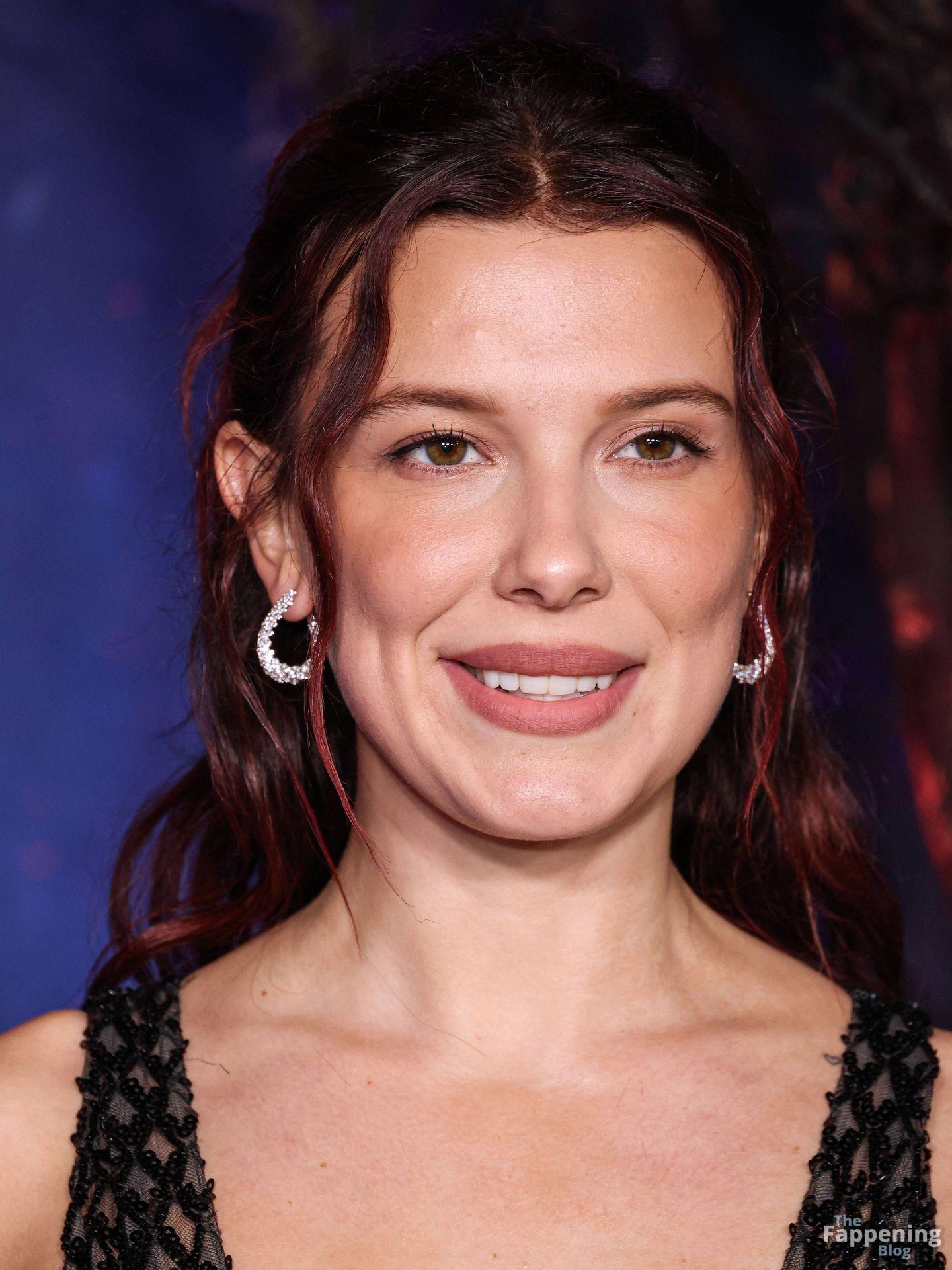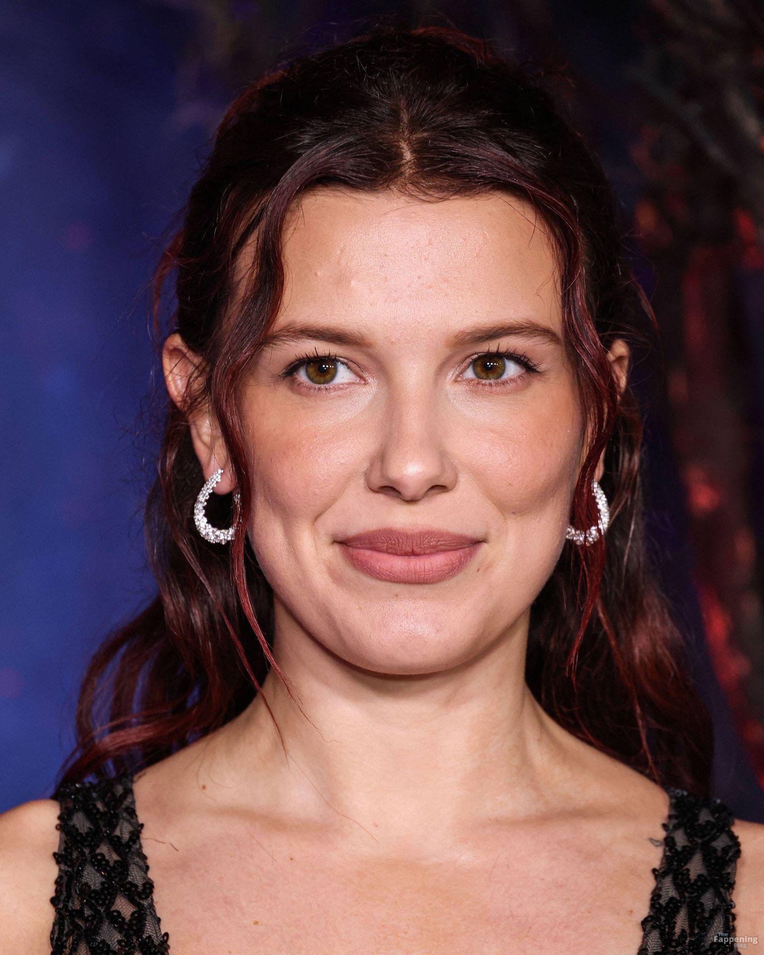 Millie Bobby Brown apareció en el Evento FYC de la Temporada 5 de Stranger Things en Hollywood, luciendo un vestido negro transparente con lentejuelas y un escote pronunciado que dejaba sus pechos a la vista.