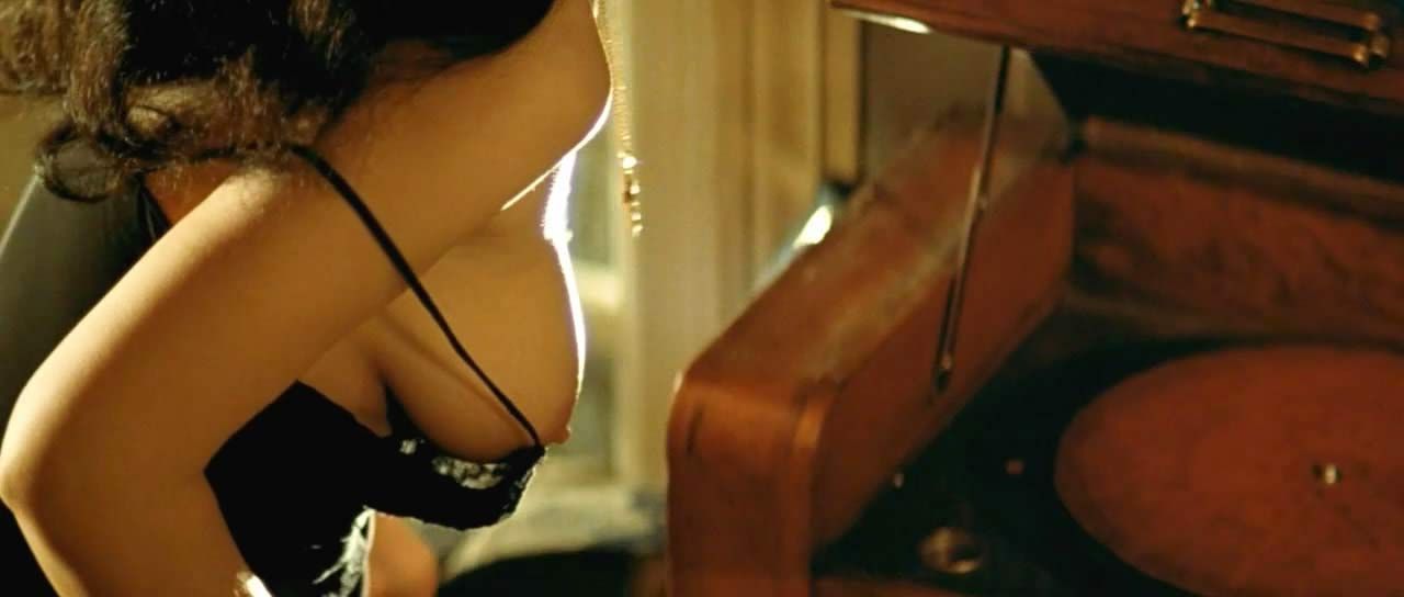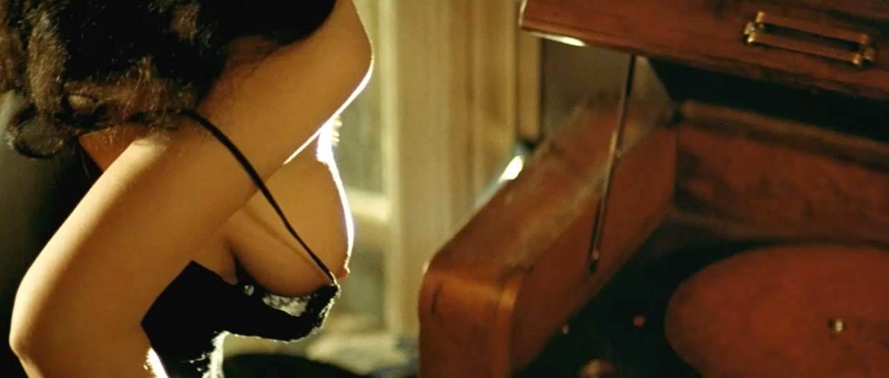 Monica Bellucci is another uncensored scene that accidentally shows her naked right tit. She bent to turn the record player, where she bends over, and her right boob and nude nipple pop free – a very friendly and juicy scene for watching.
