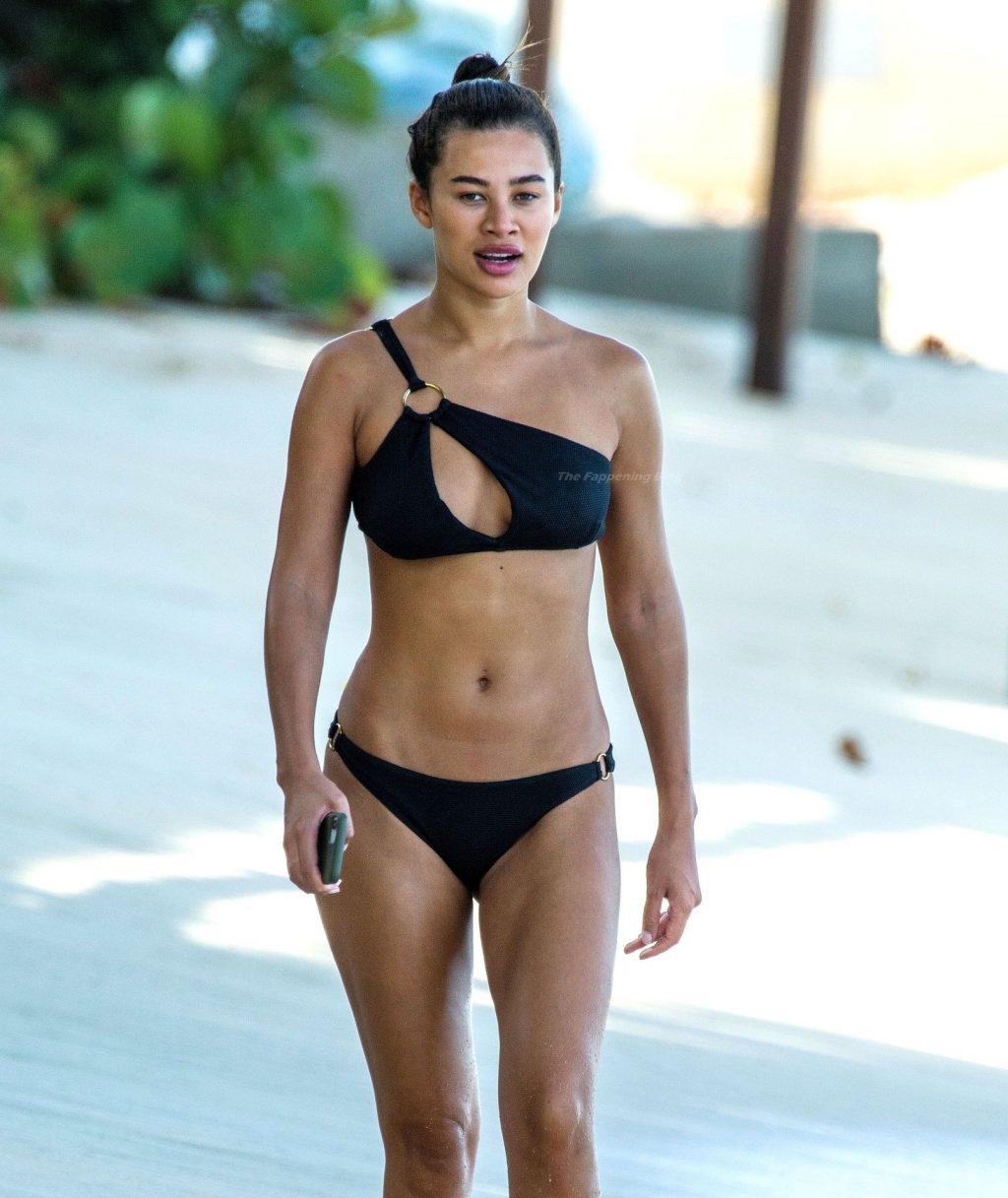Sexy estrella de Love Island Montana Brown presume su atractivo trasero mientras caminaba por las doradas playas de arena del Distrito de St. James en Barbados (2021).