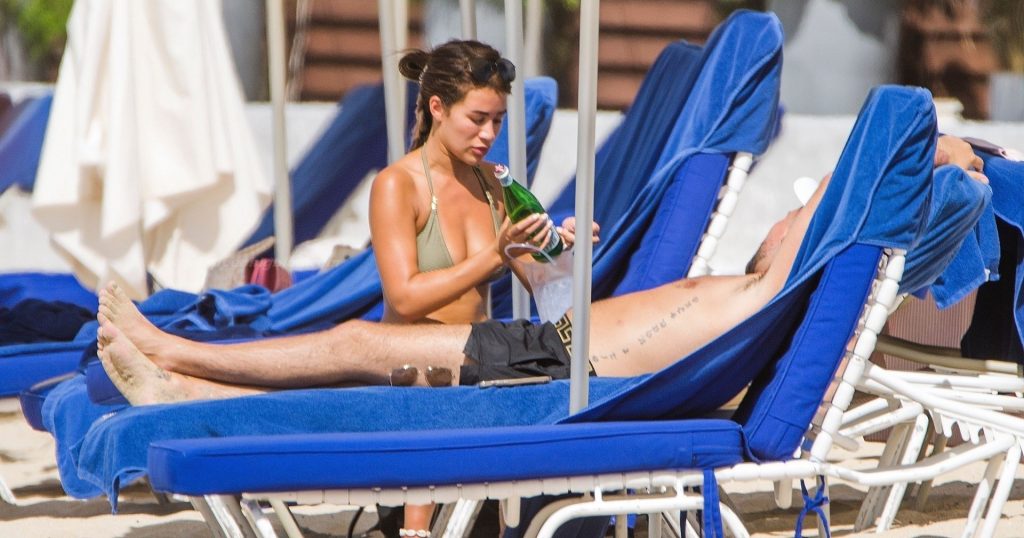 Montana Brown lleva un conjunto de bikini de dos piezas color verde oliva durante sus vacaciones en Barbados, 01/01/2021.