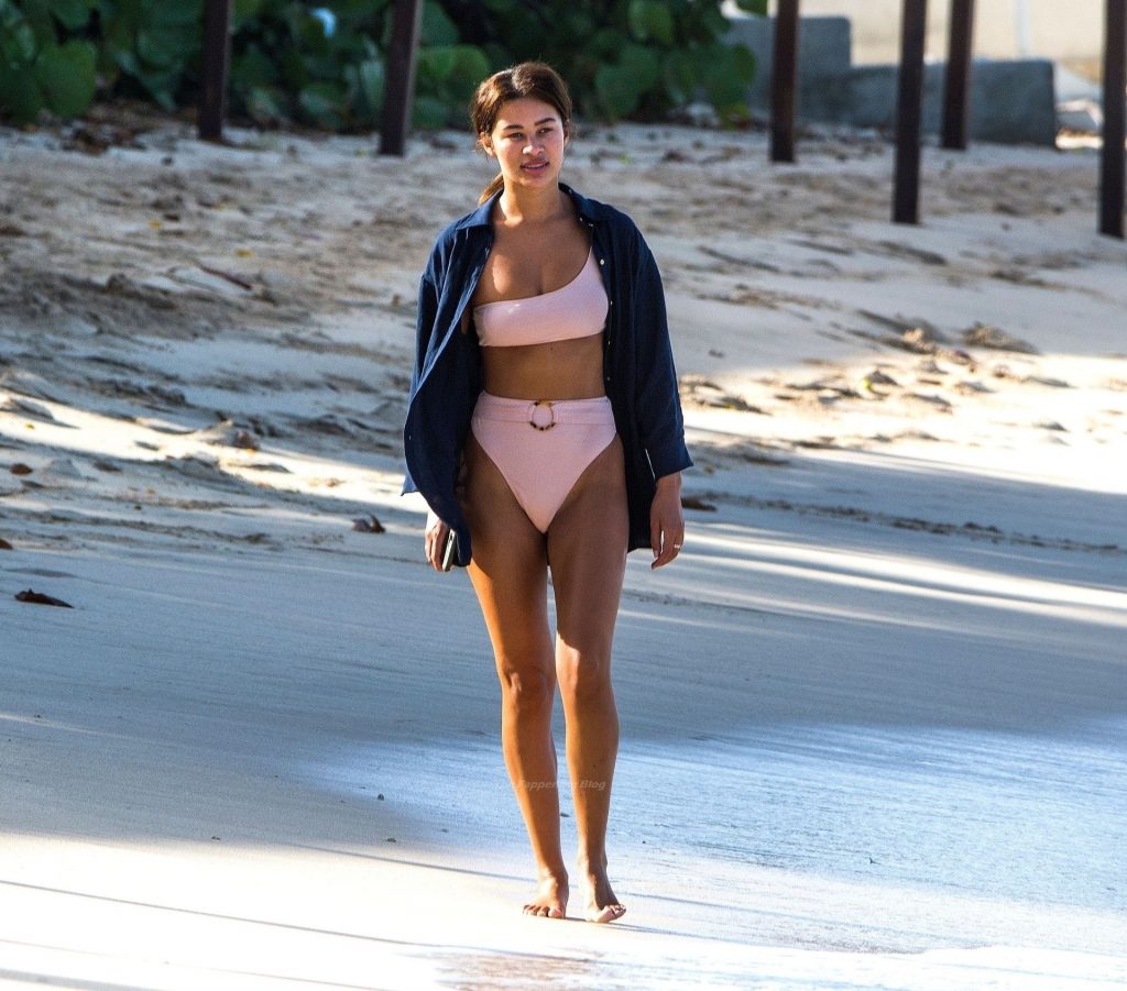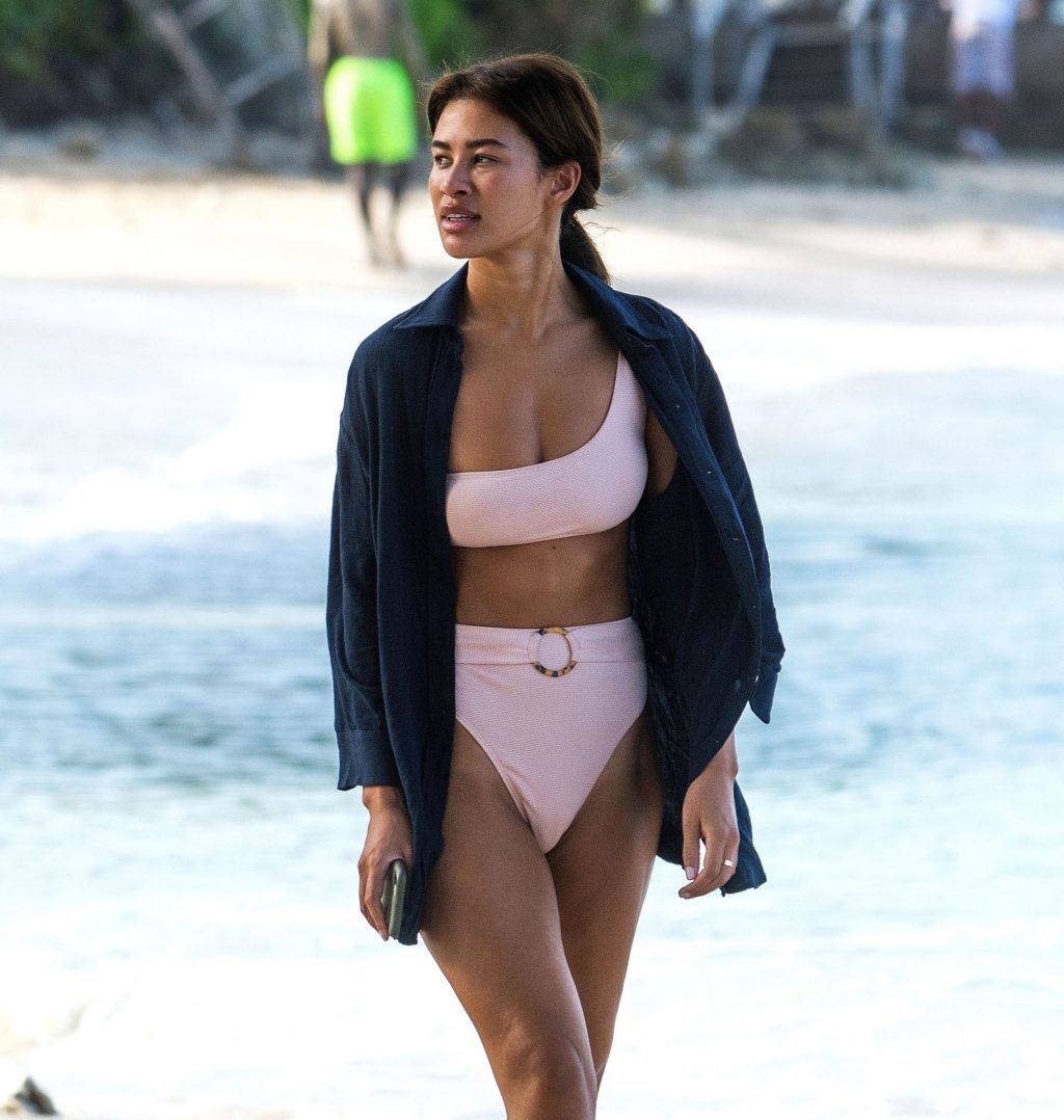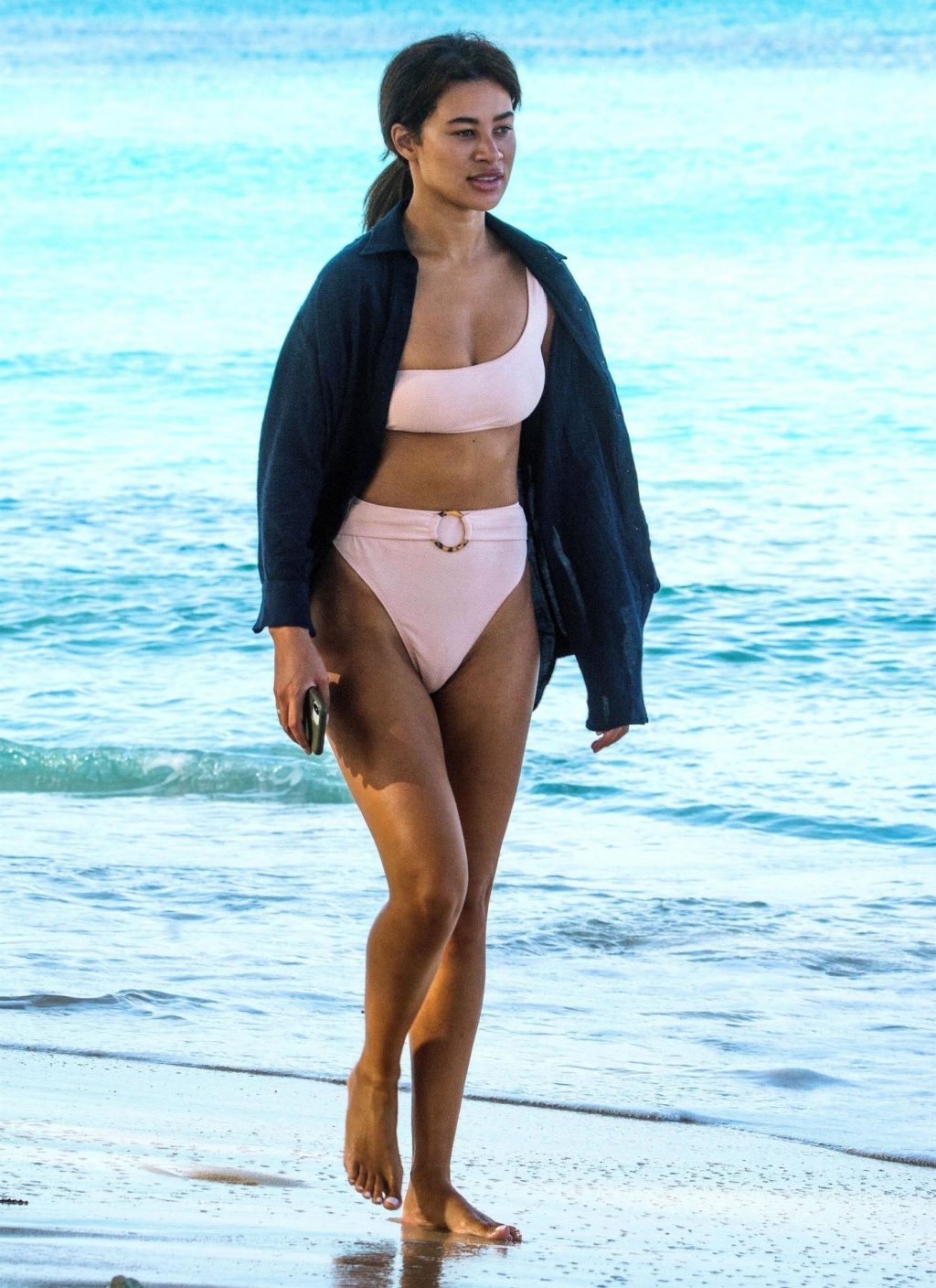 La exuberante Montana, quien apareció en nuestras pantallas en 2017 en el popular reality show de ITV Love Island, literalmente deslumbró en la playa de arena blanca mostrando su cuerpo de playa seductor y revelando sus abdominales marcados con su traje de baño rosa debajo de su camisa azul mientras la estrella brillaba en el paraíso caribeño.