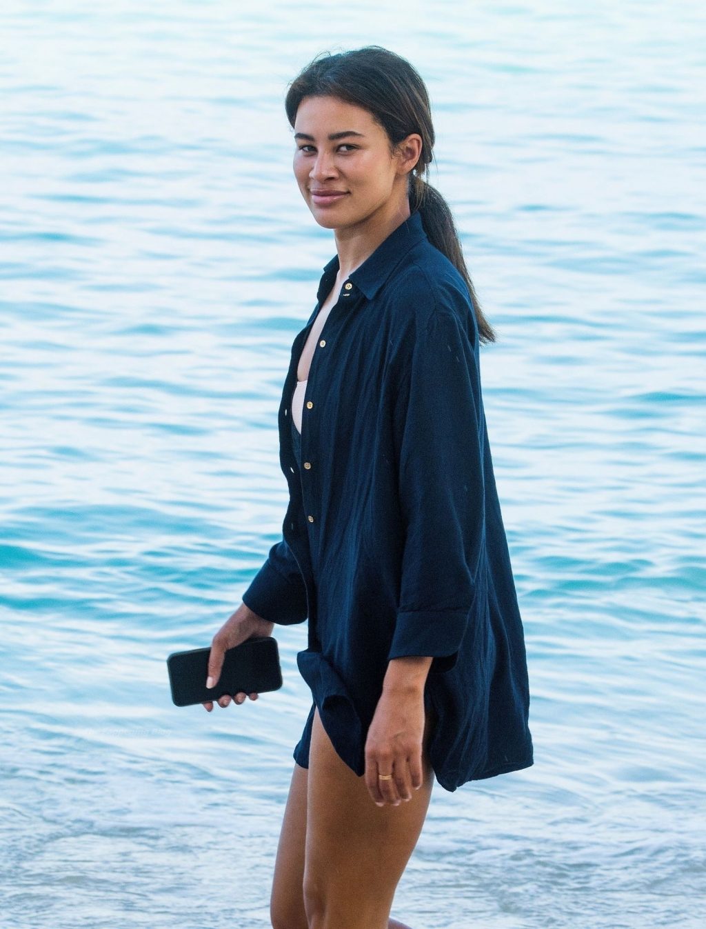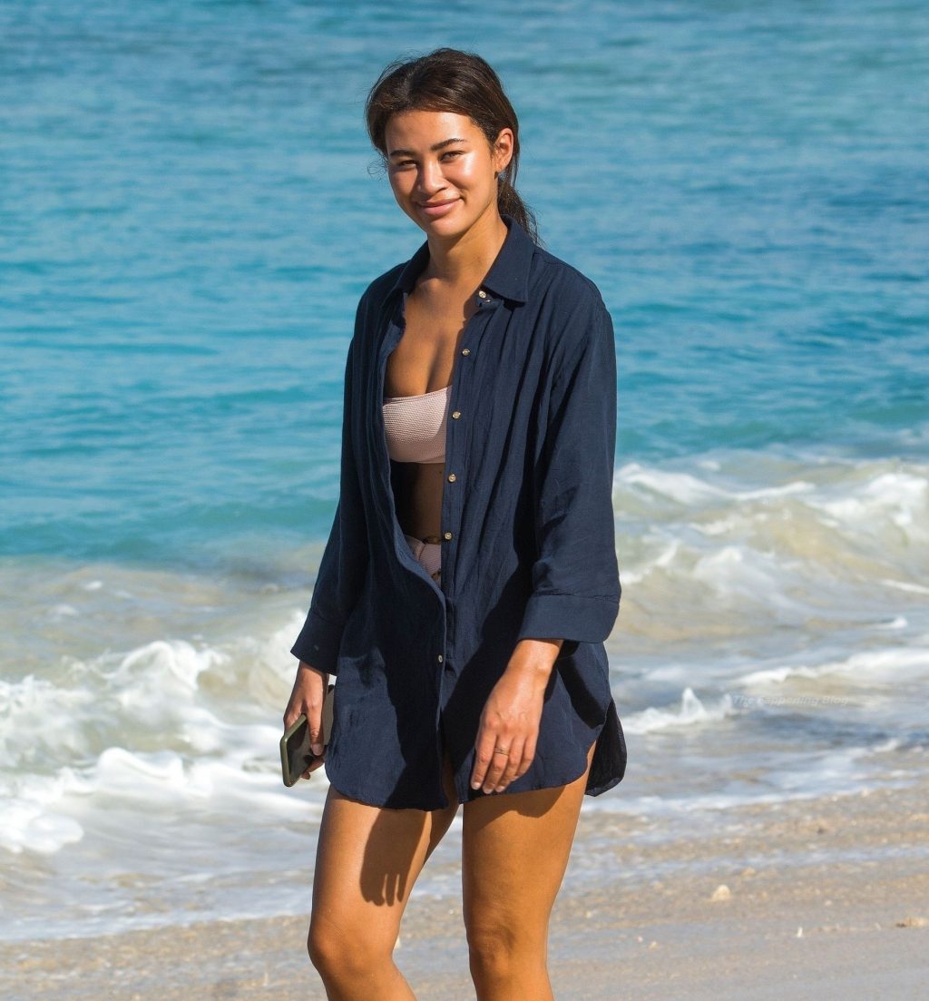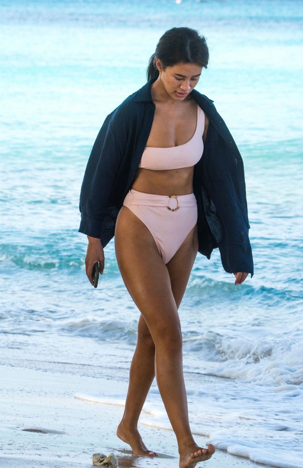 La exuberante Montana, quien apareció en nuestras pantallas en 2017 en el popular reality show de ITV Love Island, literalmente deslumbró en la playa de arena blanca mostrando su cuerpo de playa seductor y revelando sus abdominales marcados con su traje de baño rosa debajo de su camisa azul mientras la estrella brillaba en el paraíso caribeño.
