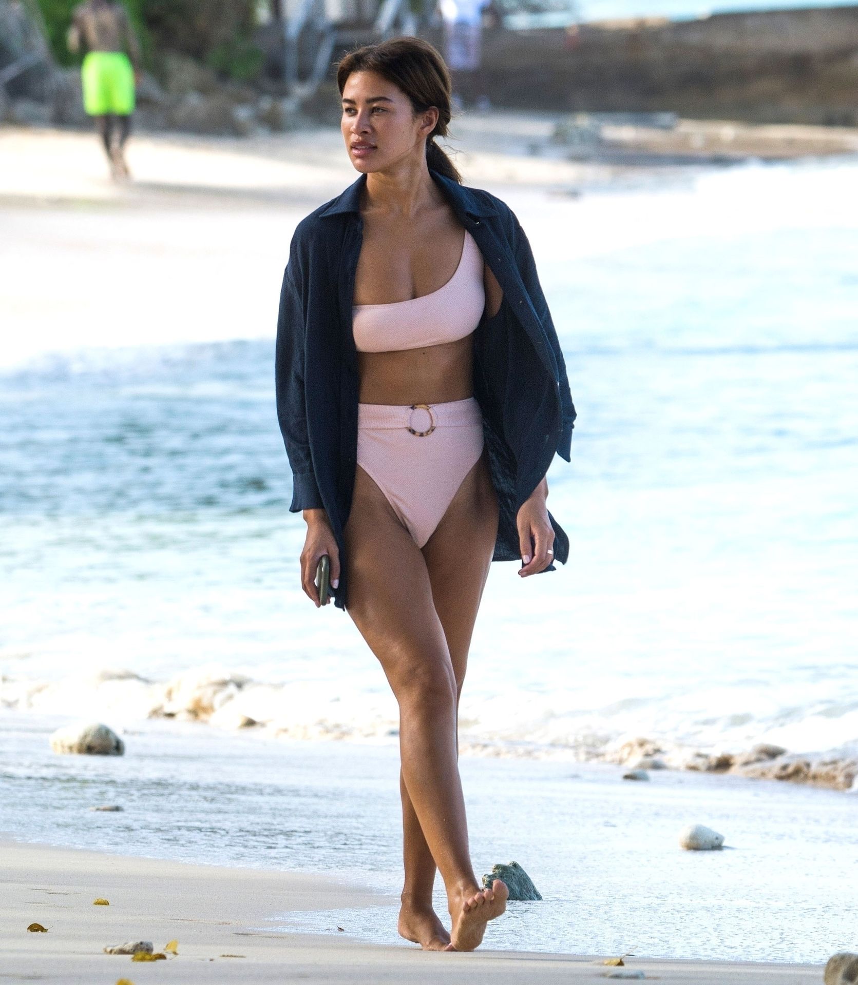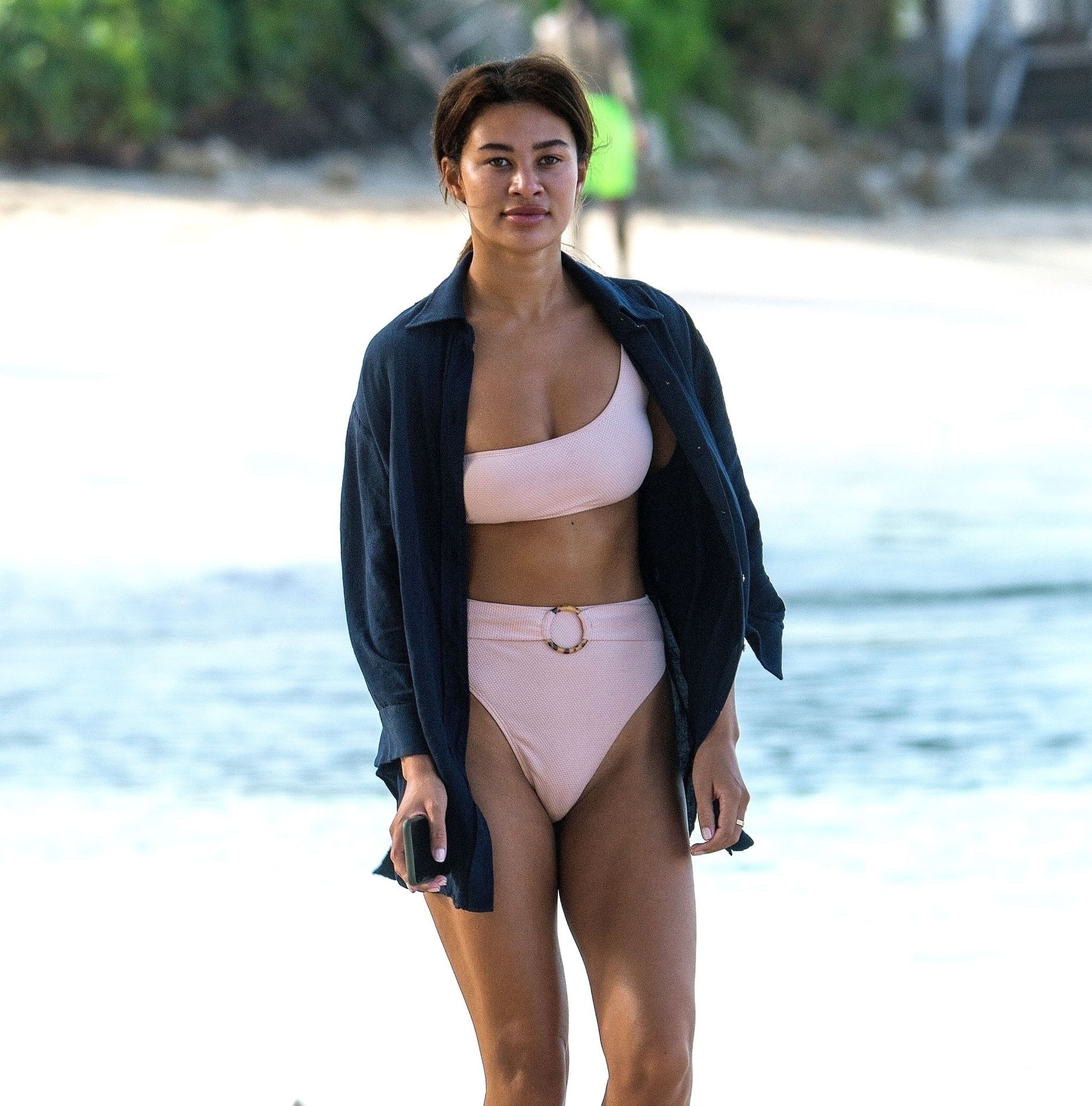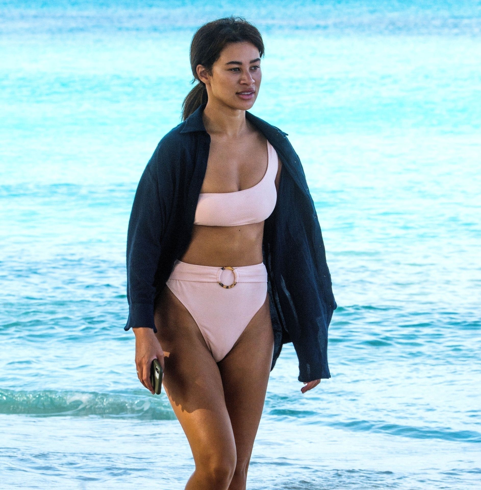 La exuberante Montana, quien apareció en nuestras pantallas en 2017 en el popular reality show de ITV Love Island, literalmente deslumbró en la playa de arena blanca mostrando su cuerpo de playa seductor y revelando sus abdominales marcados con su traje de baño rosa debajo de su camisa azul mientras la estrella brillaba en el paraíso caribeño.