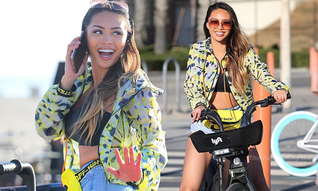 La modelo Montana Yao muestra sus piernas y glúteos sexys con shorts mientras monta una bicicleta en la playa de Santa Mónica.