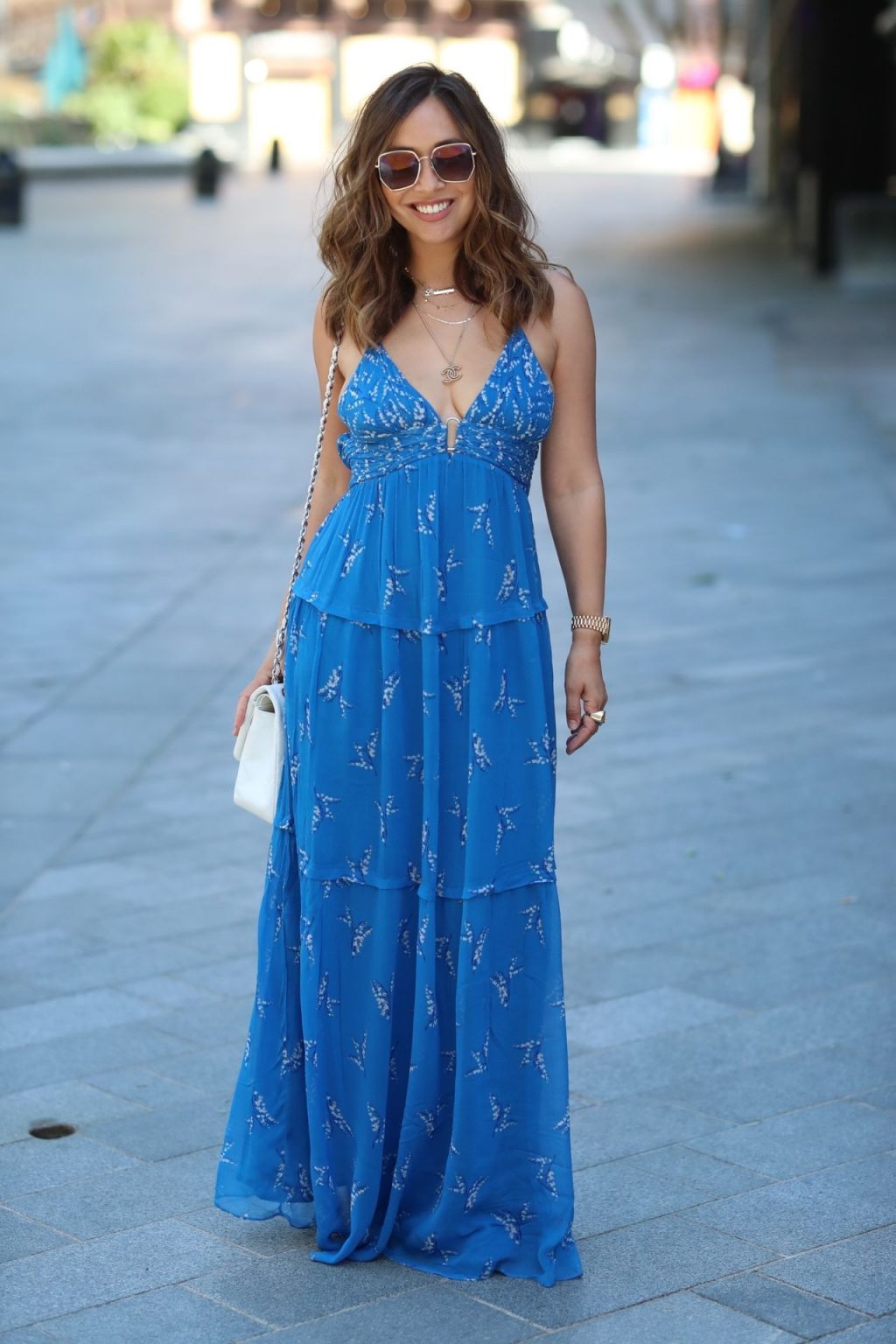 La cantante Myleene Klass llega a Smooth Radio con un vestido azul pronunciado, mostrando su escote en Londres, 01/06/2020.