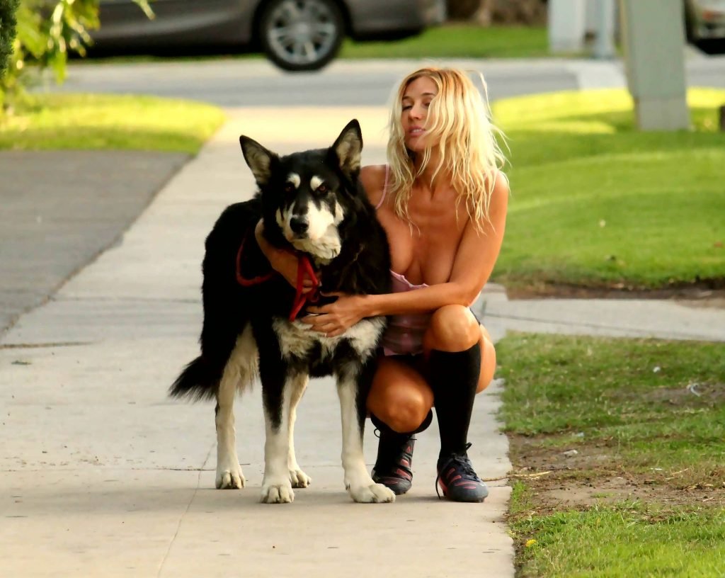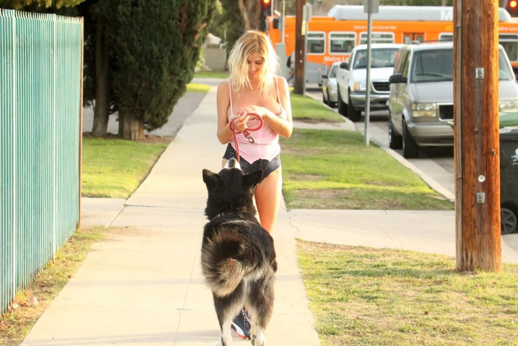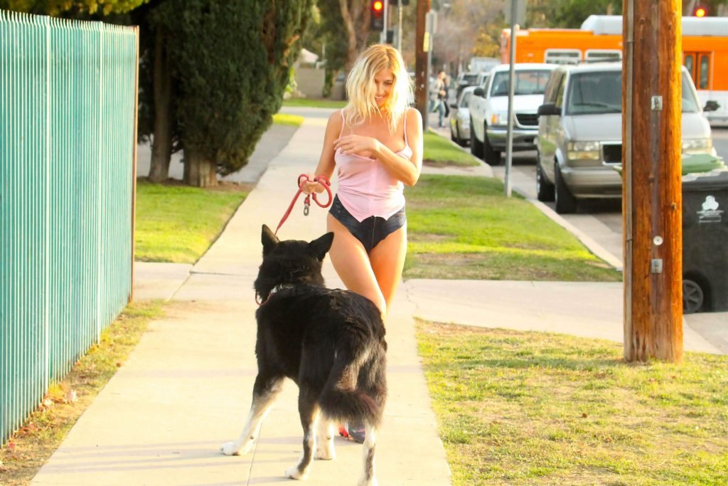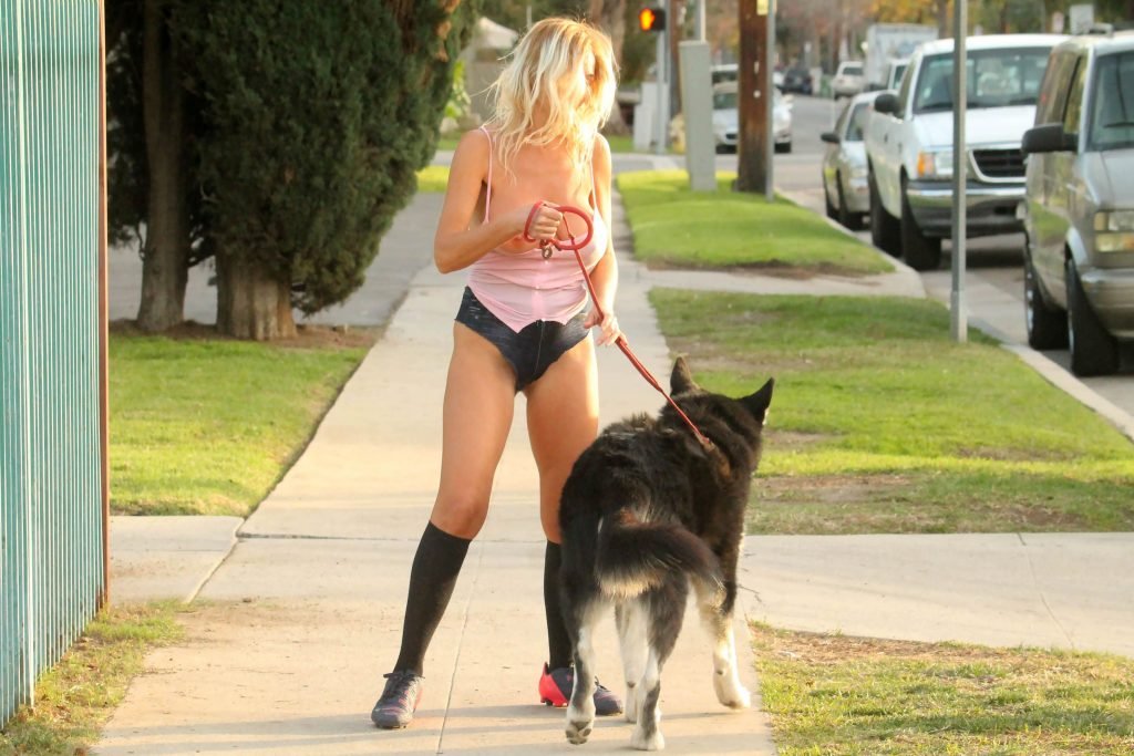 Cantante rusa Nadeea Volianova, 31, tiene problemas con su vestuario mientras pasea a su perro en Beverly Hills, 25/01/2018.