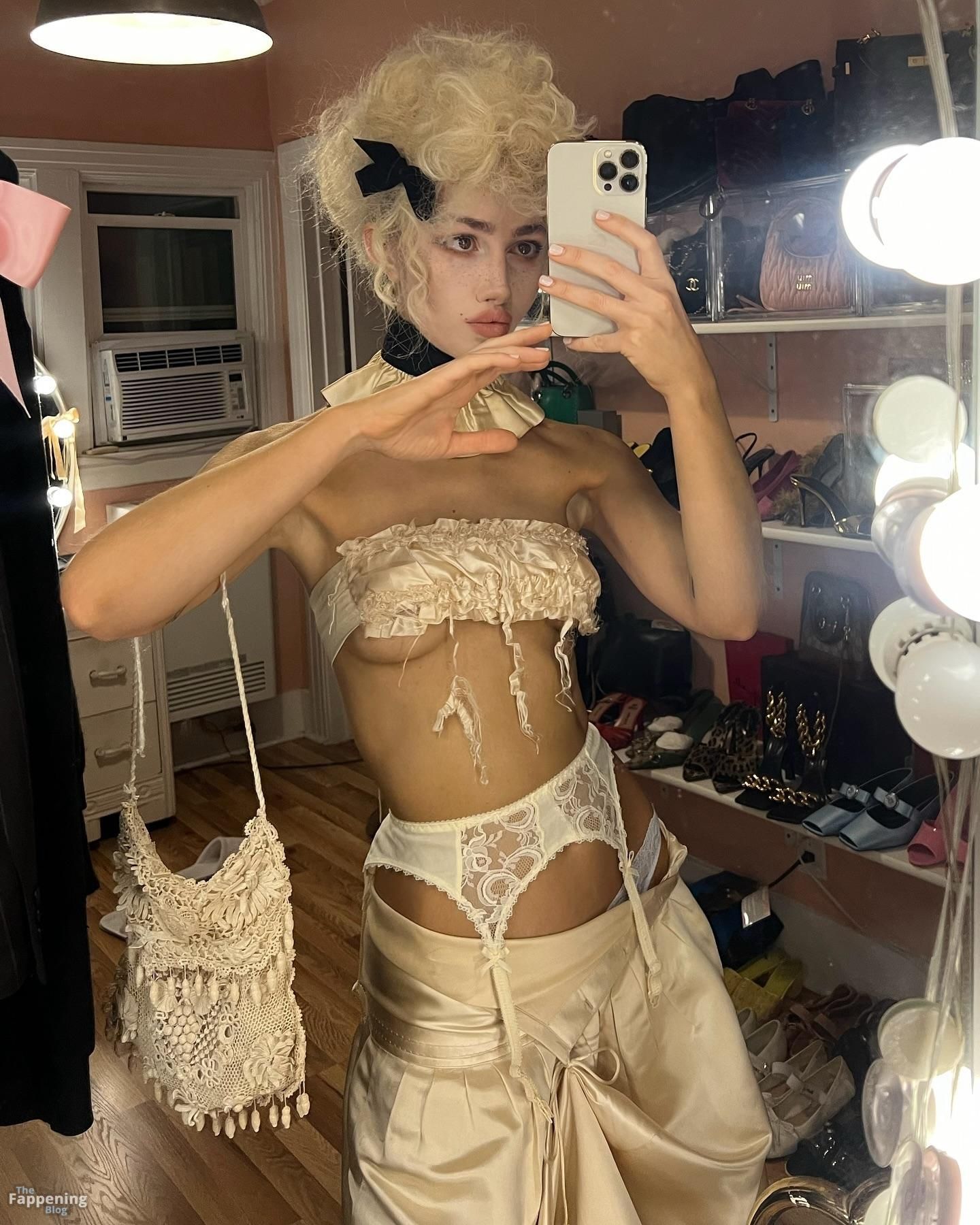Ella y su madre solían crear pequeños atuendos para su piedra de juguete, Bonting. Sí, lo leíste bien. ¿Su inspiración? Leyendas como David Lynch, John Waters y Stanley Kubrick. Nadia canaliza esa energía icónica en su propia estética salvaje e inspirada en el retro.