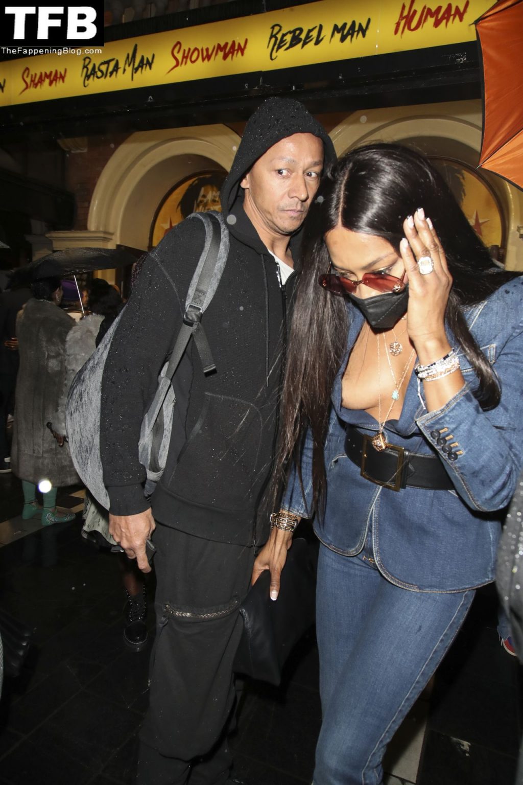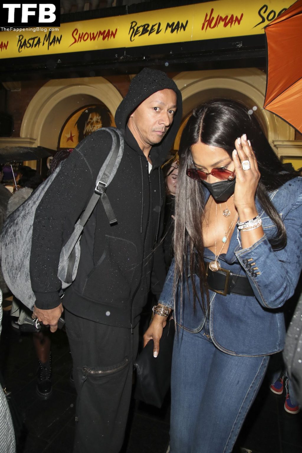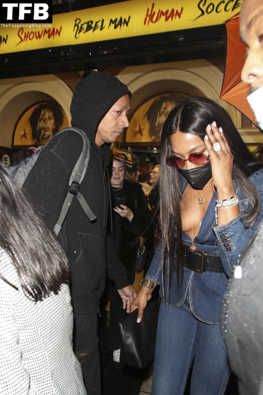 La famosa modelo Naomi Campbell sufre un fallo de vestuario mientras salía de “¡Levántate y Lucha! El Musical de Bob Marley” en el Teatro Lyric de Londres, 21/10/2021.