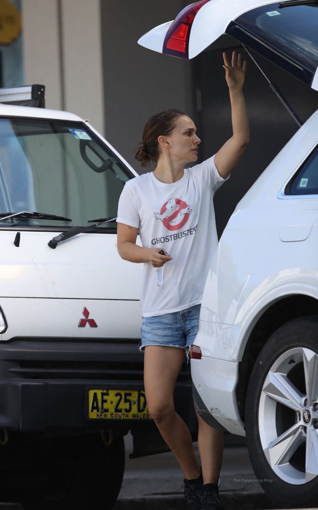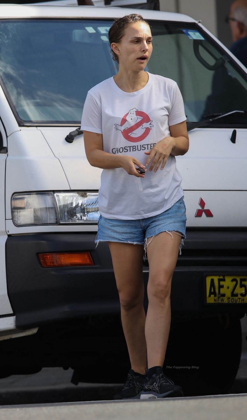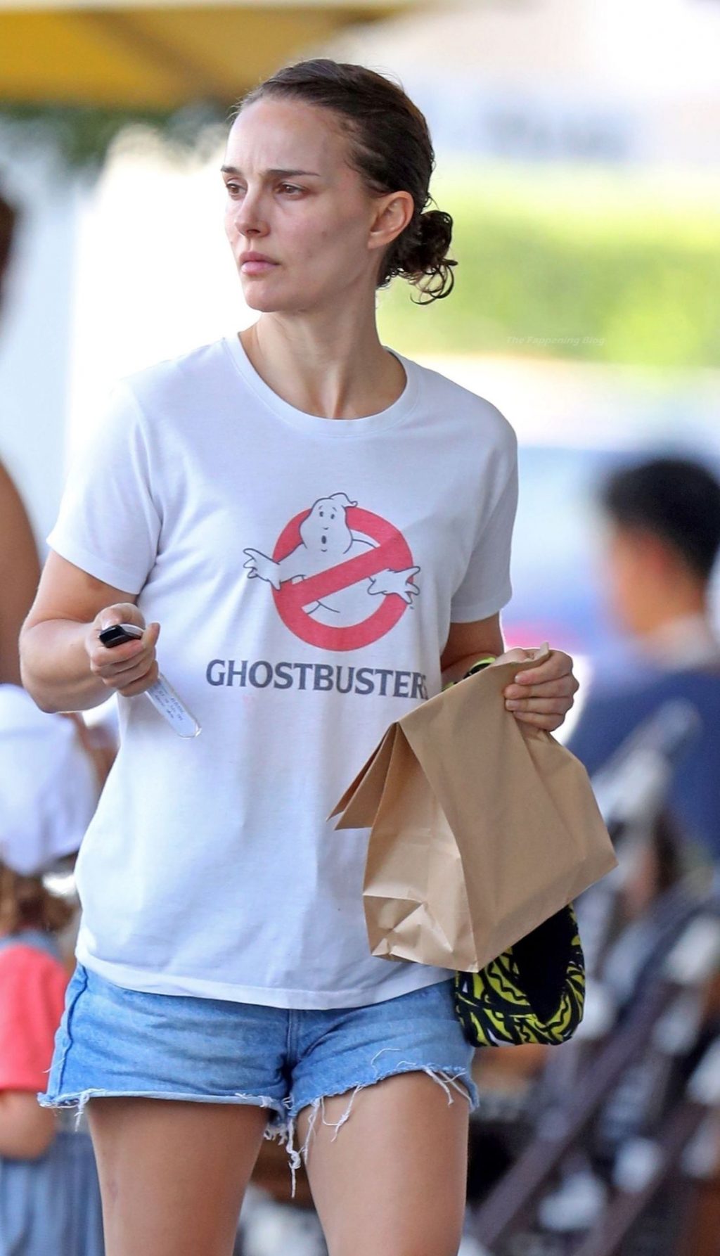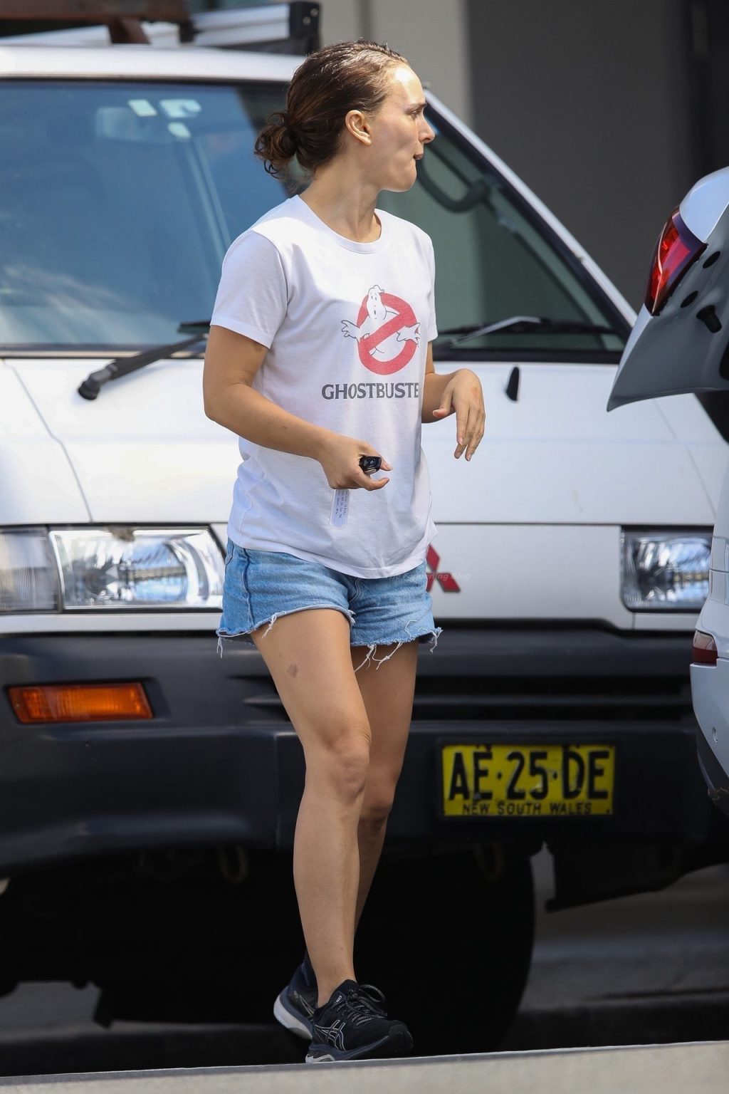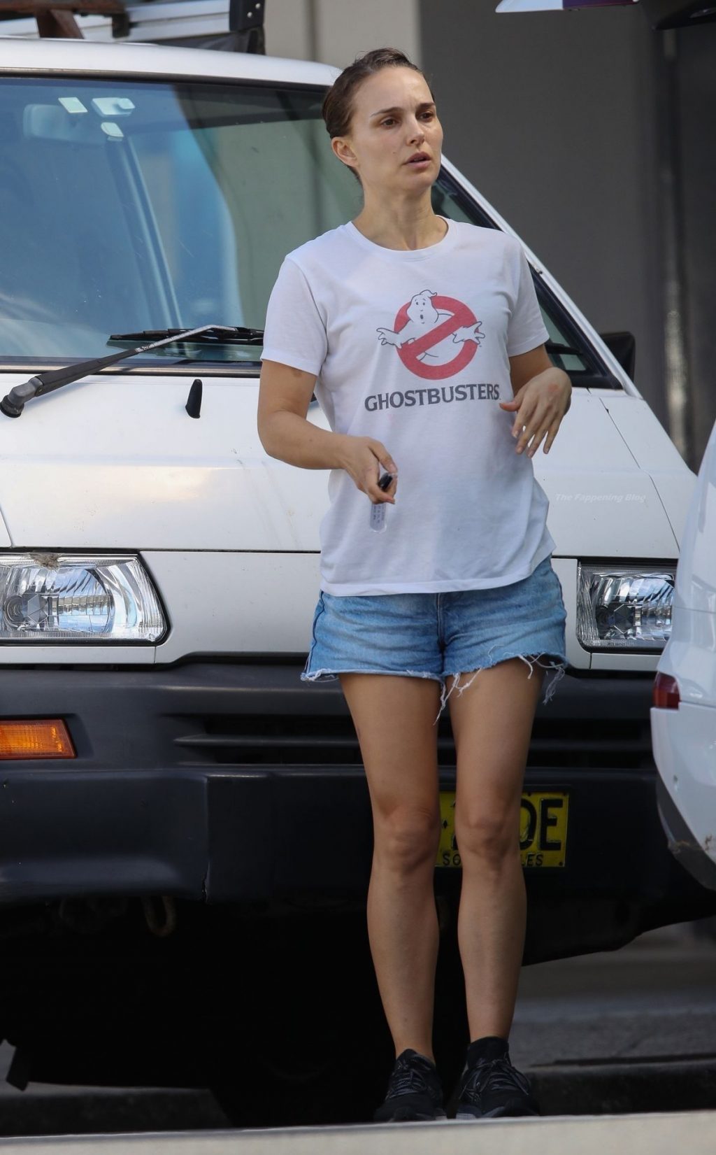 ¡A quién vas a llamar! La actriz Natalie Portman luce casualmente a la moda mientras es fotografiada haciendo algunos recados en Sídney, vistiendo una genial camiseta de Cazafantasmas con shorts de mezclilla y una riñonera amarilla y negra estampada.