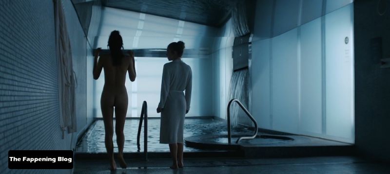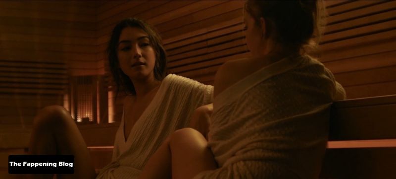 Natasha Liu Bordizzo is disrobing to go naked, showing her butt from behind as she hangs up the robe and then steps into a bath at a spa, accompanied by Sydney Sweeney. Natasha then watches as Sydney also disrobes, showing side boob from behind.
