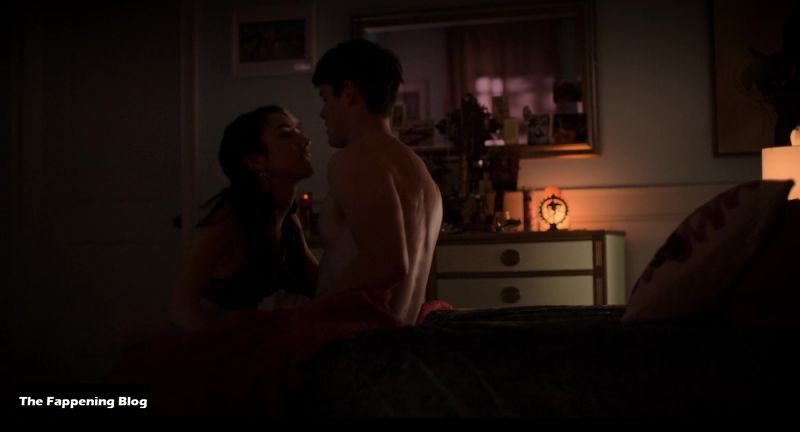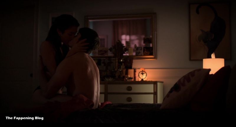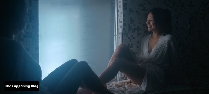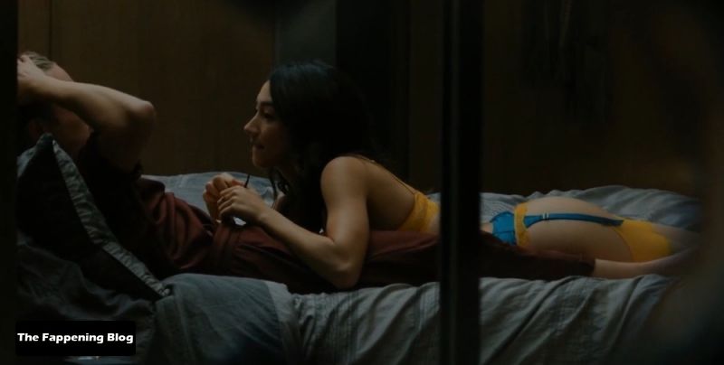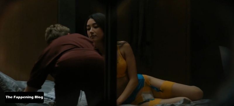 Natasha Liu Bordizzo is walking into a bedroom in some sexy lingerie consisting of a golden bra and panties along with a blue garter belt. She joins a guy in bed, laying down in his lap as we see some of her butt from the side in her thong panties. She tries to seduce the guy, but he leaves the room and Natasha lays down on her back on the bed.