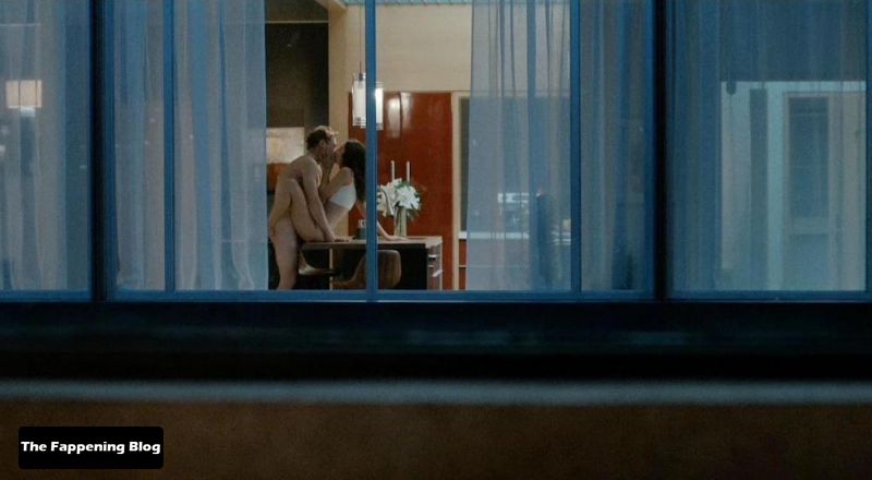 Natasha Liu Bordizzo is being watched through an apartment window as a guy drops her skirt, revealing blue thong panties. The guy then carries her to a kitchen and places her on the island, lifting her hips to show her butt from the side as he slides her panties off and then has sex with her while standing between her legs.