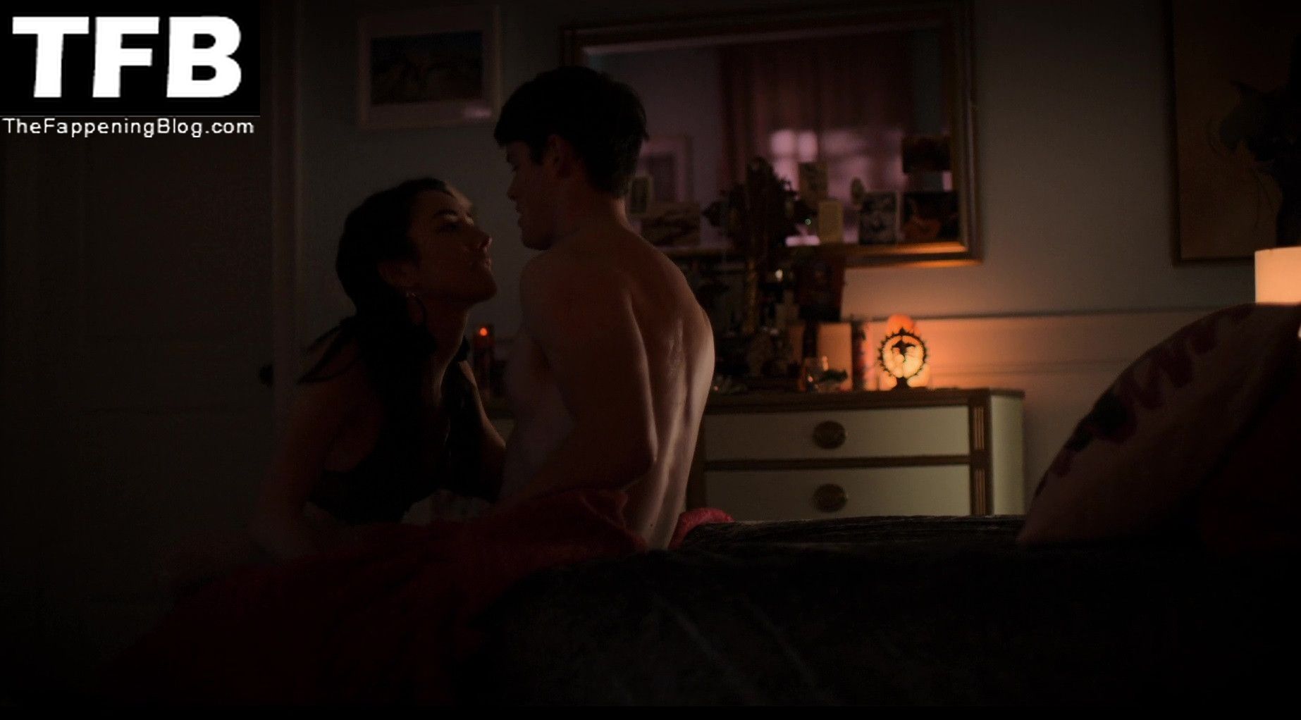 Natasha Liu Bordizzo is walking into a bedroom in some sexy lingerie consisting of a golden bra and panties along with a blue garter belt. She joins a guy in bed, laying down in his lap as we see some of her butt from the side in her thong panties. She tries to seduce the guy, but he leaves the room and Natasha lays down on her back on the bed.
