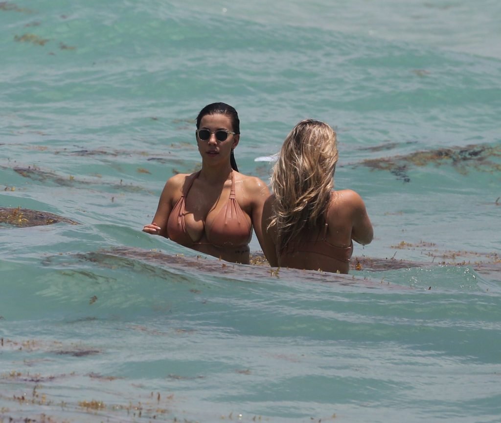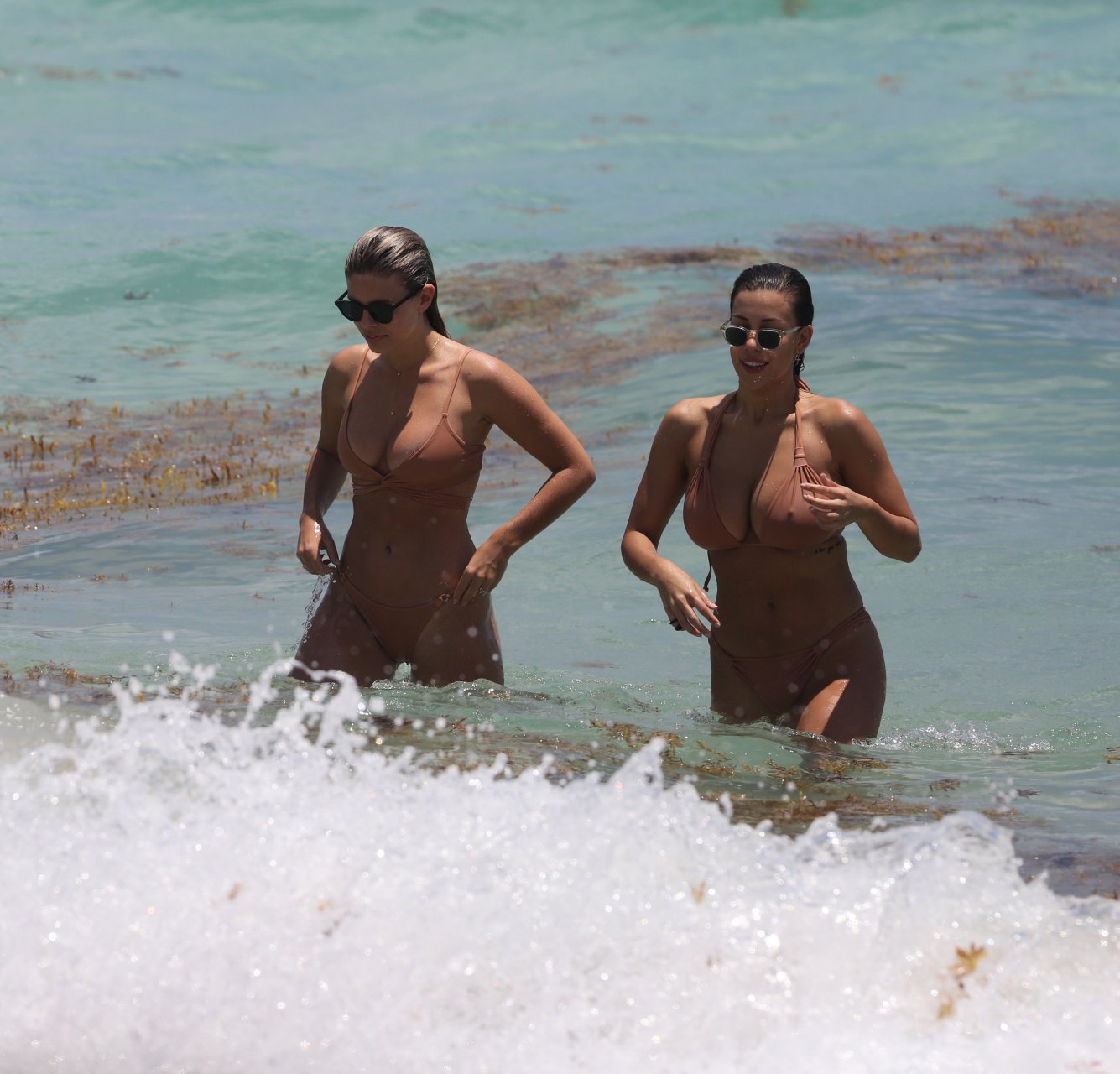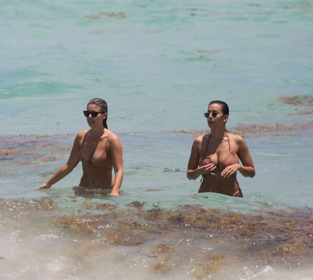 Modelos voluptuosas y atractivas Natasha Oakley y Devin Brugman disfrutan un día en bikinis color nude en la playa de Miami, 04/05/2017.