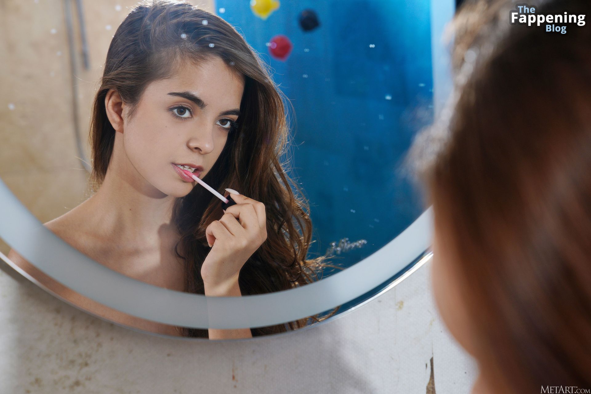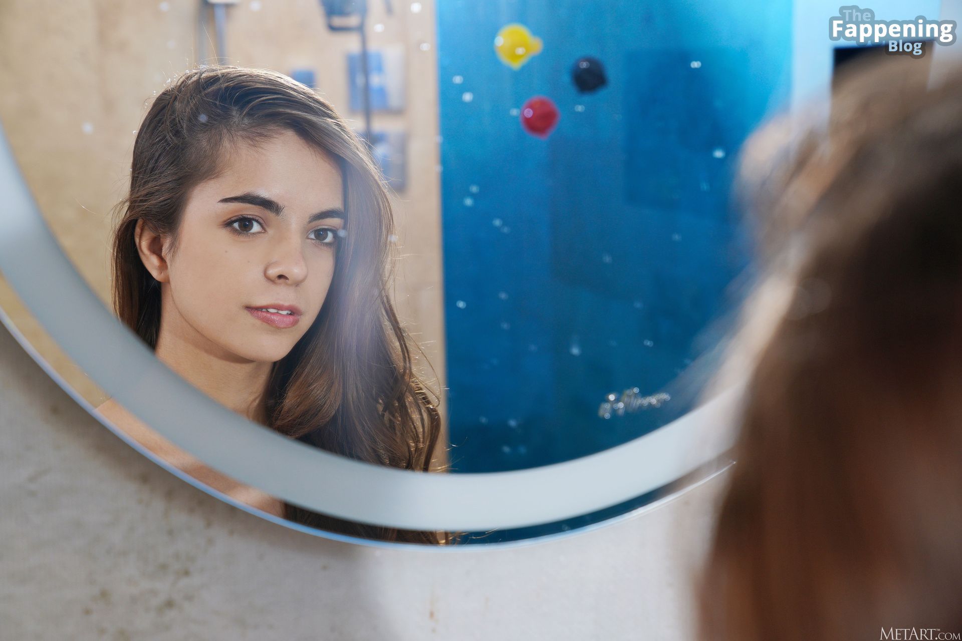 Fotos de la modelo adulta petite Nessa posando completamente desnuda y descalza en el baño. Nessa, nacida en 2001, es una modelo que te sorprenderá con su baja estatura de solo 1,52 m.