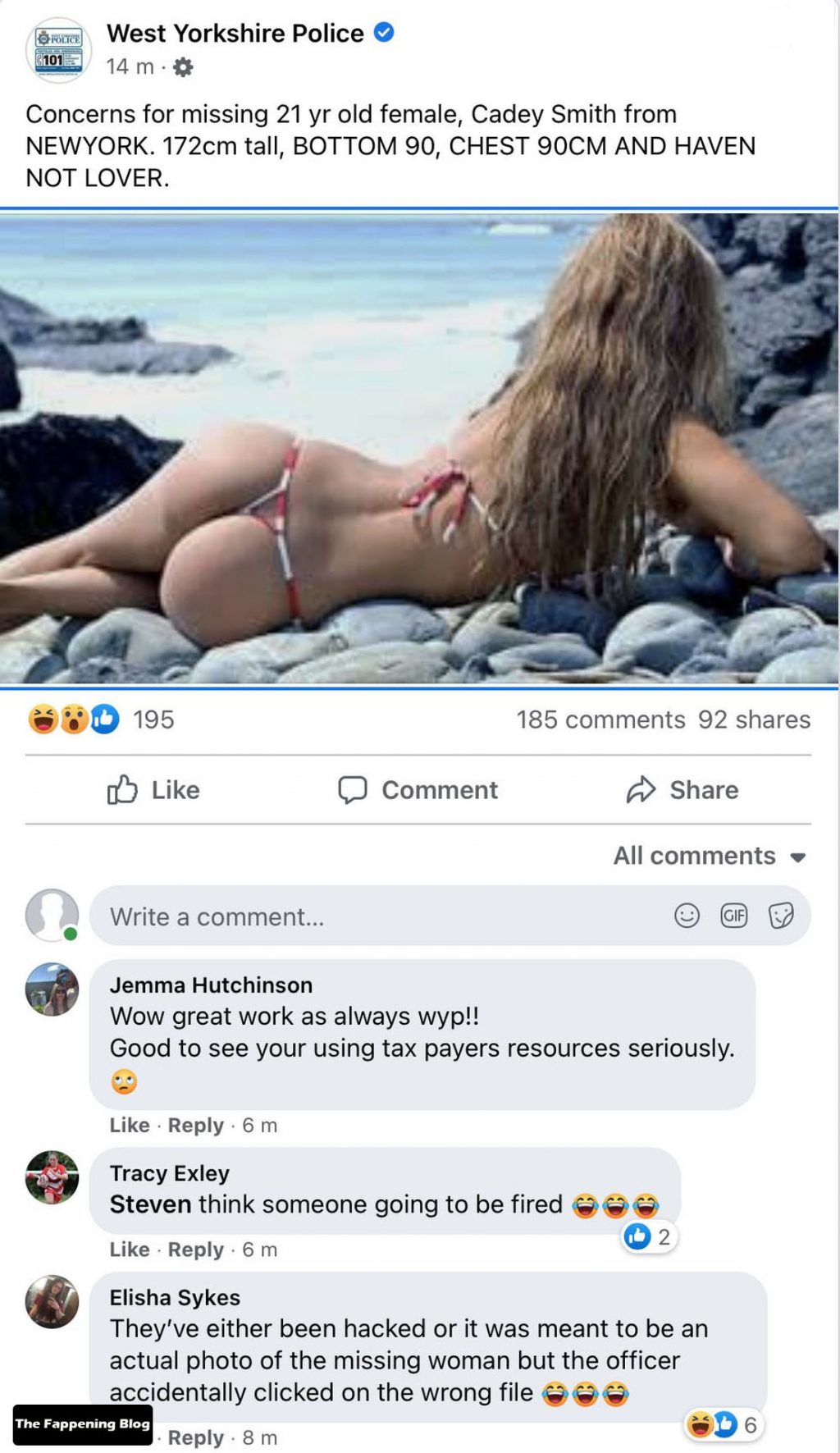 La página oficial de Facebook de la Policía de West Yorkshire fue hackeada por bromistas que publicaron una imagen de una mujer escasamente vestida con bikini en una broma de personas desaparecidas esta mañana.
