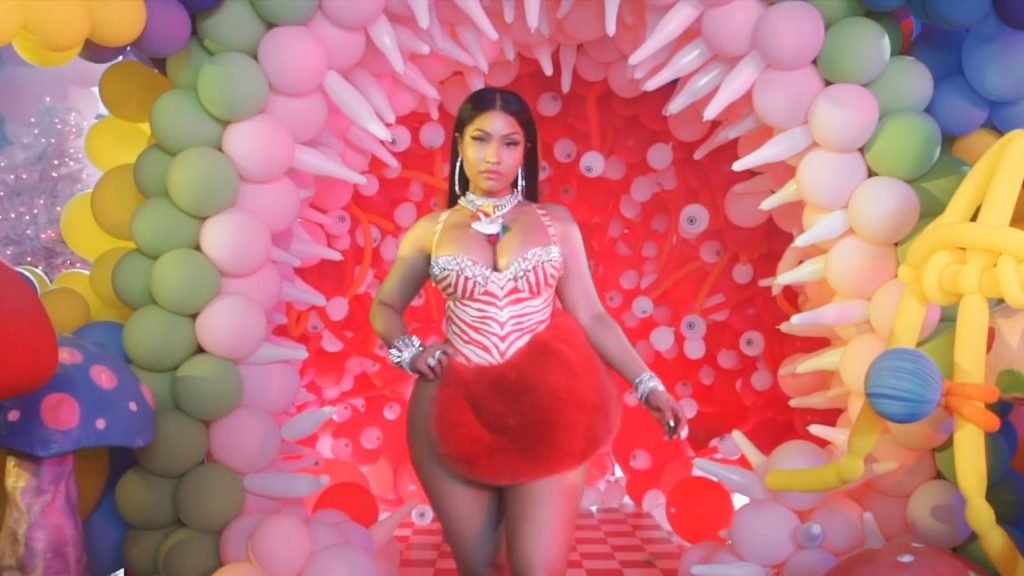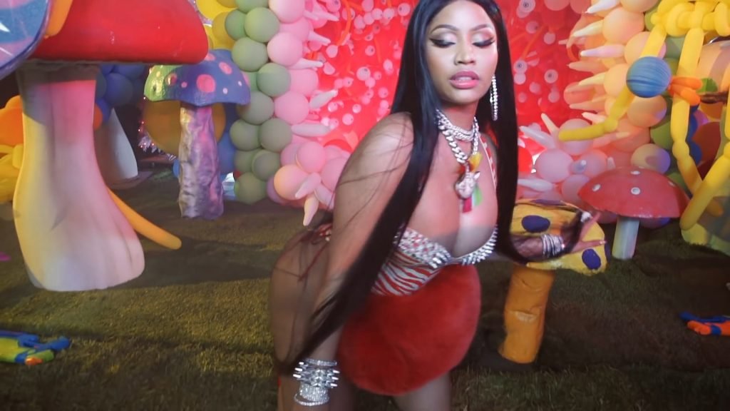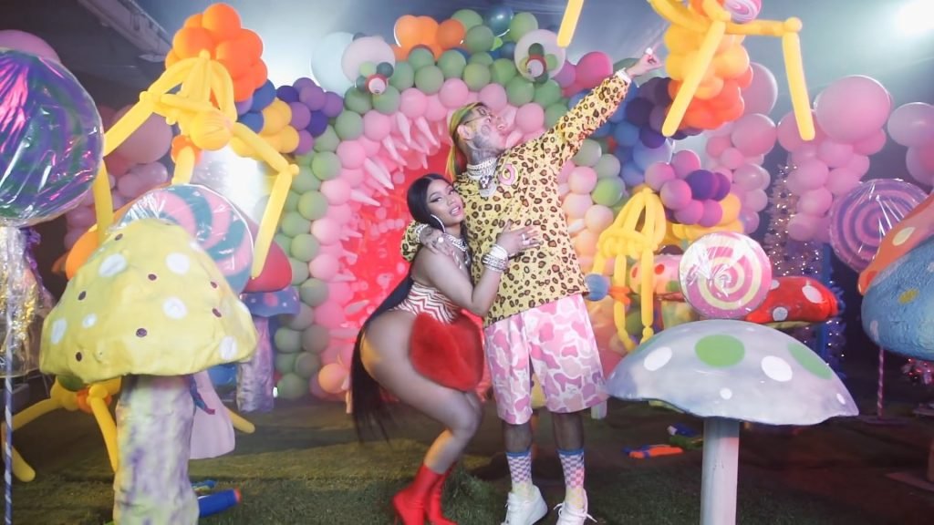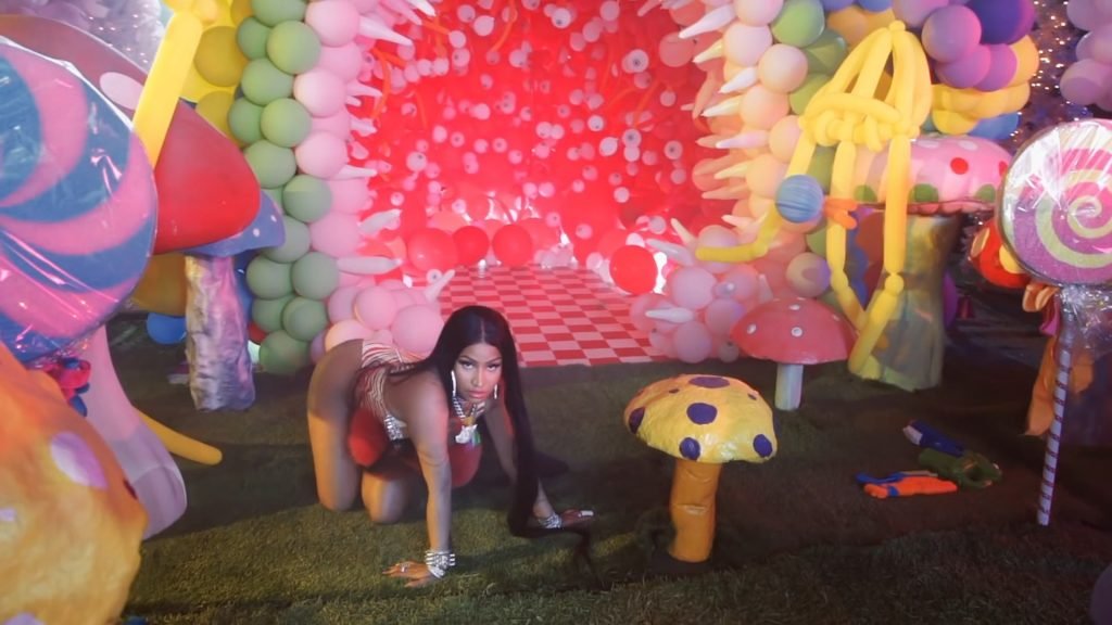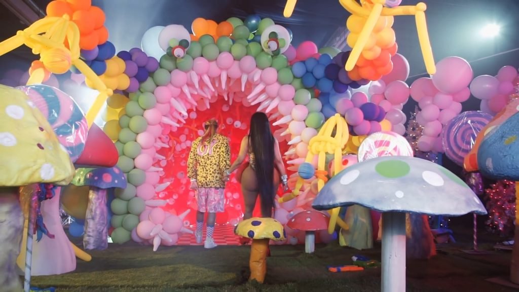 En tres minutos, los raperos comen helado, juegan con pistolas de agua, bailan junto a hongos gigantes y presumen de numerosas decoraciones.