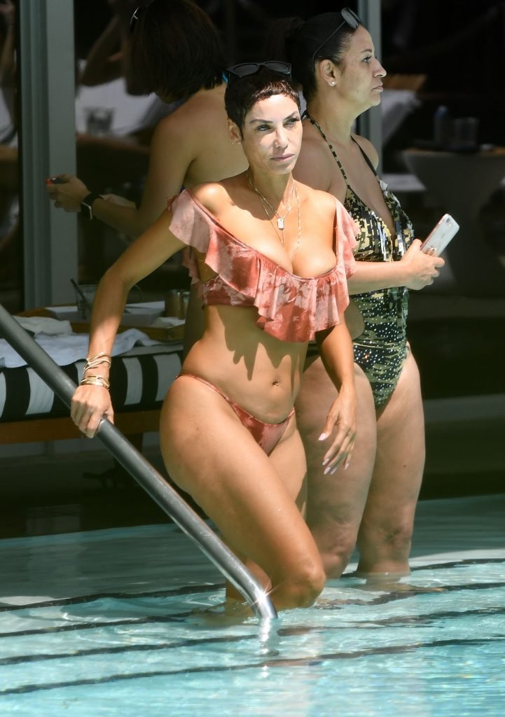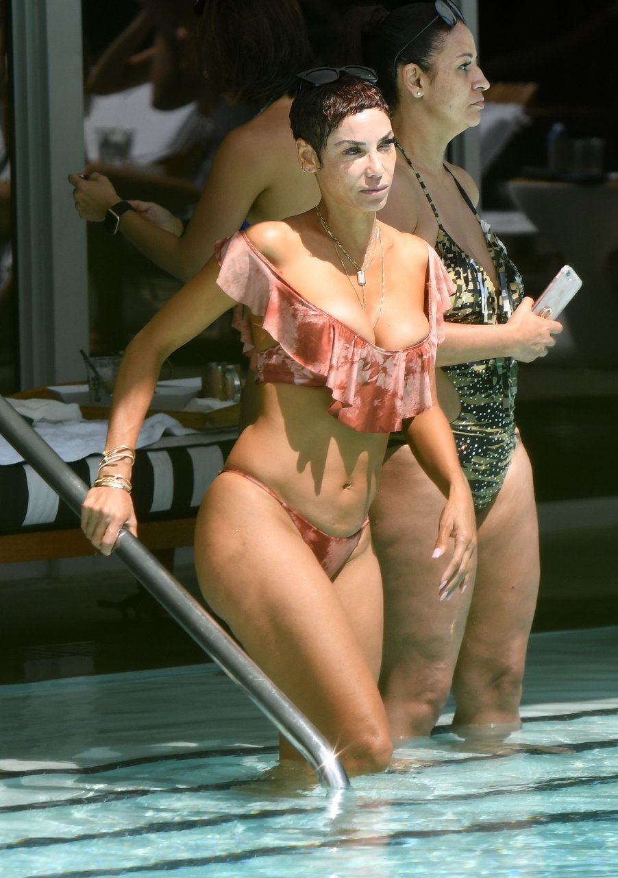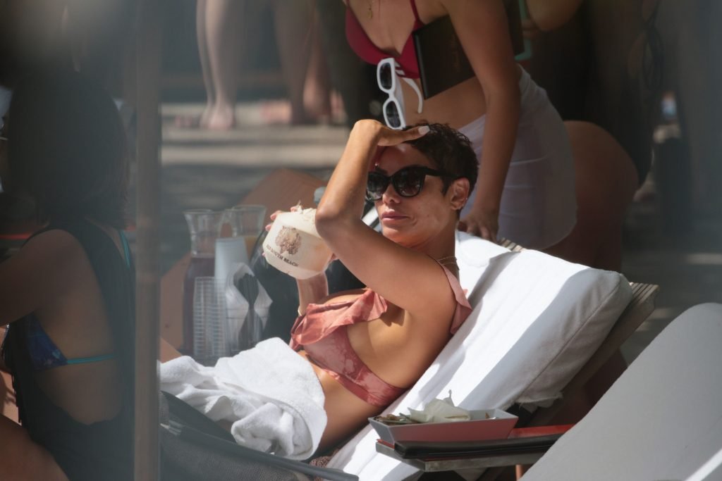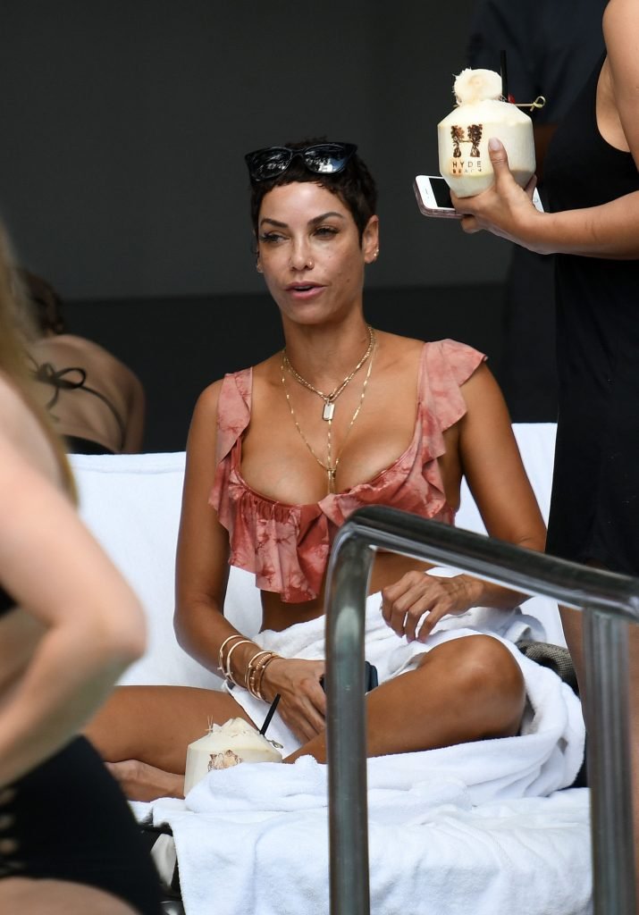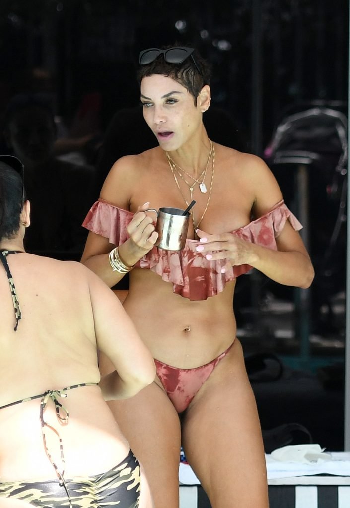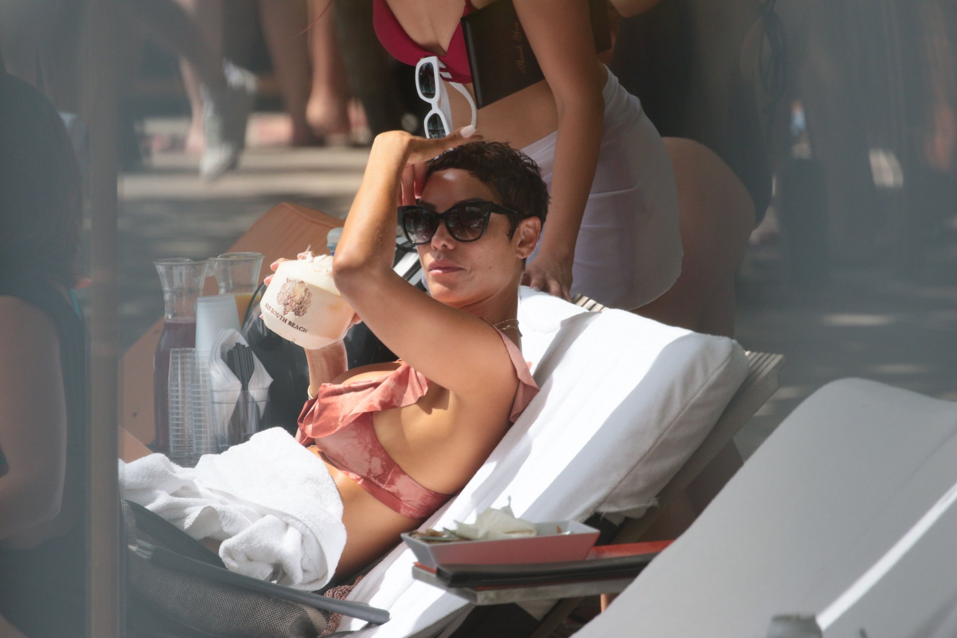 La actriz y modelo Nicole Murphy lleva un bikini rosa mientras se relaja junto a la piscina en Miami Beach, 11/03/2018.