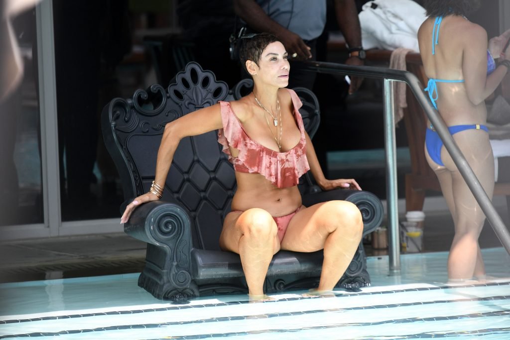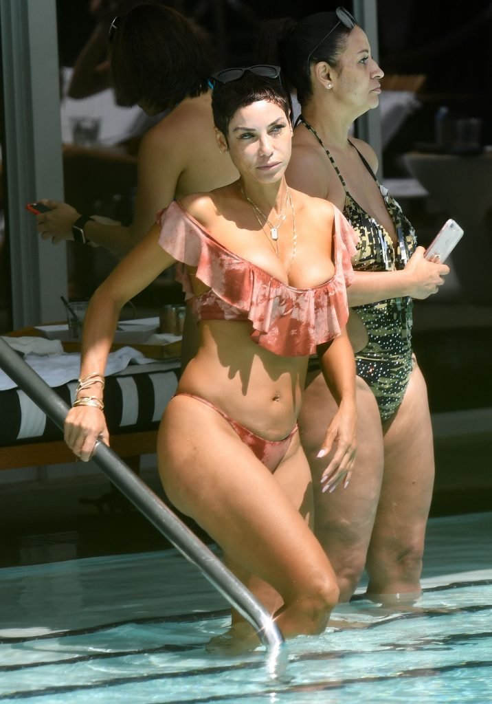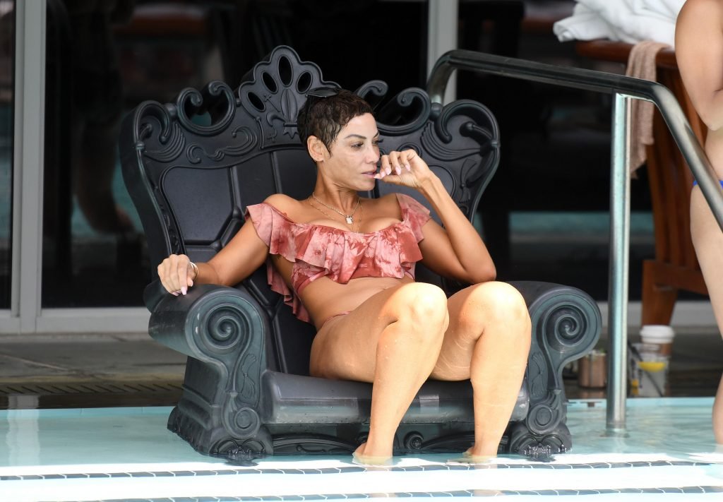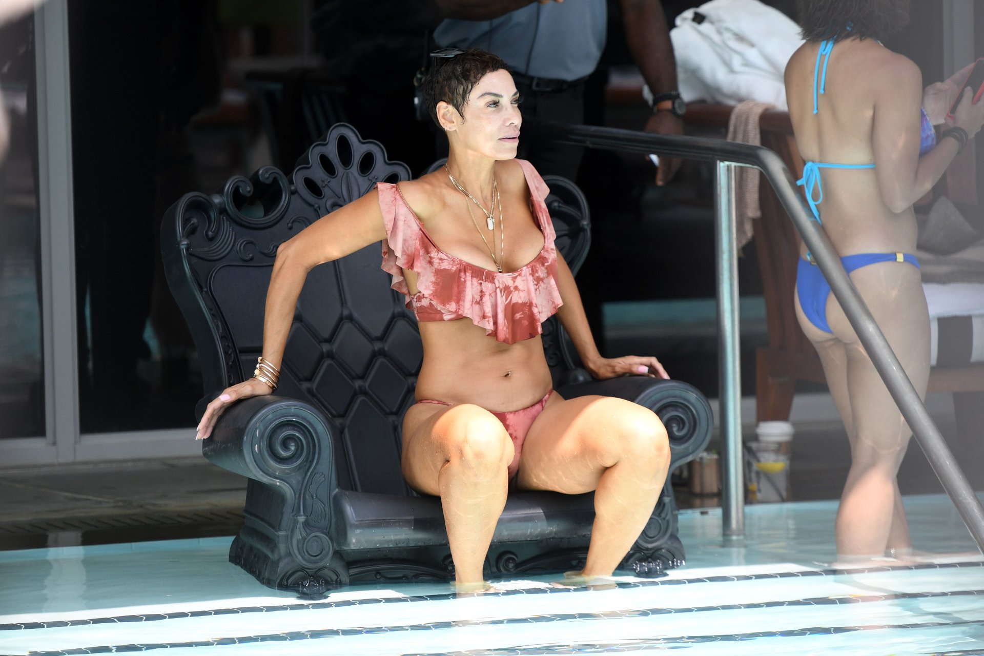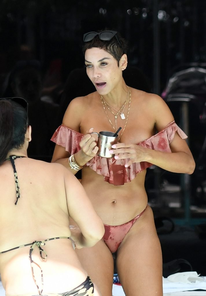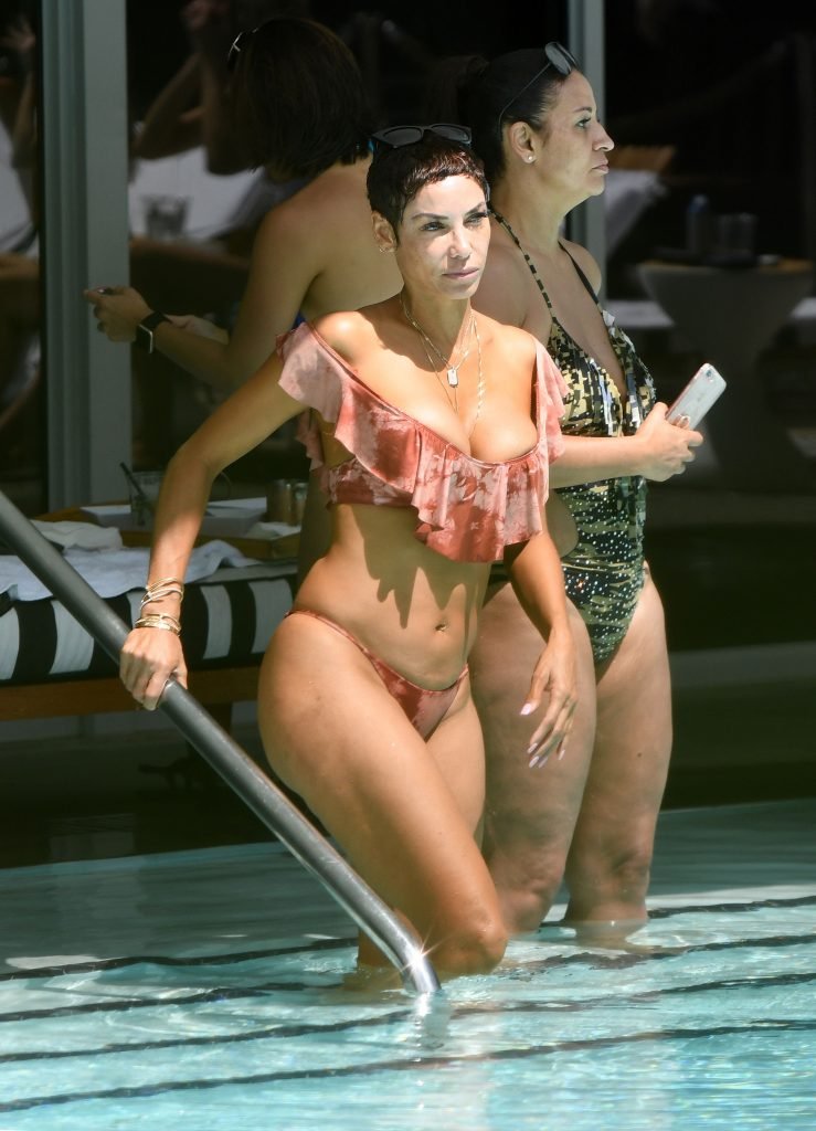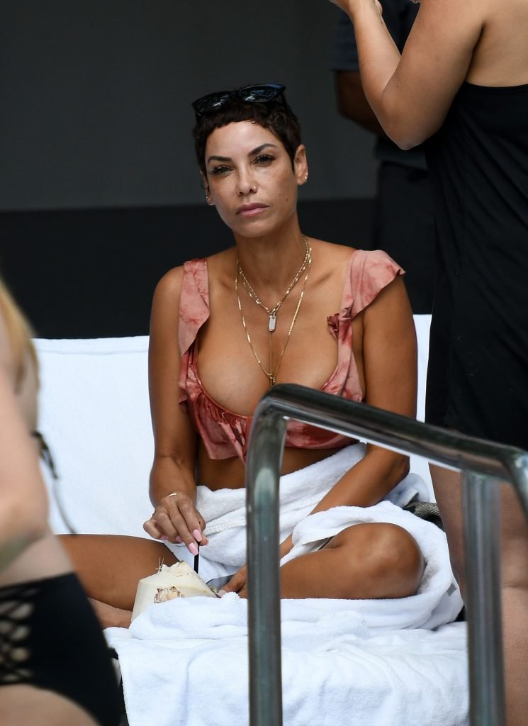 La actriz y modelo Nicole Murphy lleva un bikini rosa mientras se relaja junto a la piscina en Miami Beach, 11/03/2018.