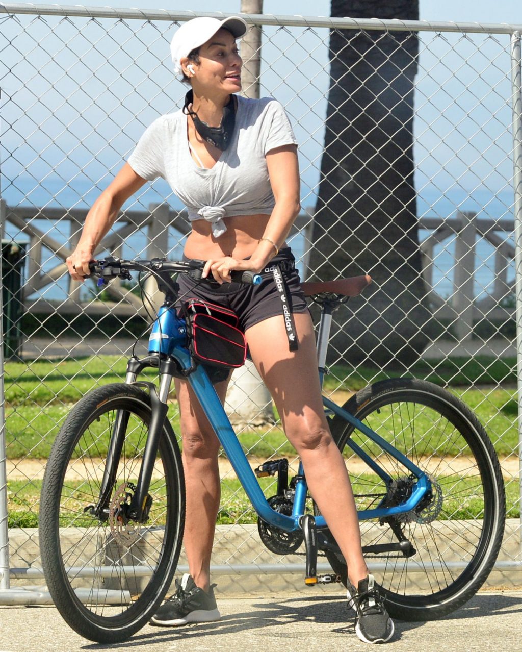 Nicole Murphy, la exesposa del comediante Eddie Murphy, muestra sus abdominales tonificados mientras es vista montando su bicicleta con una amiga en Santa Mónica durante el confinamiento por el Coronavirus, 25/04/2020.
