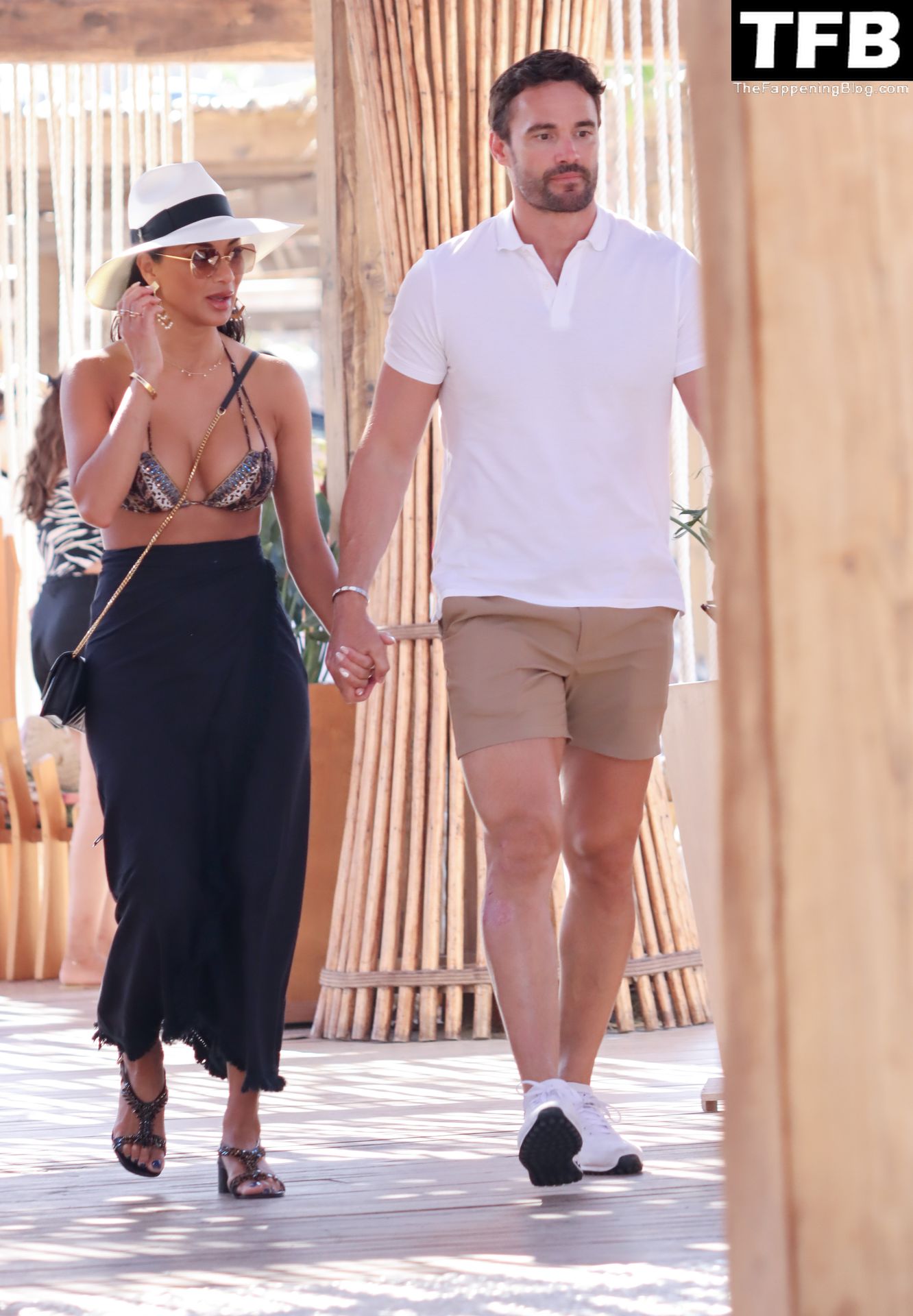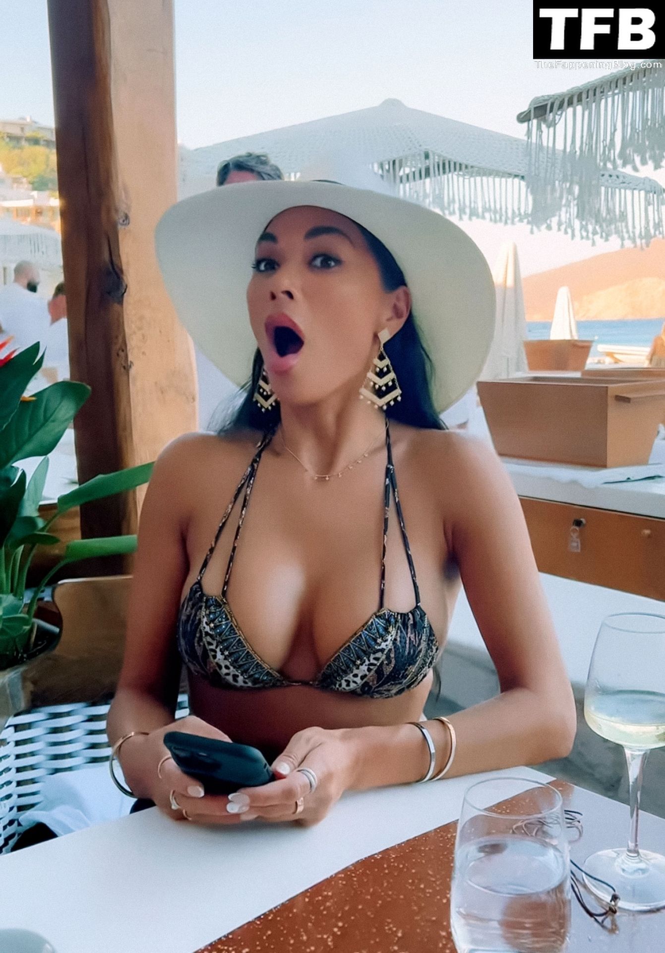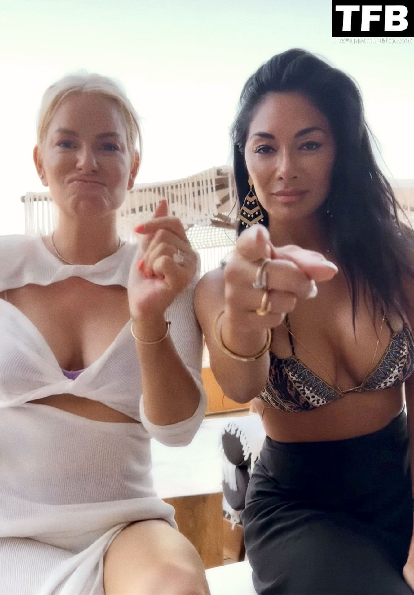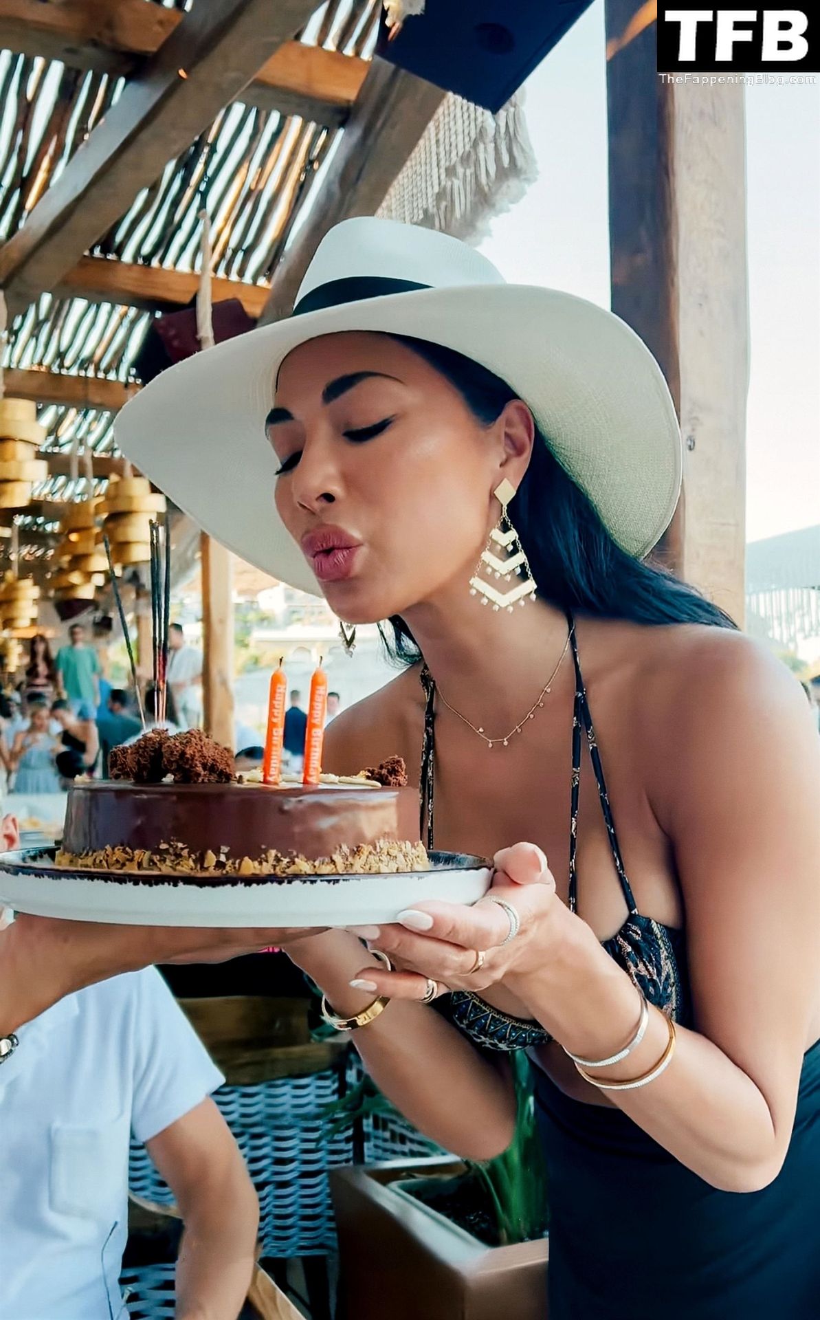 Cantante y estrella de The Fappening Nicole Scherzinger continúa su celebración de cumpleaños mientras se toca el escote bailando su nueva canción The Drop con la amiga Caroline Stanbury en Mykonos, 07/02/2022.