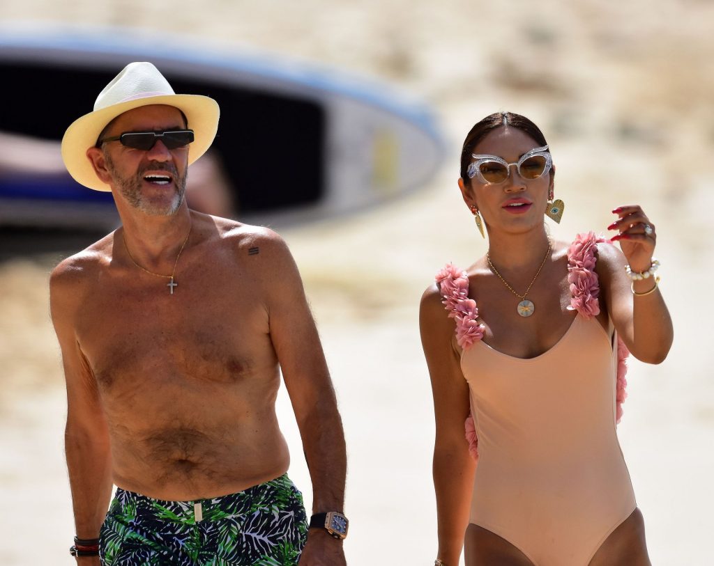 Duncan Bannatyne, 70, y su esposa Nigora, 39, muestran afecto en público y se toman de la mano durante un paseo romántico por la playa en Barbados, 26/12/2019.